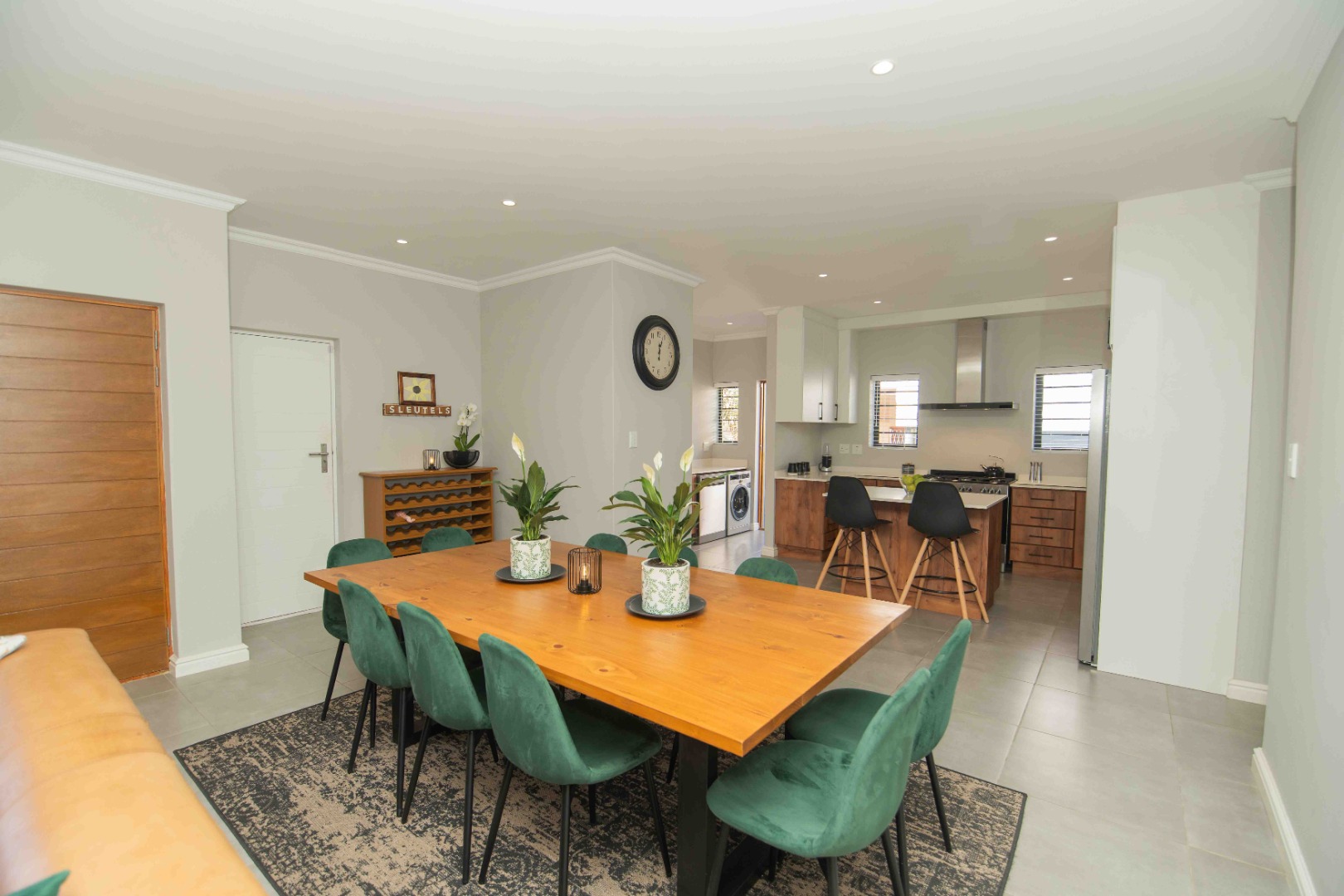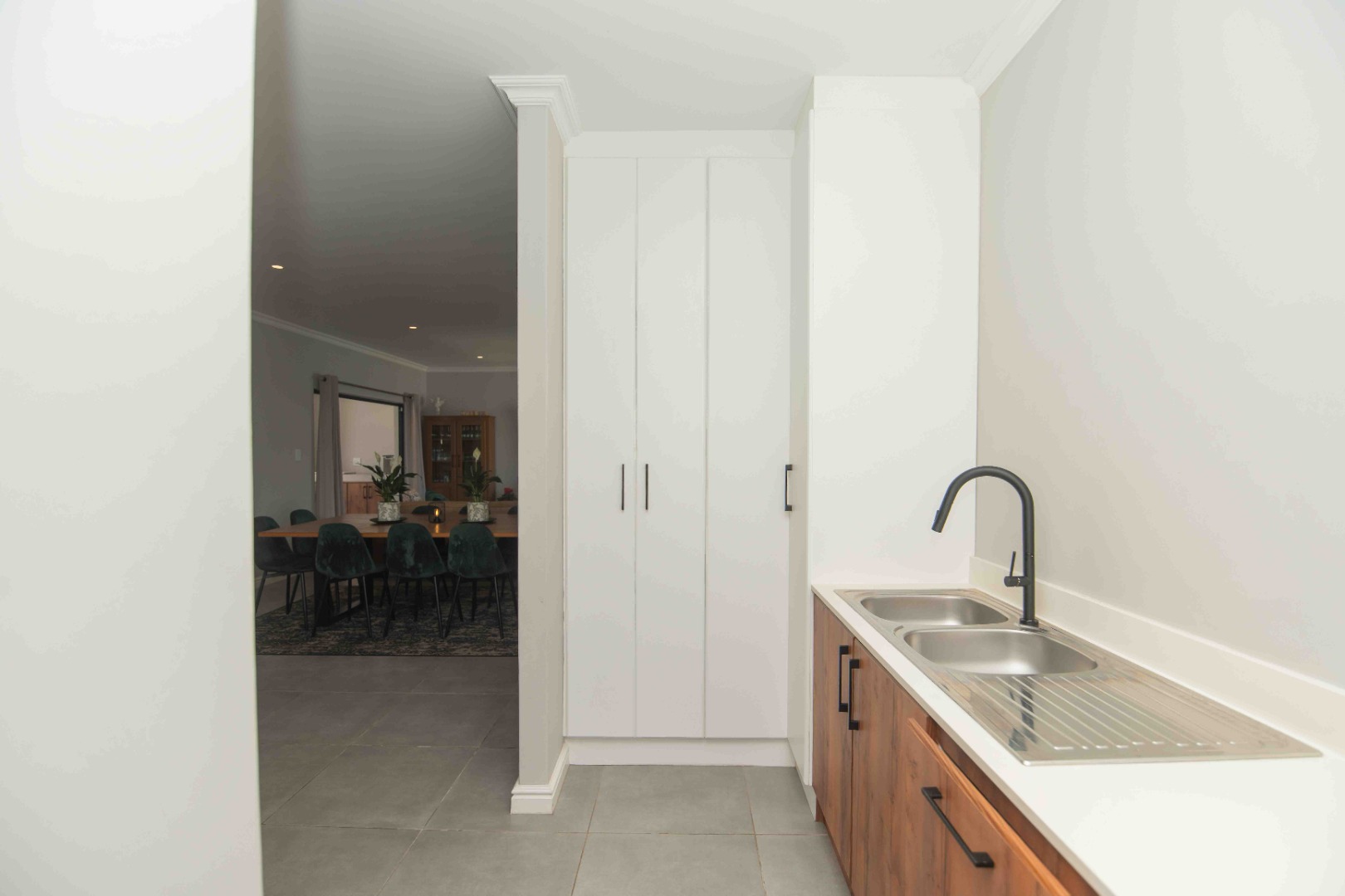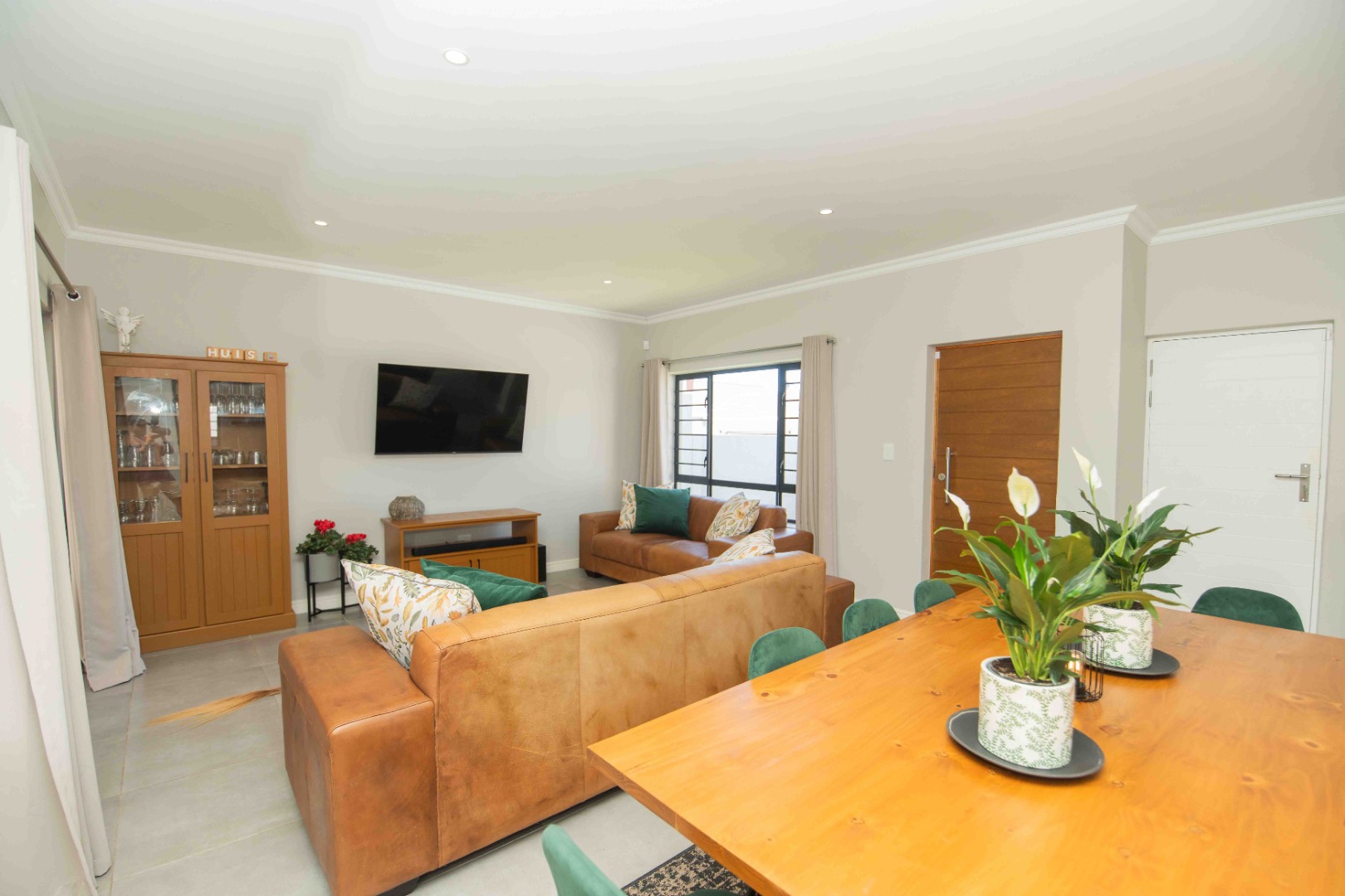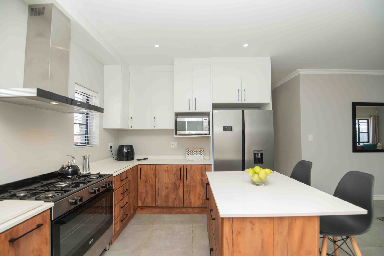 At the heart of the home, a beautifully appointed open-plan kitchen with scullery combine form and function, featuring a freestanding oven with gas hob and modern quartz counters throughout. Perfectly suited to both everyday living and stylish entertaining. The adjoining living areas extend effortlessly onto a covered verandah with a built-in braai, creating a seamless indoor/outdoor lifestyle ideal for year-round enjoyment.