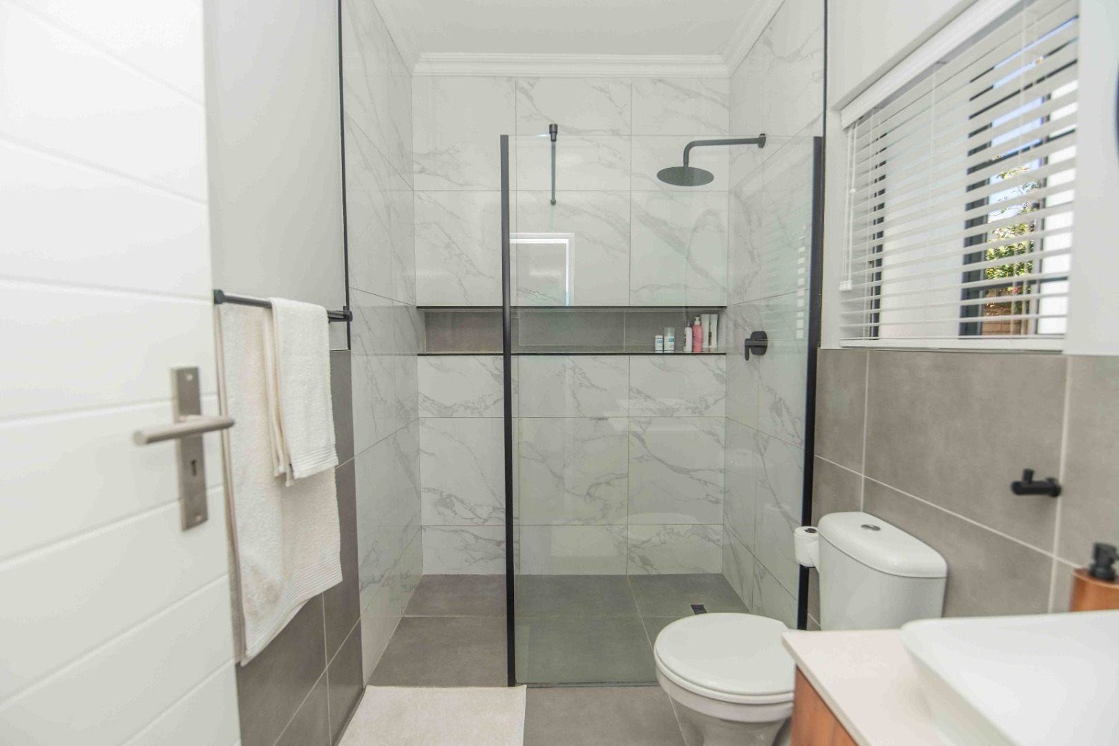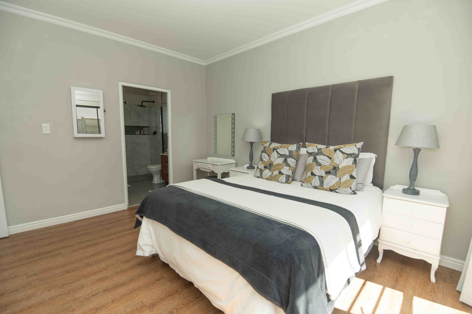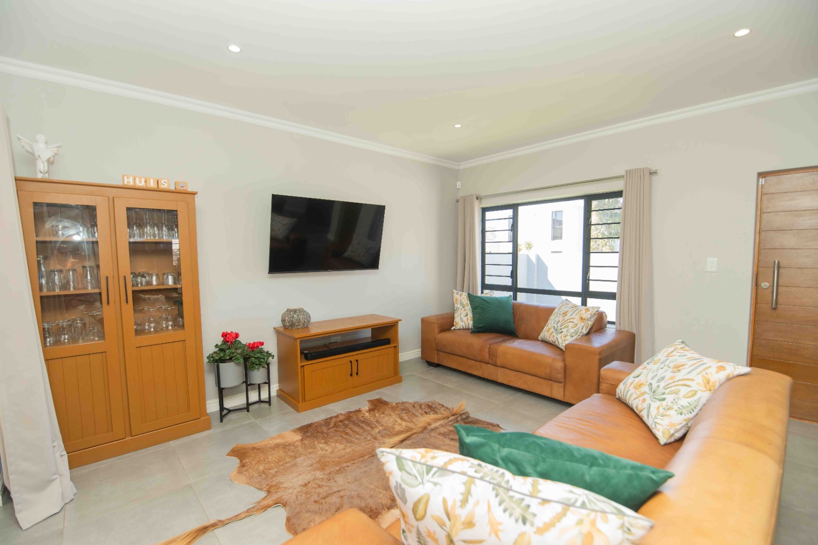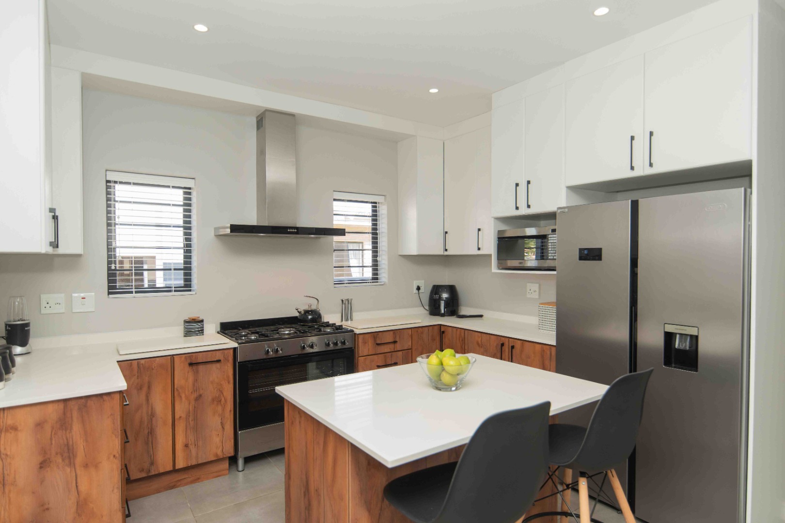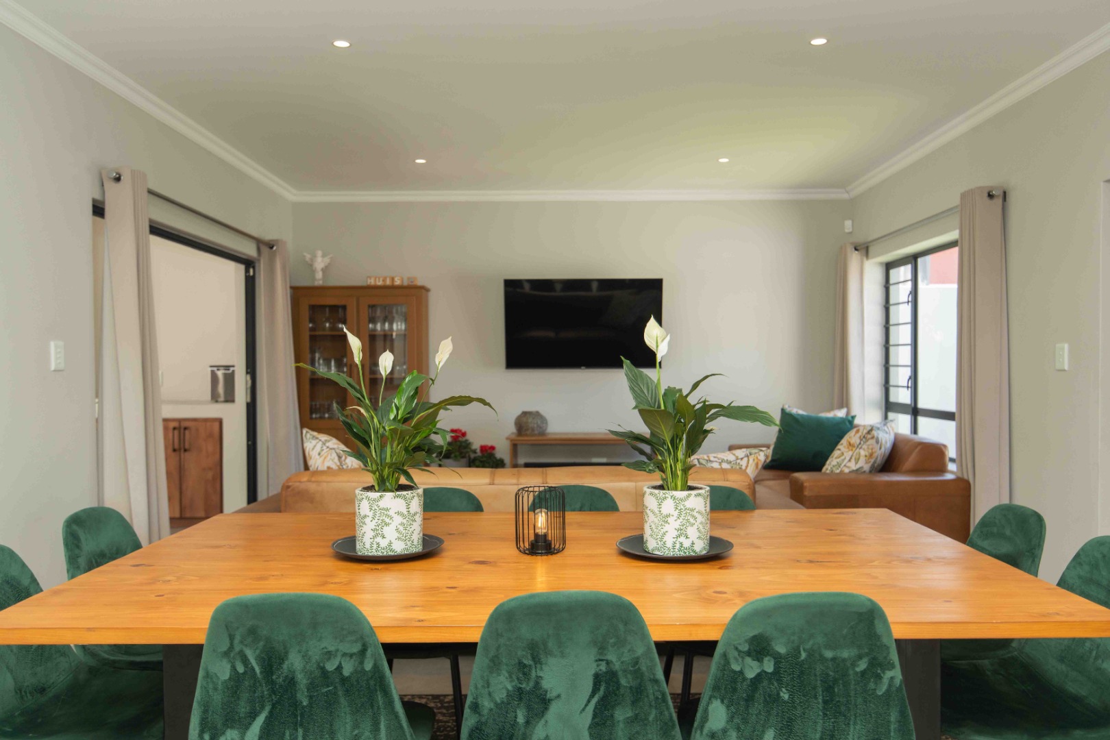 At the heart of the home, a beautifully appointed open-plan kitchen with scullery combine form and function, featuring a freestanding oven with gas hob and modern quartz counters throughout. Perfectly suited to both everyday living and stylish entertaining. The adjoining living areas extend effortlessly onto a covered verandah with a built-in braai, creating a seamless indoor/outdoor lifestyle ideal for year-round enjoyment.