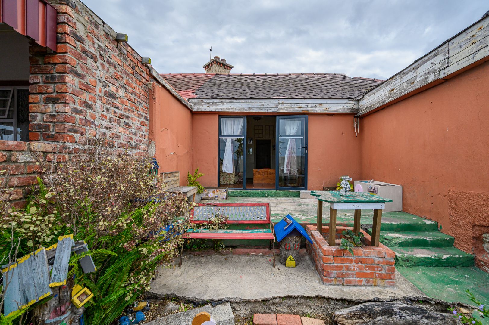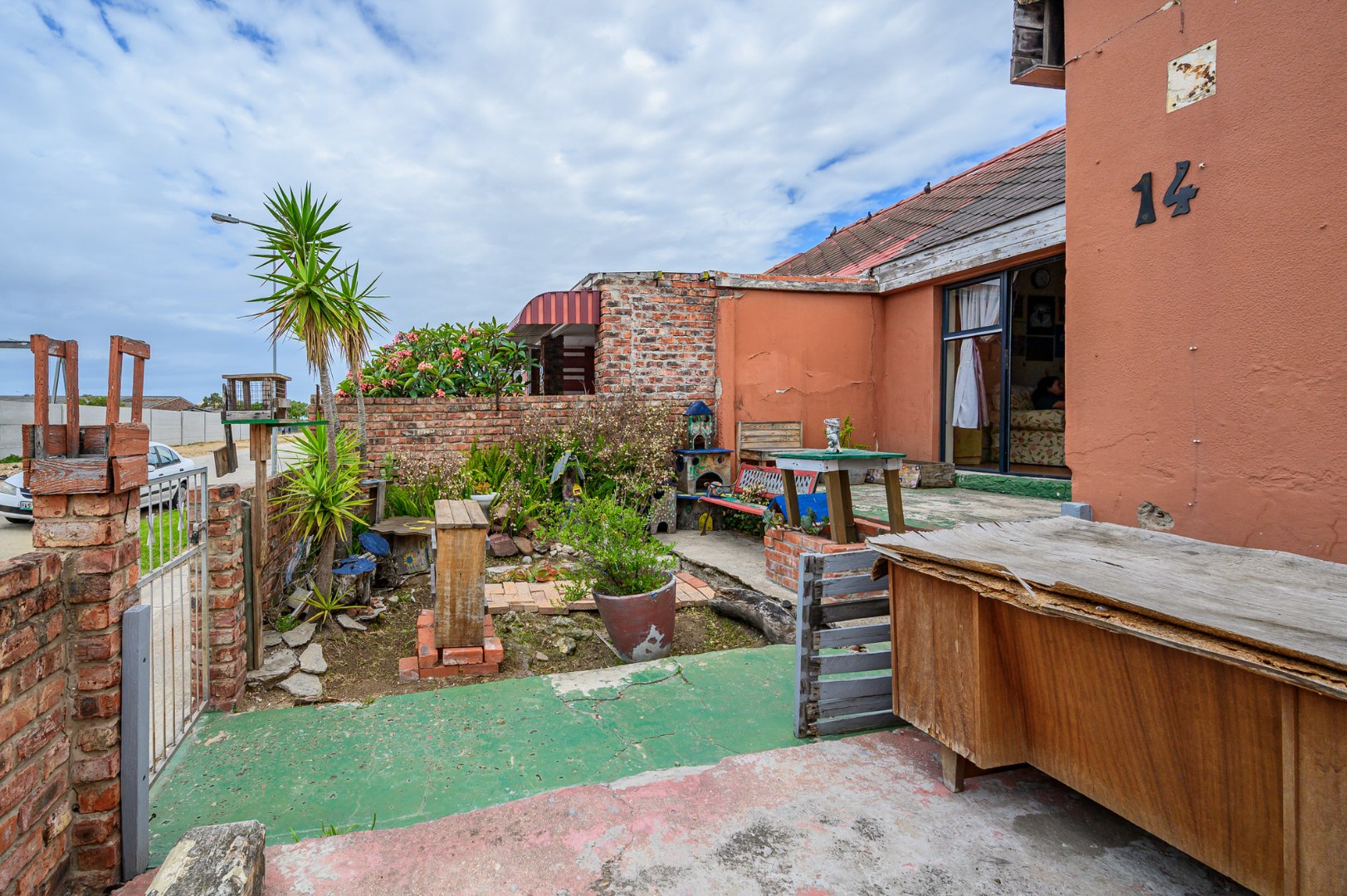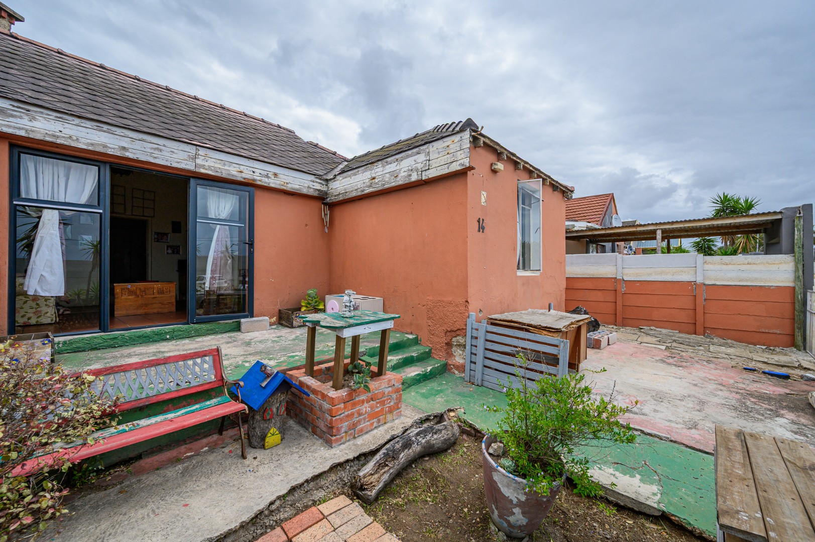 Inside, the home comprises a sunny lounge, a functional kitchen, and a welcoming front porch area. The bathroom is fitted with a bath, toilet, and wash basin. Flooring is a combination of tiled and wooden floors, adding character throughout the home.