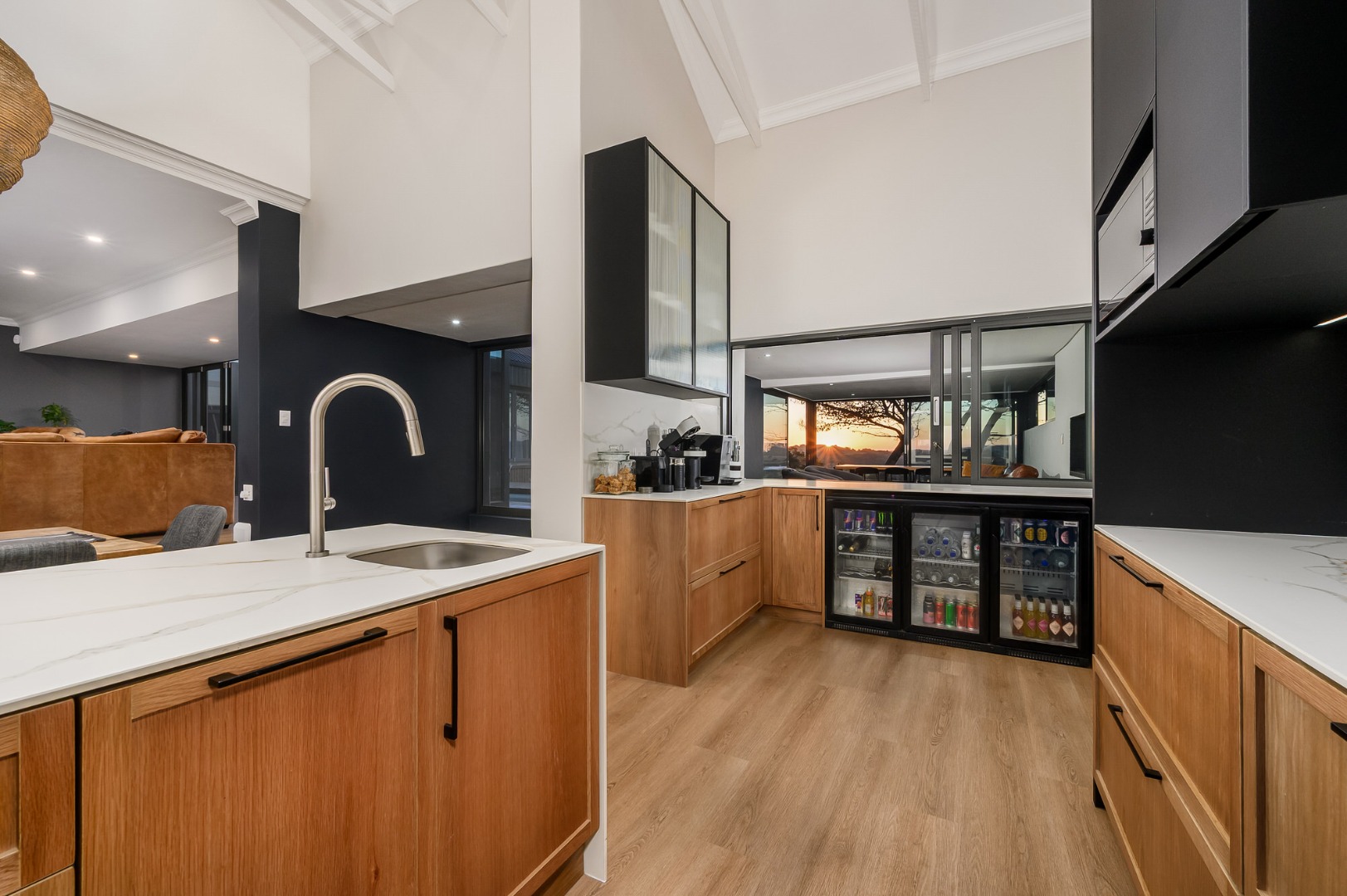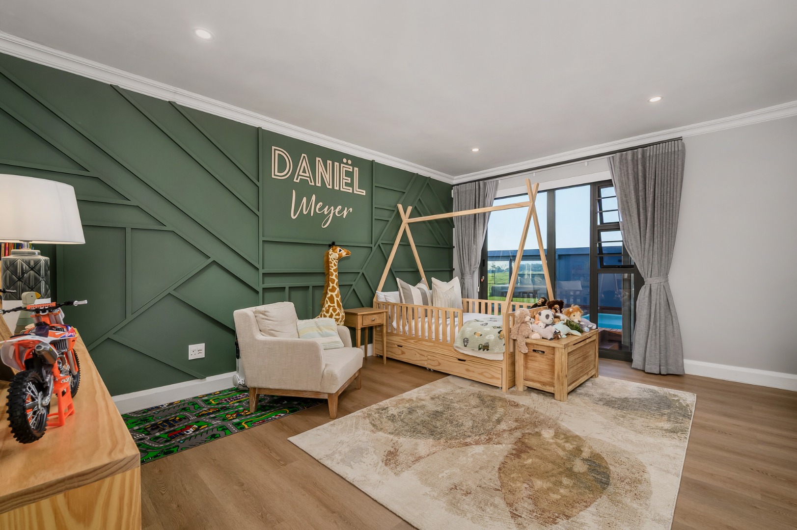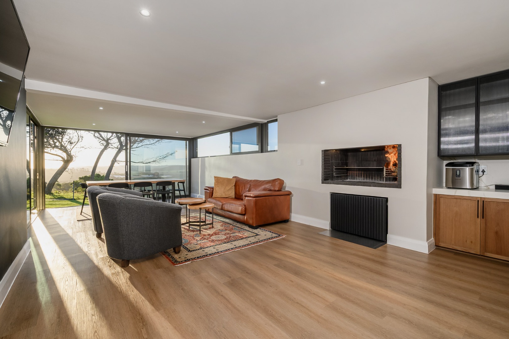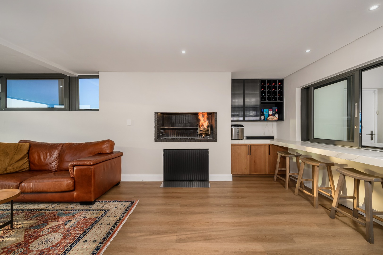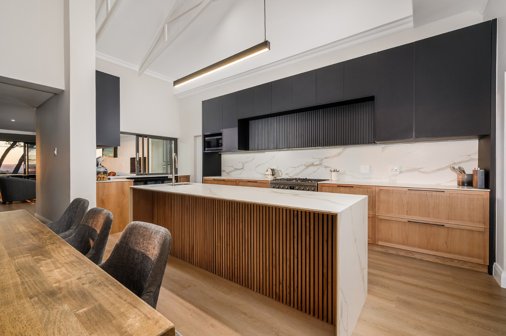 Inside, the home boasts modern finishes and a seamless open-plan layout connecting the lounge, dining area, and designer kitchen. The stylish kitchen includes a centre island, separate scullery, and a convenient serving hatch to the entertainment area. The entertainment room is perfect for hosting, complete with a built-in braai, comfortable seating, and dining area - all overlooking the park and spectacular sunsets.