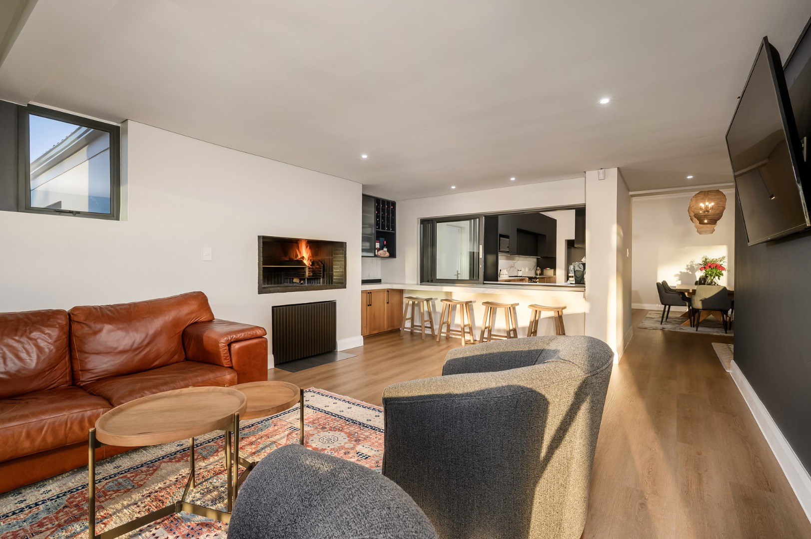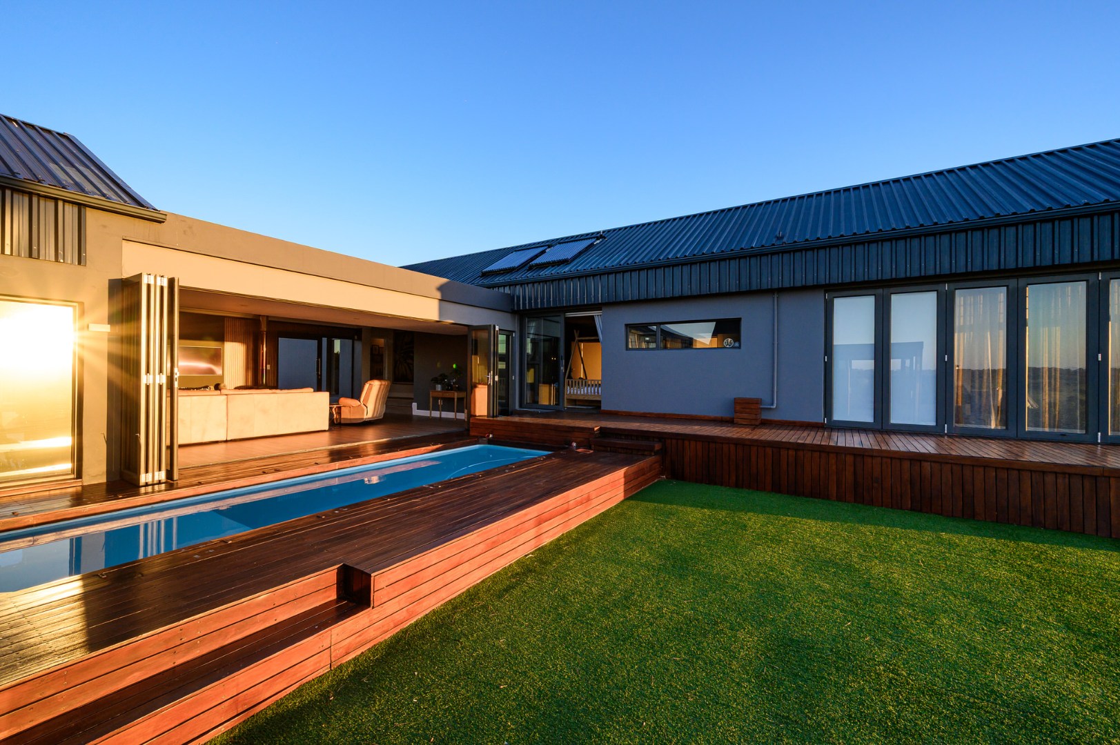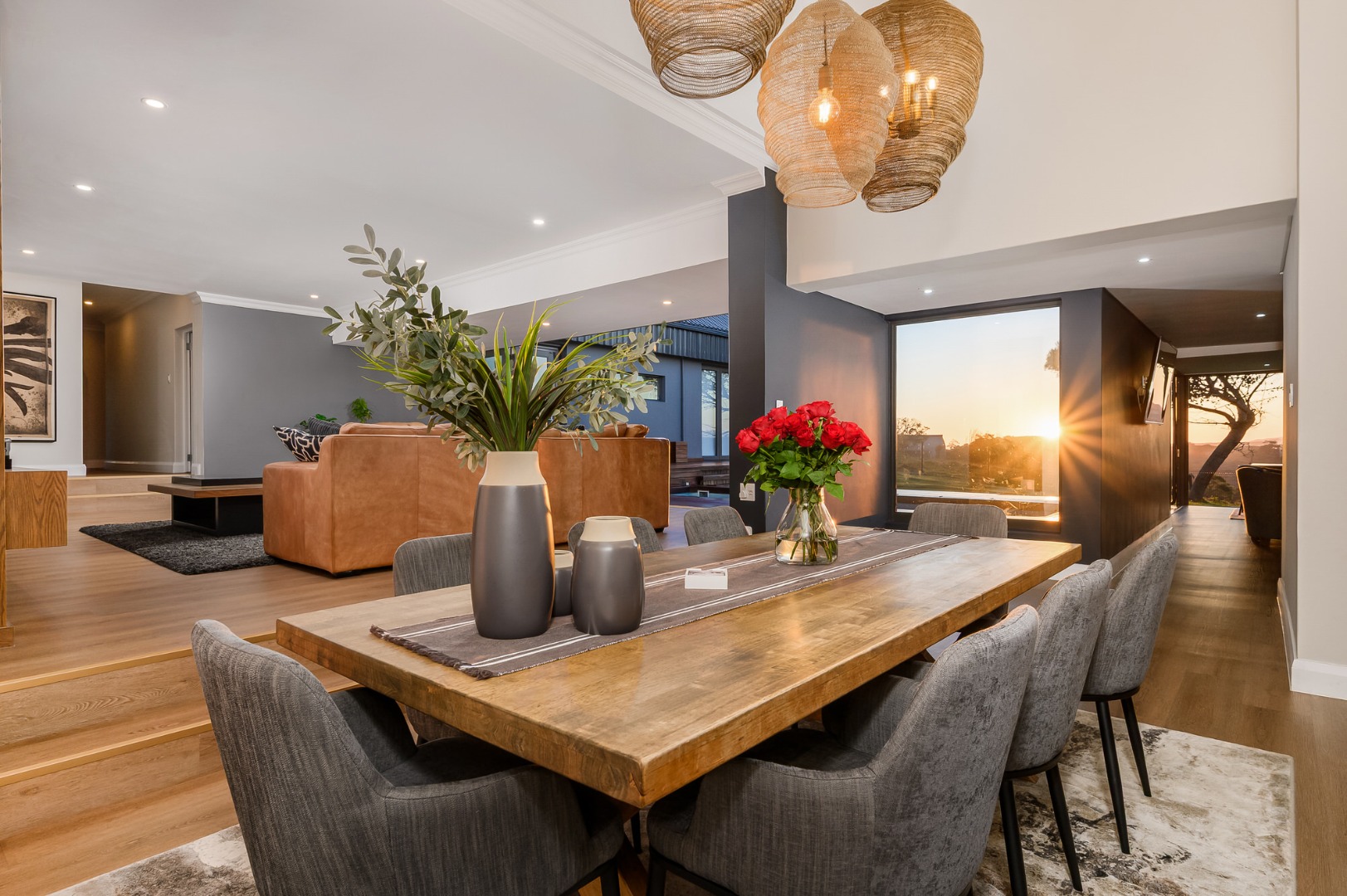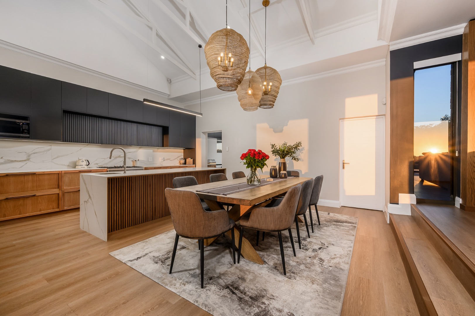 Inside, the home boasts modern finishes and a seamless open-plan layout connecting the lounge, dining area, and designer kitchen. The stylish kitchen includes a centre island, separate scullery, and a convenient serving hatch to the entertainment area. The entertainment room is perfect for hosting, complete with a built-in braai, comfortable seating, and dining area - all overlooking the park and spectacular sunsets.