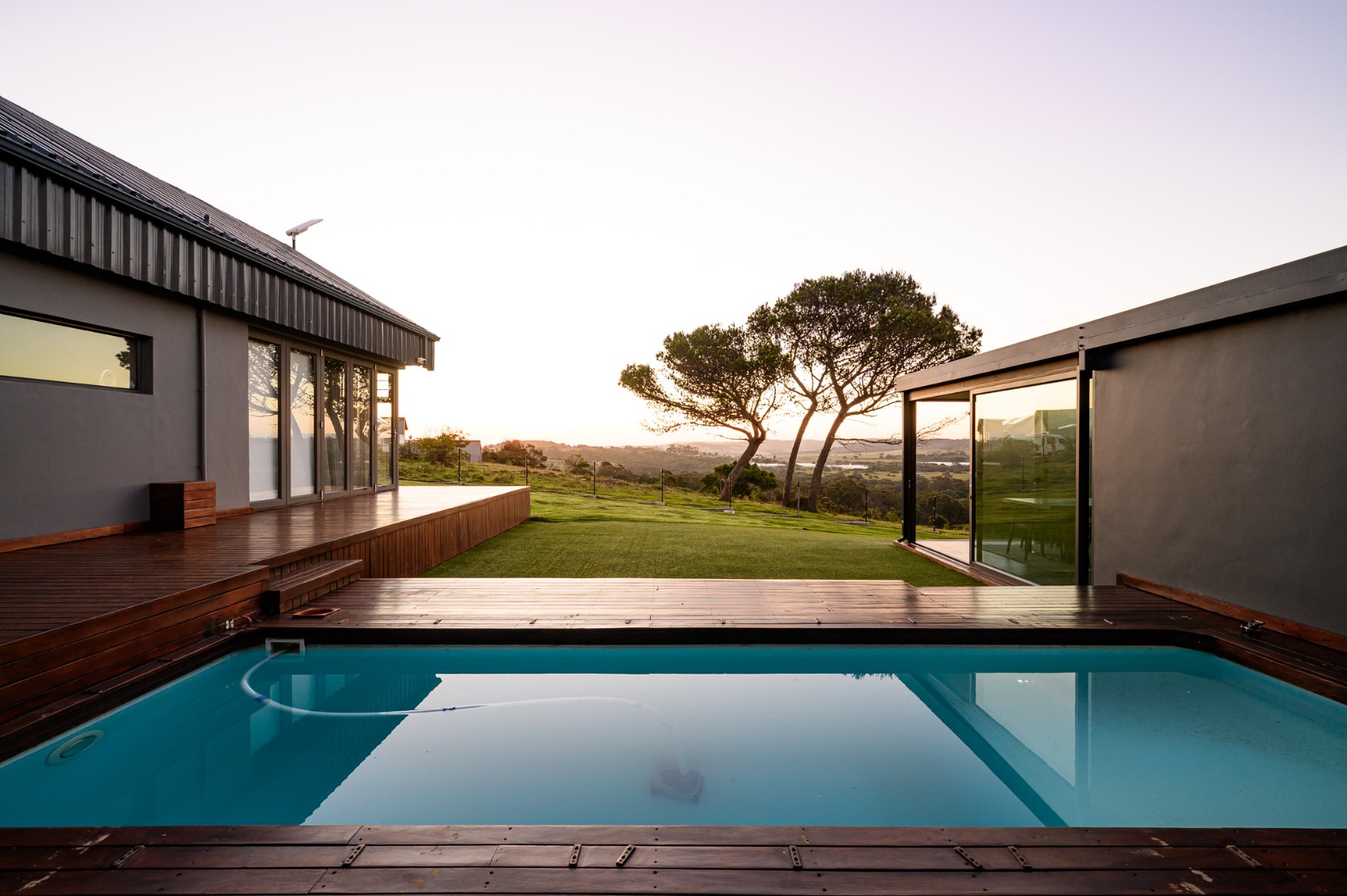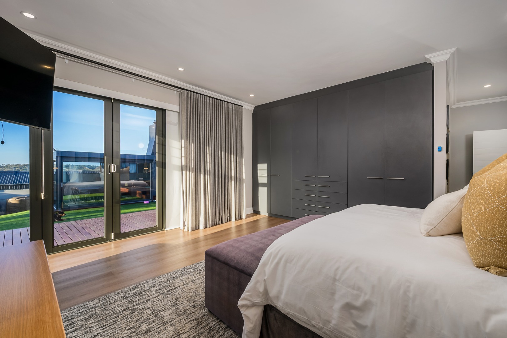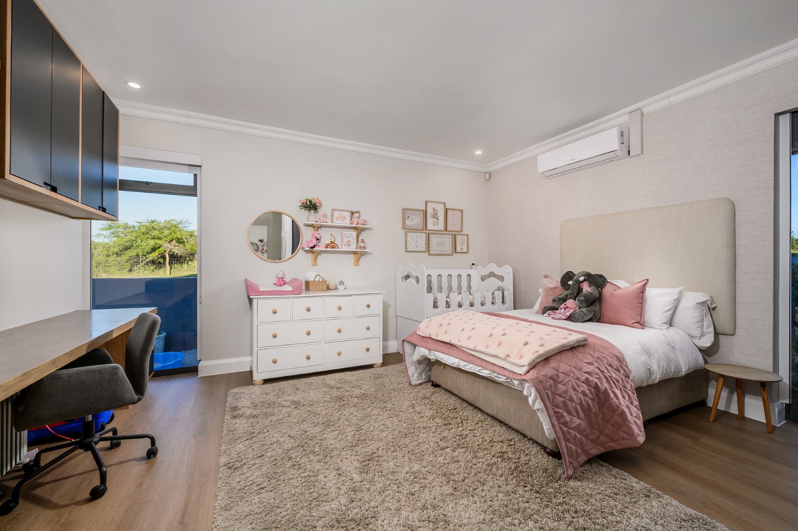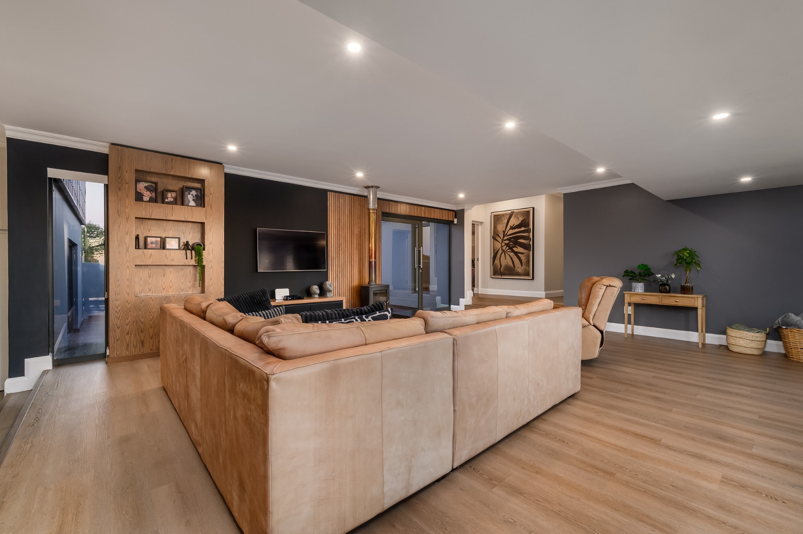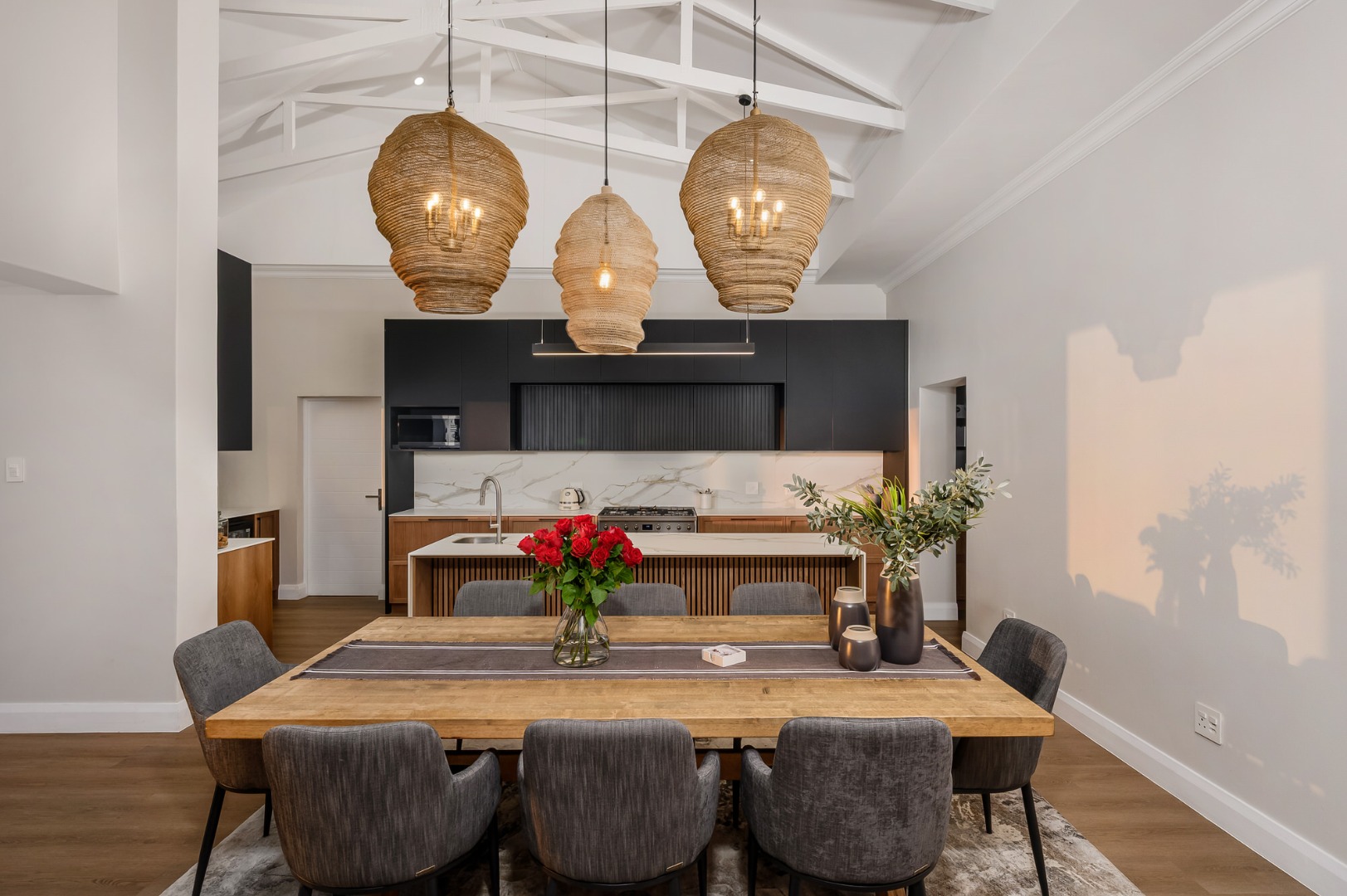 Inside, the home boasts modern finishes and a seamless open-plan layout connecting the lounge, dining area, and designer kitchen. The stylish kitchen includes a centre island, separate scullery, and a convenient serving hatch to the entertainment area. The entertainment room is perfect for hosting, complete with a built-in braai, comfortable seating, and dining area - all overlooking the park and spectacular sunsets.