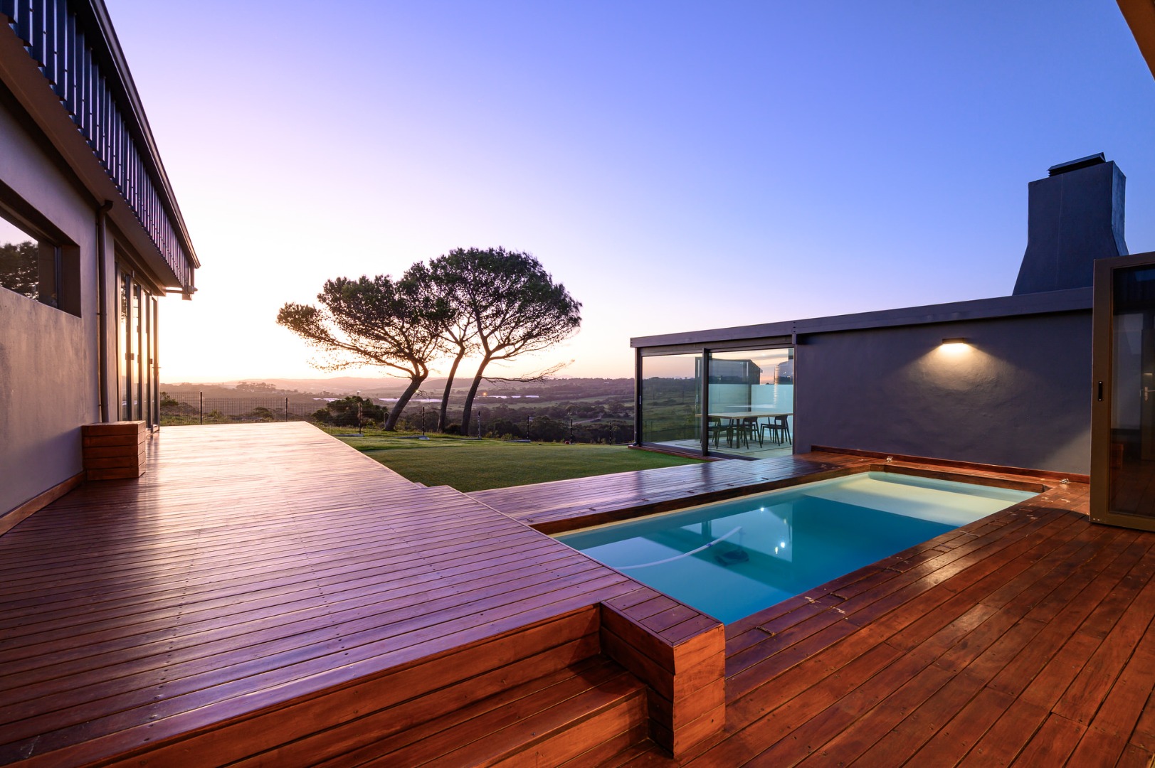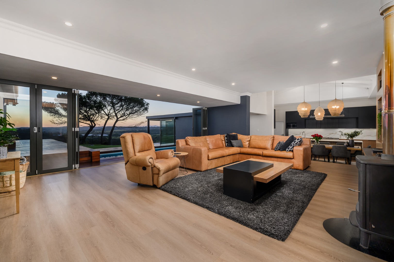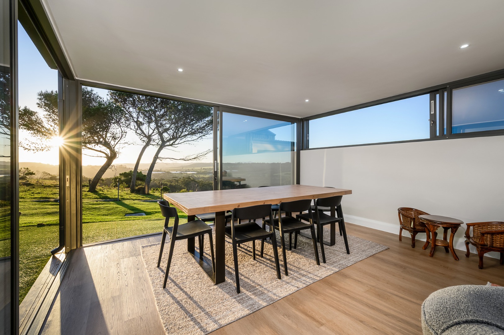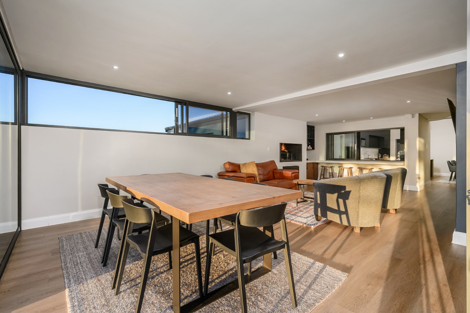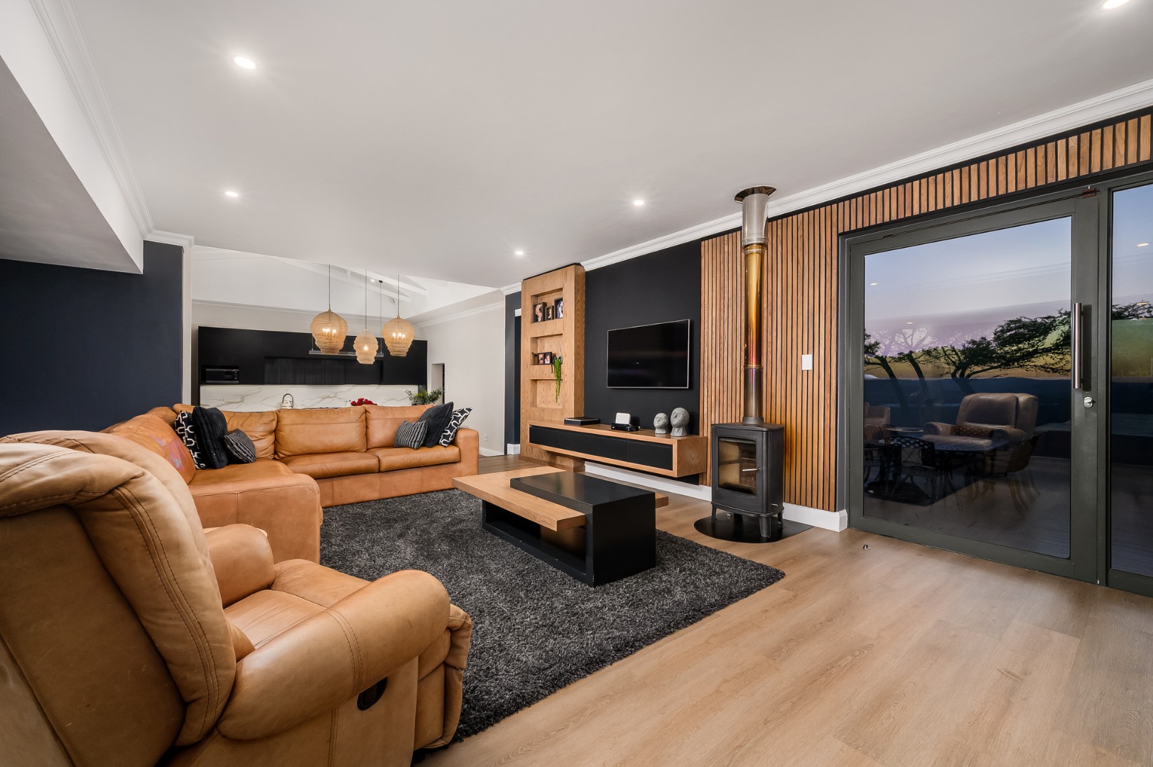 Inside, the home boasts modern finishes and a seamless open-plan layout connecting the lounge, dining area, and designer kitchen. The stylish kitchen includes a centre island, separate scullery, and a convenient serving hatch to the entertainment area. The entertainment room is perfect for hosting, complete with a built-in braai, comfortable seating, and dining area - all overlooking the park and spectacular sunsets.