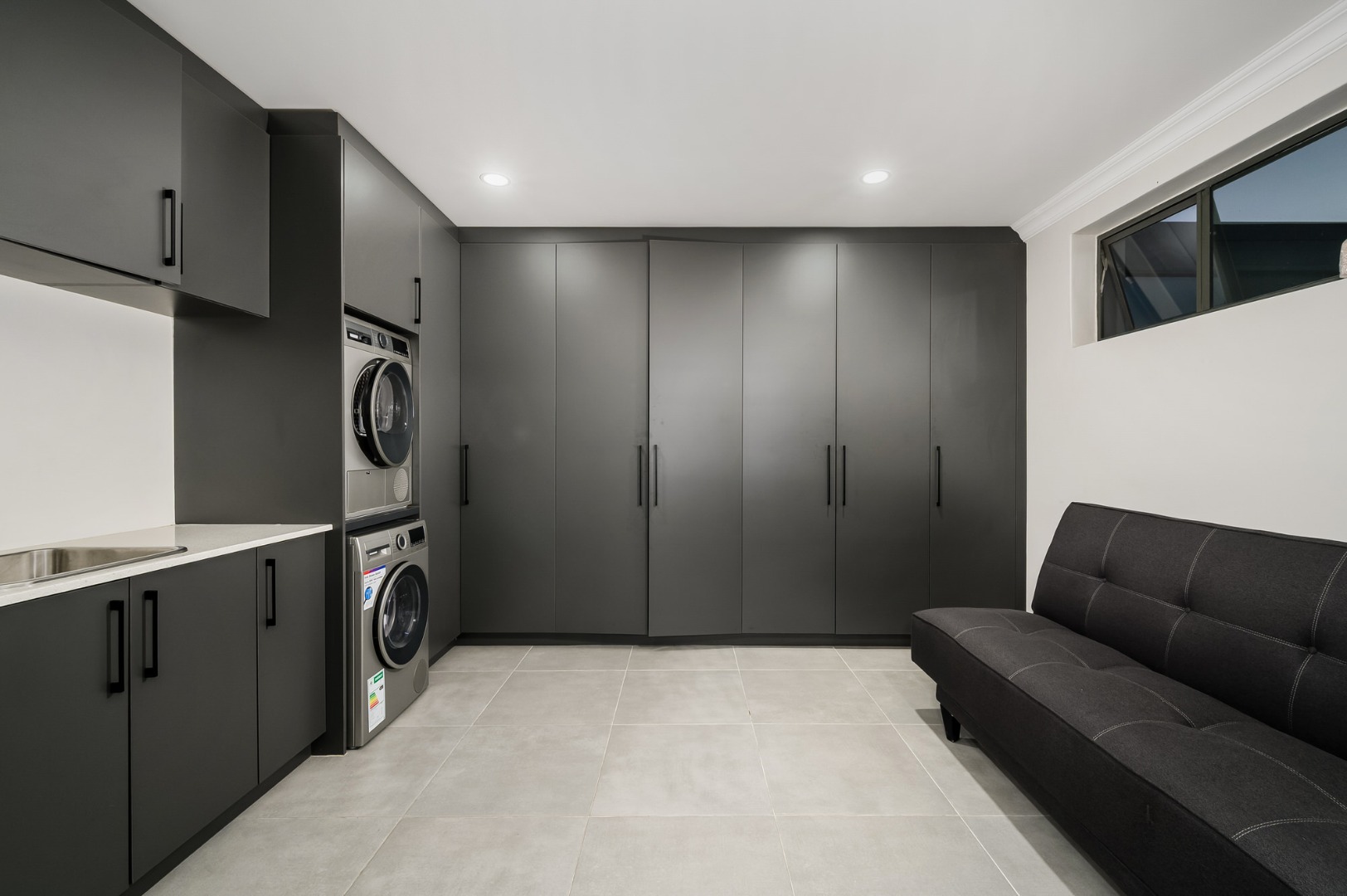 - Separate laundry room with ample cabinetry, also suitable for use as a gym or domestic space