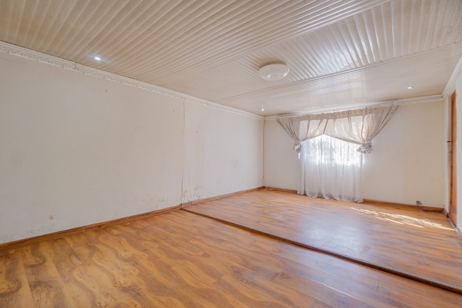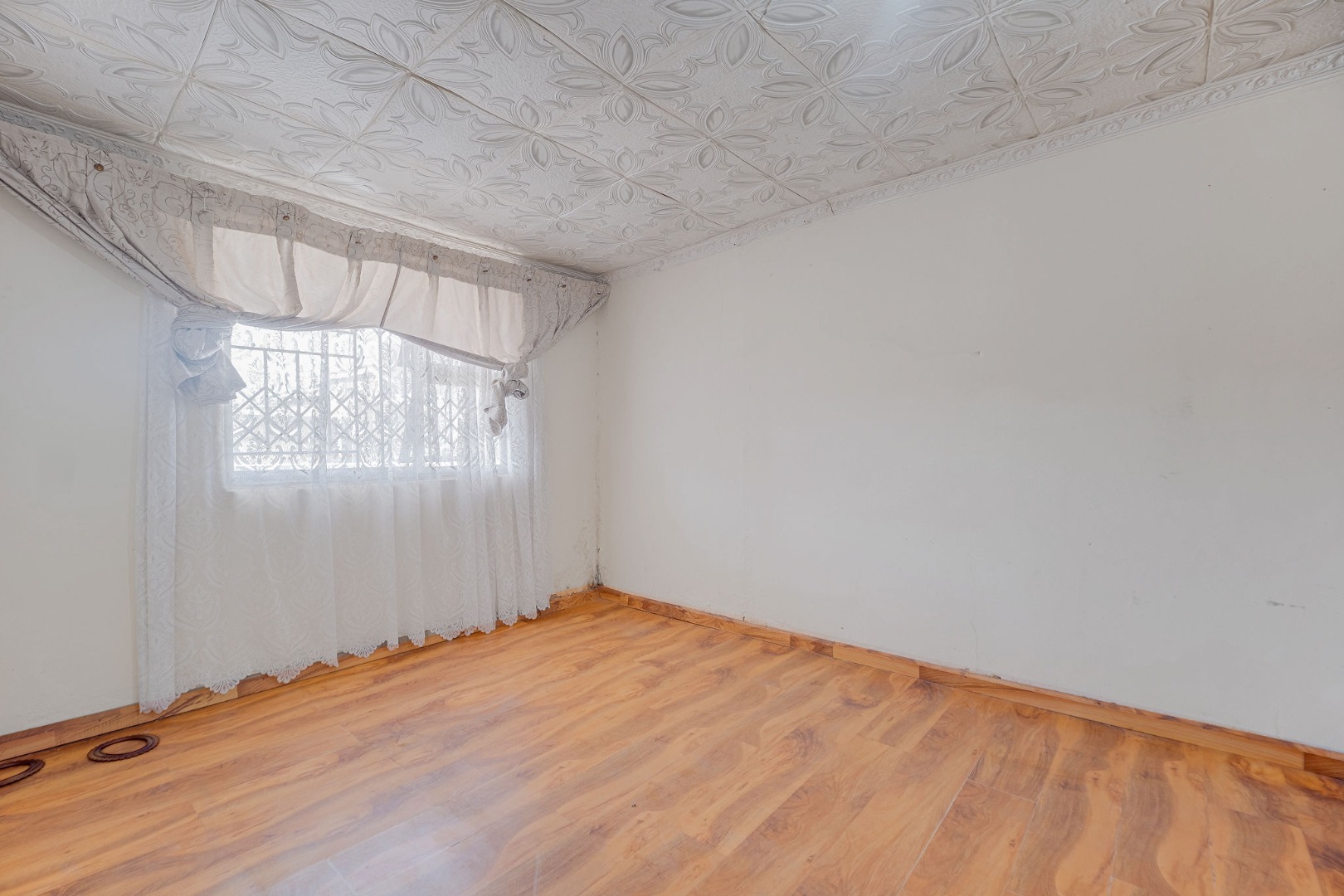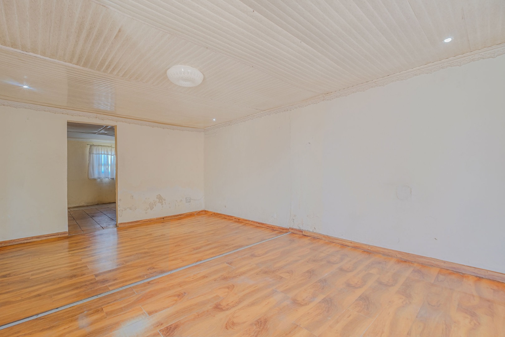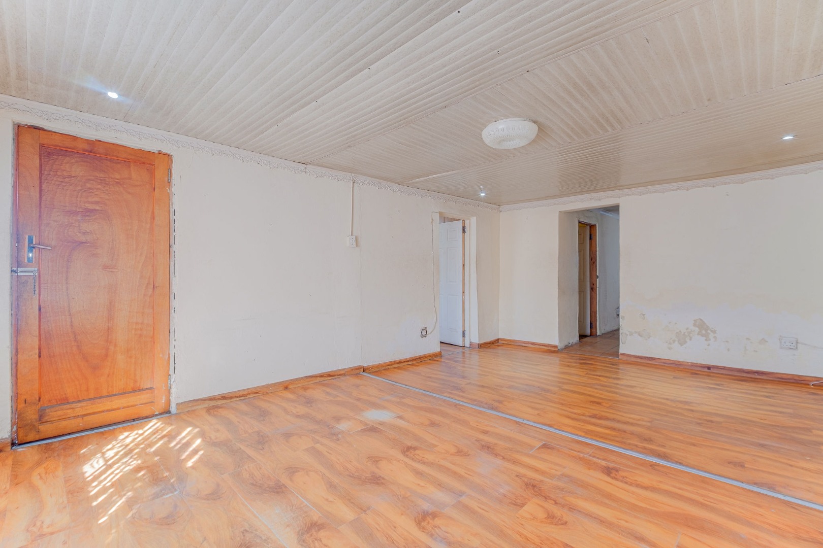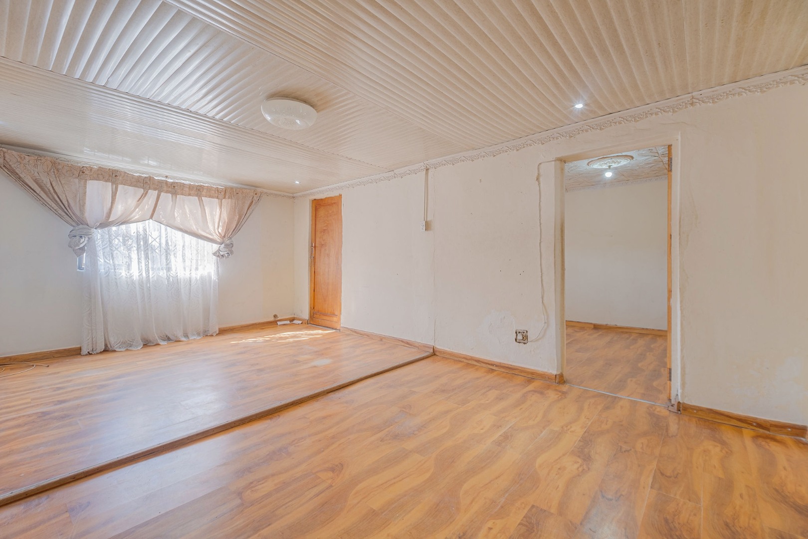 Inside, the home features a lounge and a kitchen, providing essential living . Accommodation comprises two bedrooms and one bathroom, catering to a small family or individual. The bedrooms also benefit from the consistent laminate wood flooring found throughout much of the home, offering a cohesive interior feel.