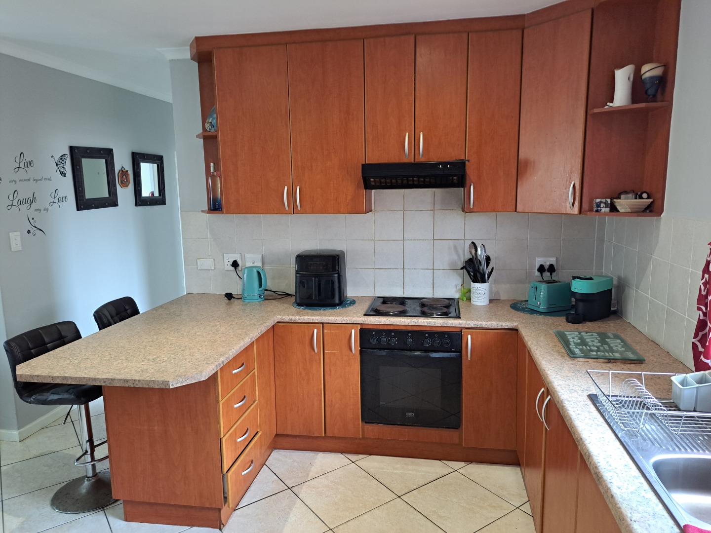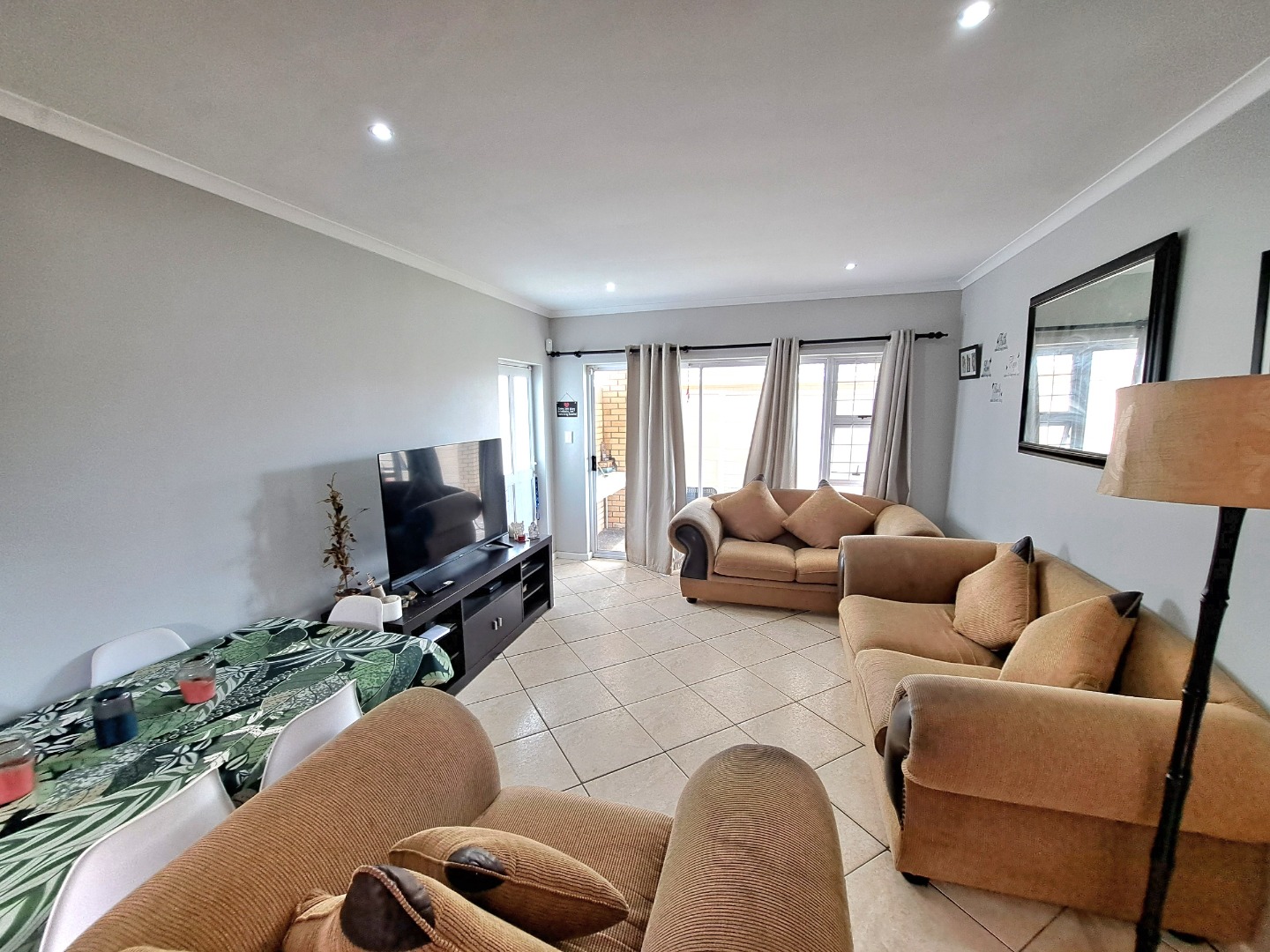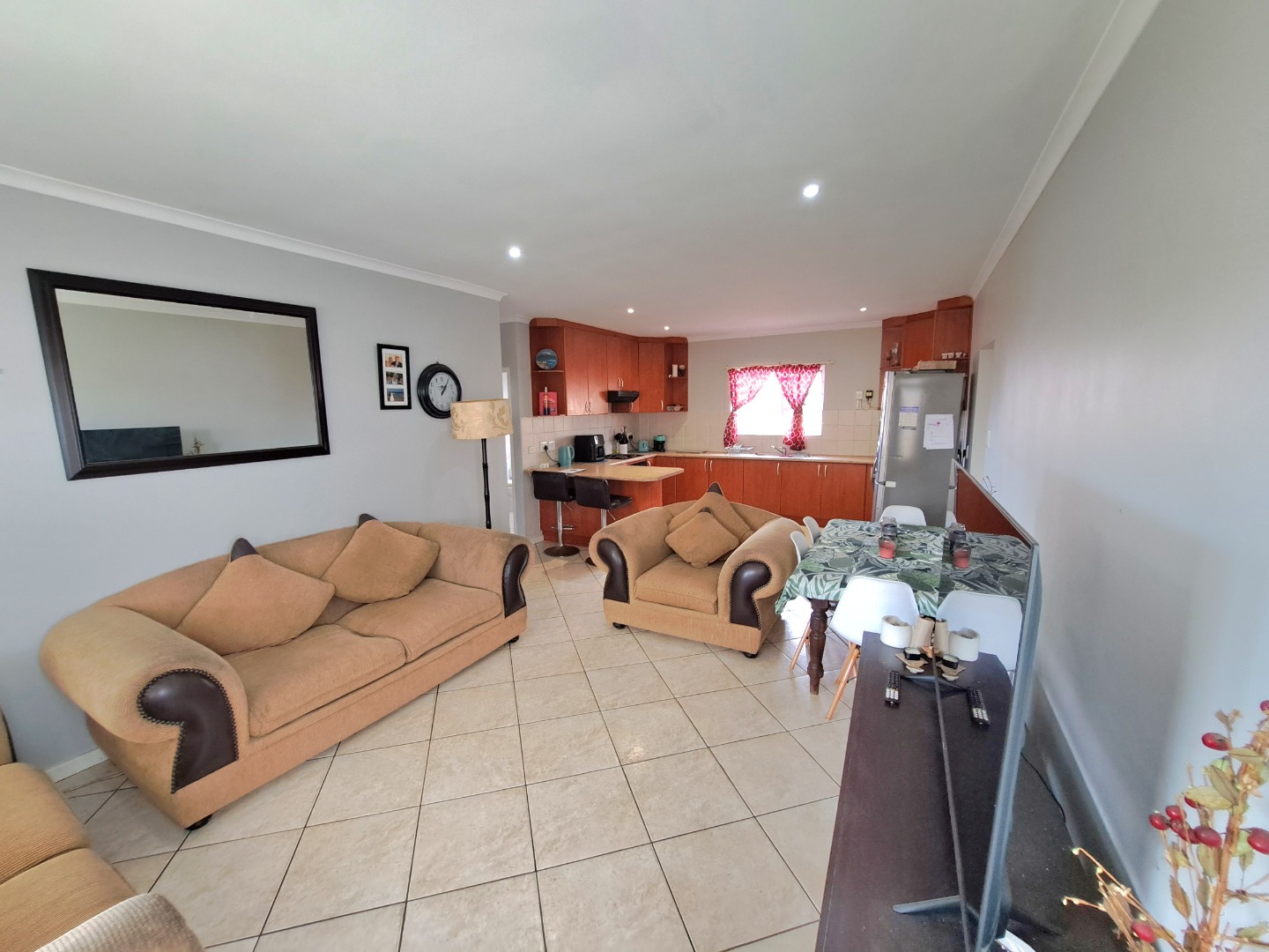This charming residential property features three comfortable bedrooms and two modern bathrooms, including a private en-suite for the main bedroom, ensuring convenience and privacy. The home presents an open-plan layout, seamlessly connecting the well-appointed kitchen, dining and lounge. This space connects with a covered braai patio, perfect for both everyday living, entertaining and relaxation. Outdoor living is enhanced by a private garden, fully walled and perfect for kids and their pets as well as your gardening projects.