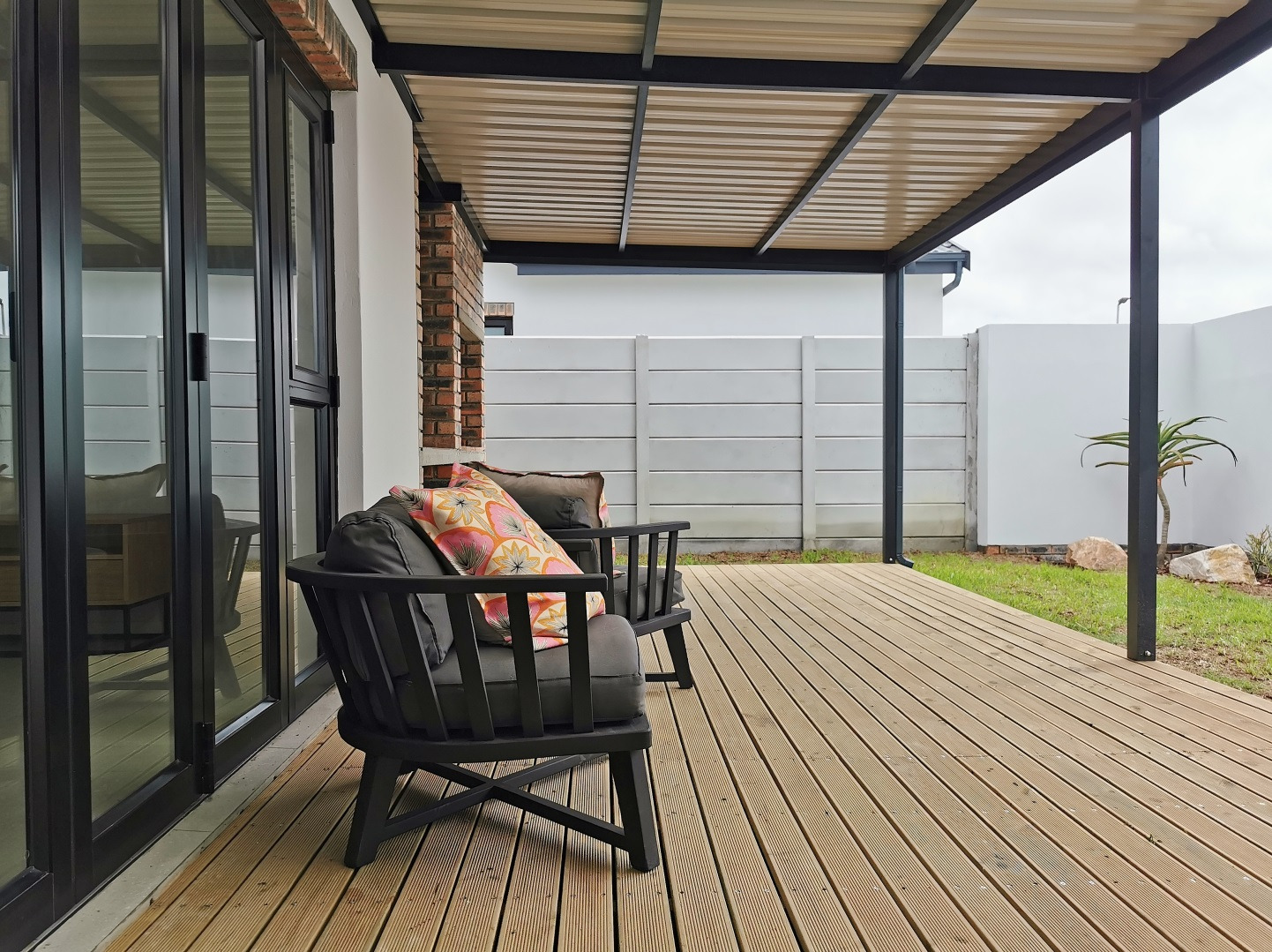 These homes are plastered and painted with tiled roofs, black aluminium windows with burglar bars, and remote garage doors. For added efficiency, every unit includes a solar-powered geyser and pre-paid electricity, supporting low-maintenance and energy-conscious living. Private enclosed outdoor spaces include paved patios and your own built-in brick braai, ideal for entertaining. Optional extras such as porcelain tiling, designer splashbacks, decking and stack-away doors are available to personalize your space.