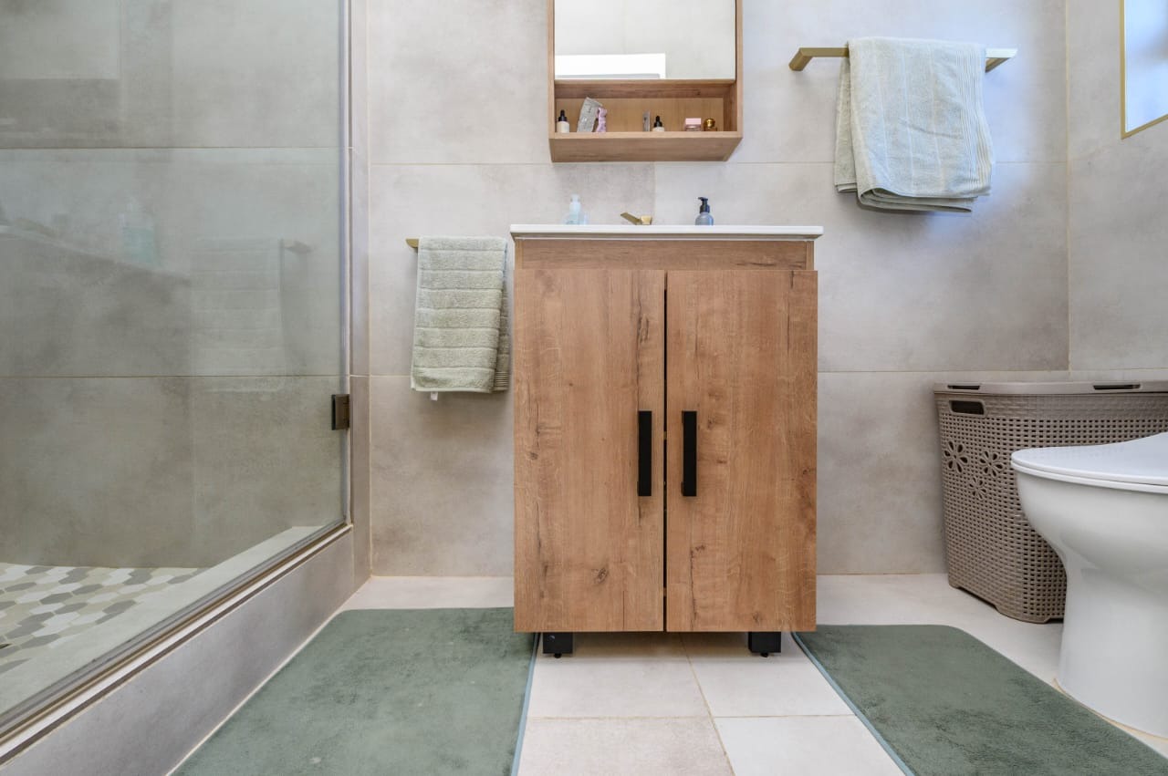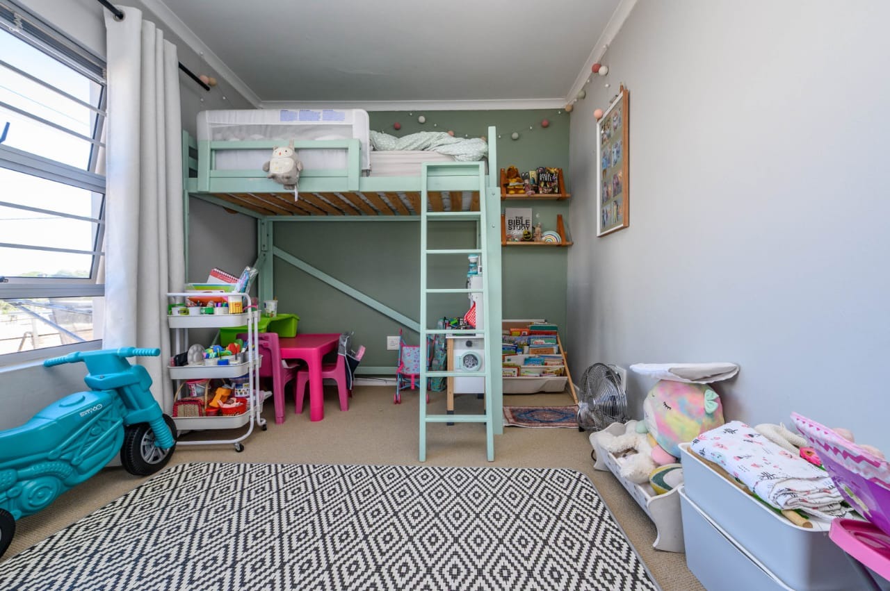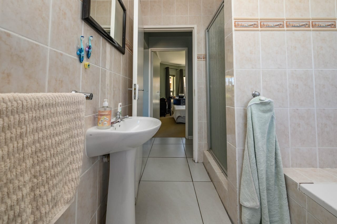 The home features three well-sized bedrooms with built-in cupboards, including a main bedroom with an en-suite bathroom. The second bathroom is neatly finished and conveniently positioned to serve the remaining bedrooms and guests.