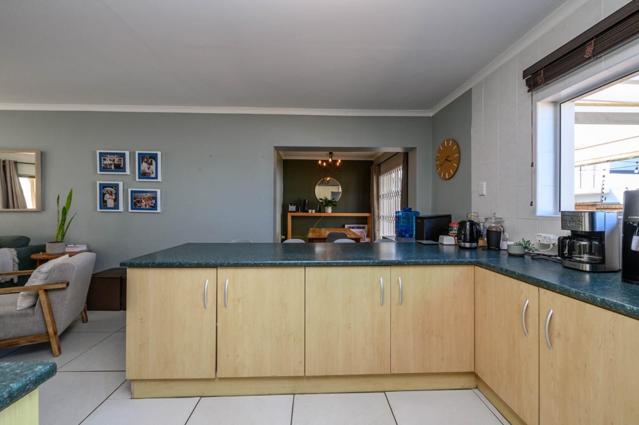 The living area flows effortlessly, creating a warm and welcoming space for family living and entertaining. The kitchen is practical and well-appointed, offering ample cupboard space and easy access to the living area.