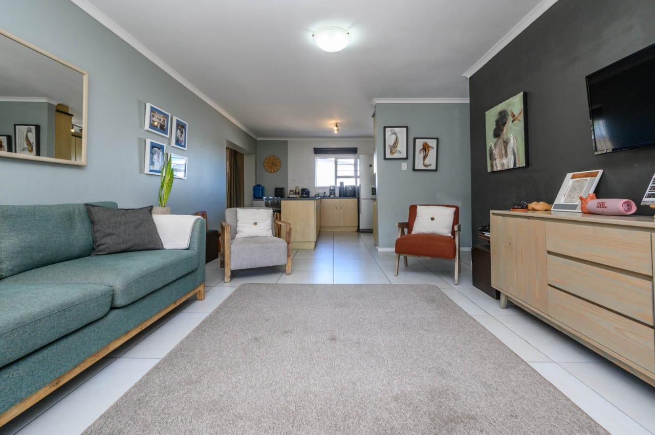 The living area flows effortlessly, creating a warm and welcoming space for family living and entertaining. The kitchen is practical and well-appointed, offering ample cupboard space and easy access to the living area.