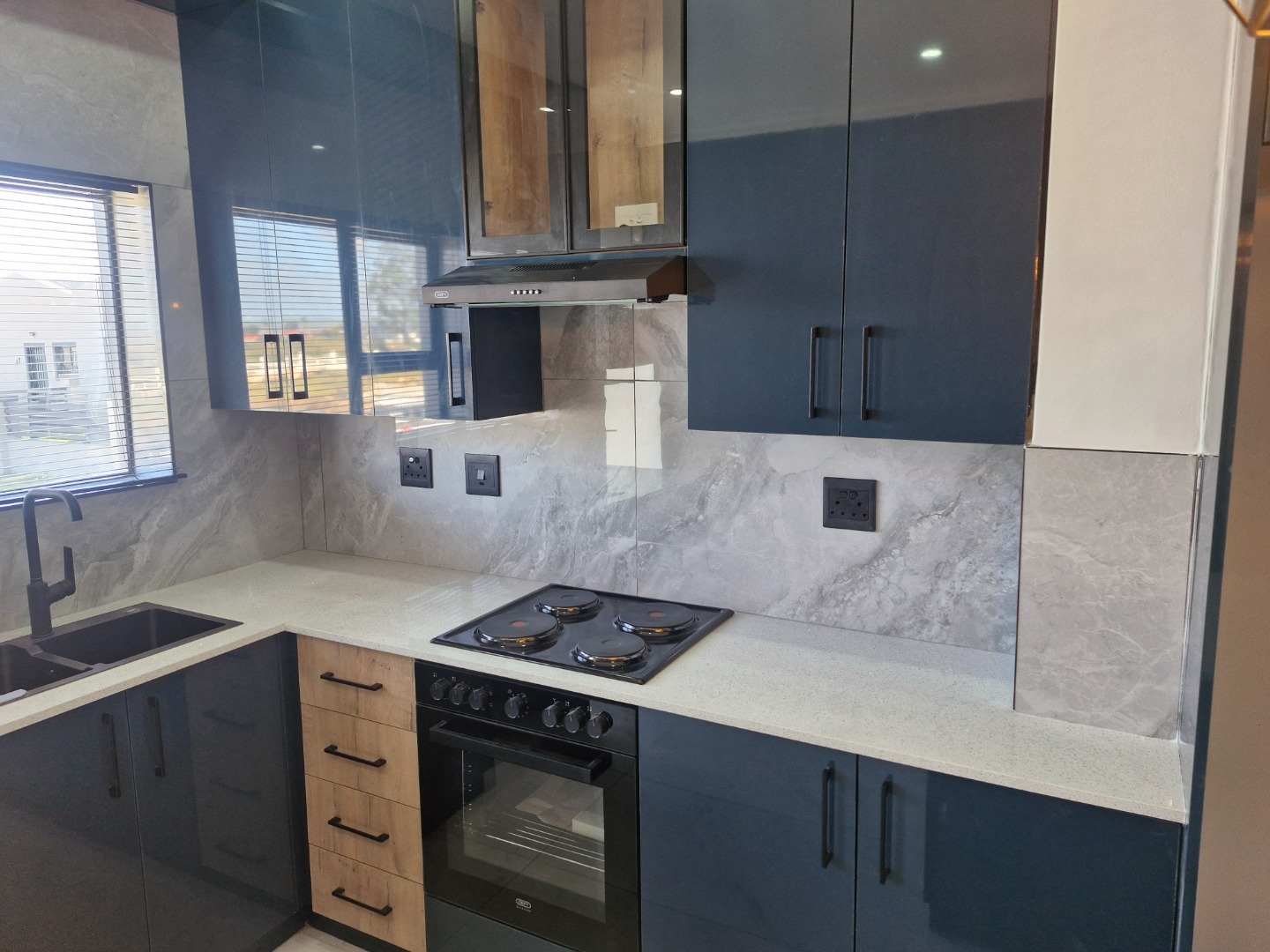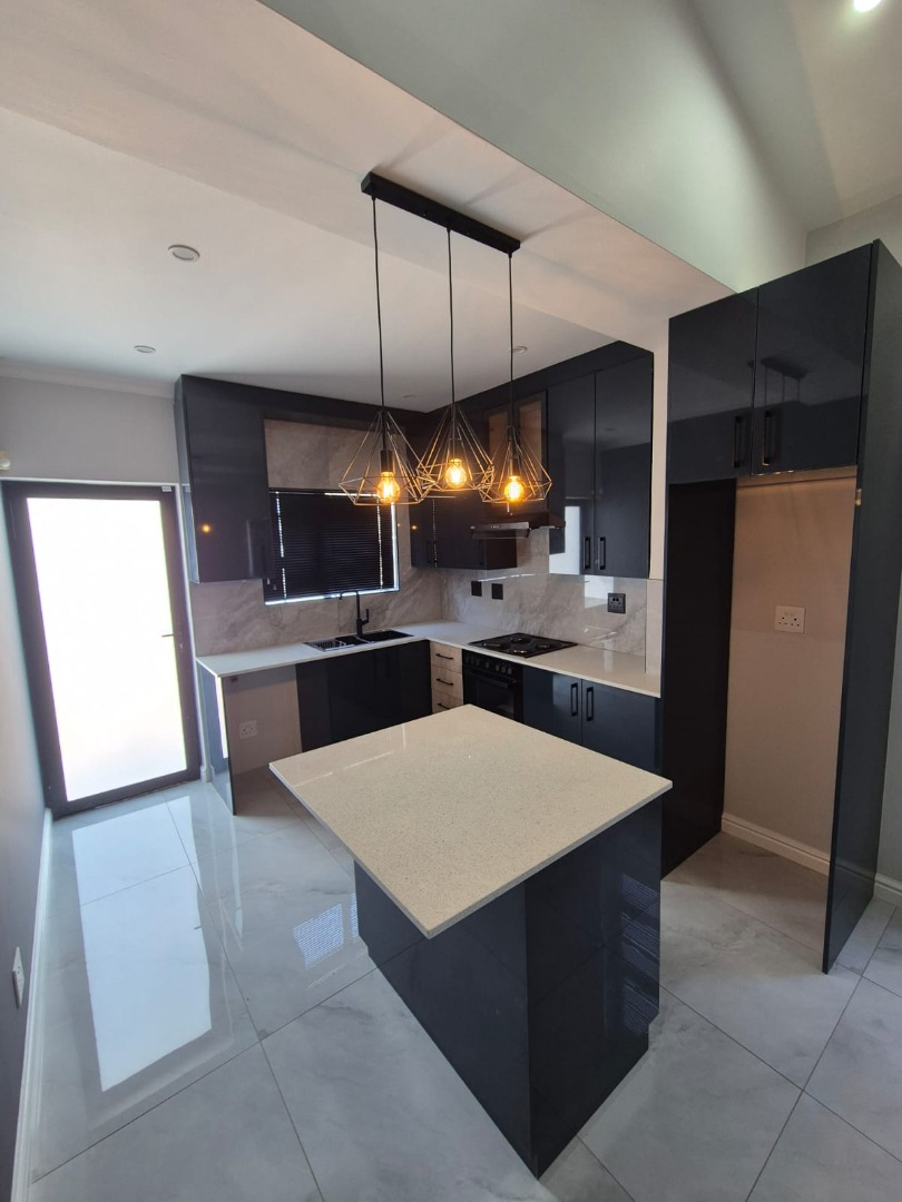 - Designer Kitchen with oven and hob and extractor fan. Countertops and middle island are lovely Eazi Quarts. One point for dishwasher/washing machine. Stunning black basin and tap and hanging lights.