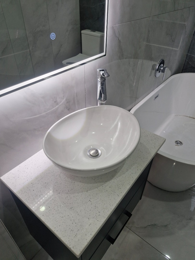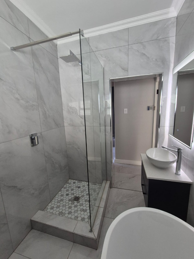 - 1 full Bathroom. Freestanding bath and walk-in shower. Basin on vanity cupboard and stunning lighted mirror. Porcelain tiles to the ceiling. Barndoor slider.