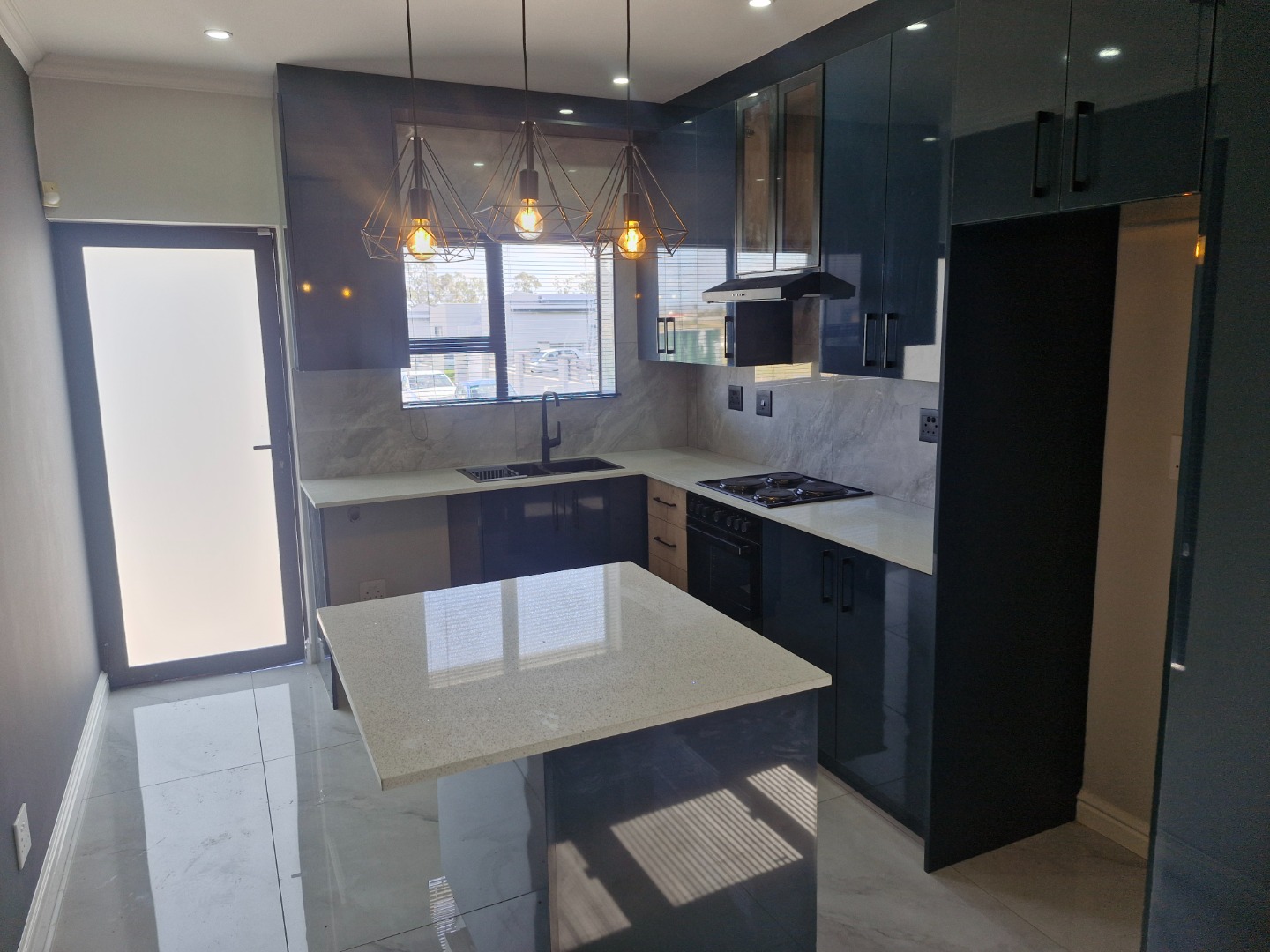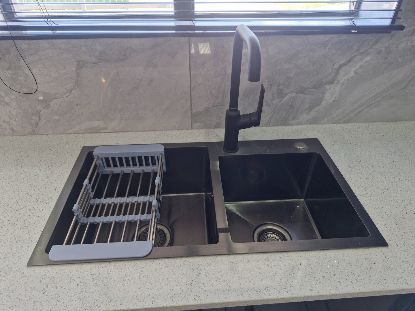 - Designer Kitchen with oven and hob and extractor fan. Countertops and middle island are lovely Eazi Quarts. One point for dishwasher/washing machine. Stunning black basin and tap and hanging lights.