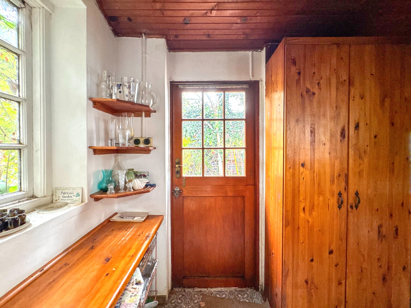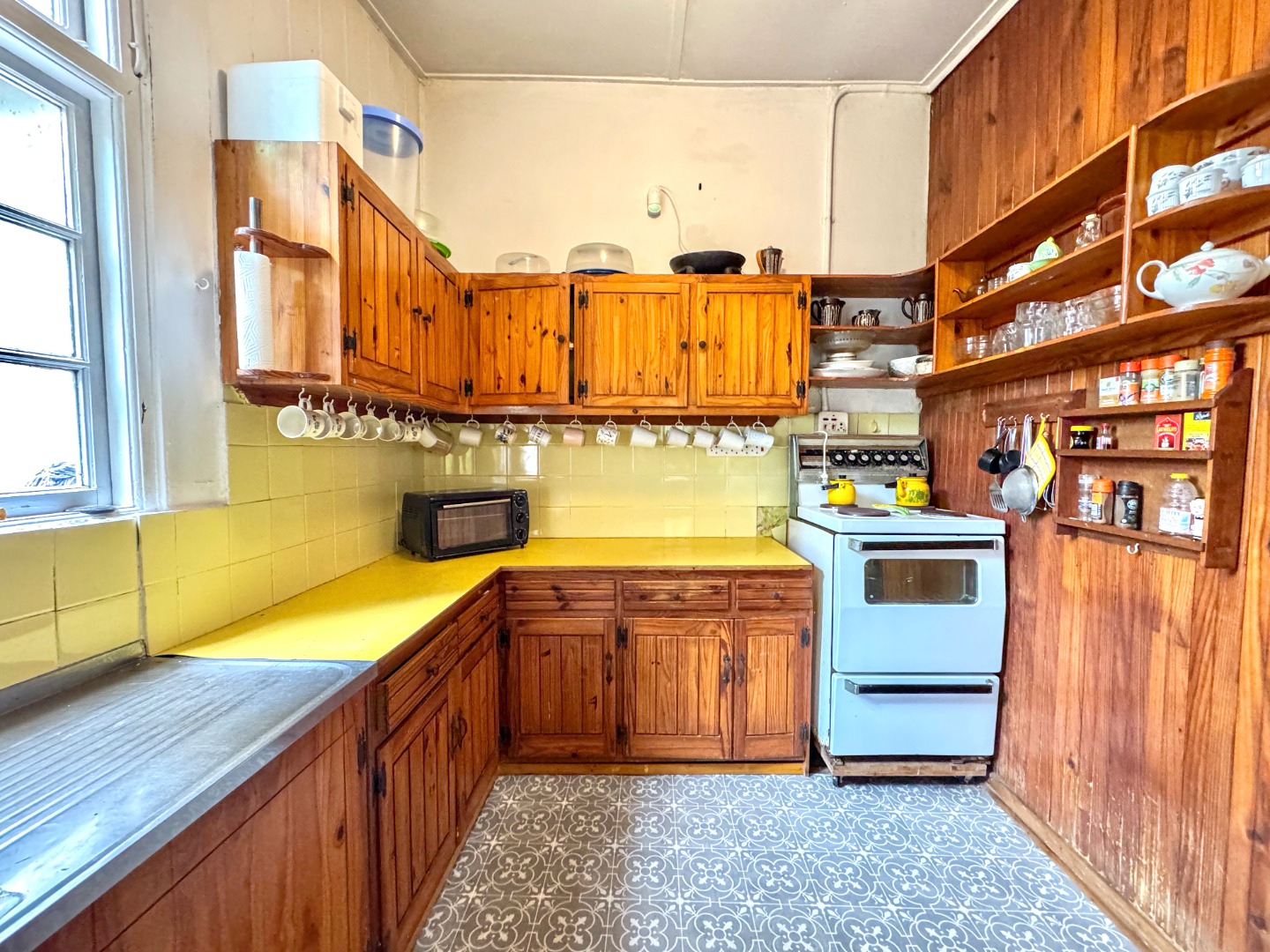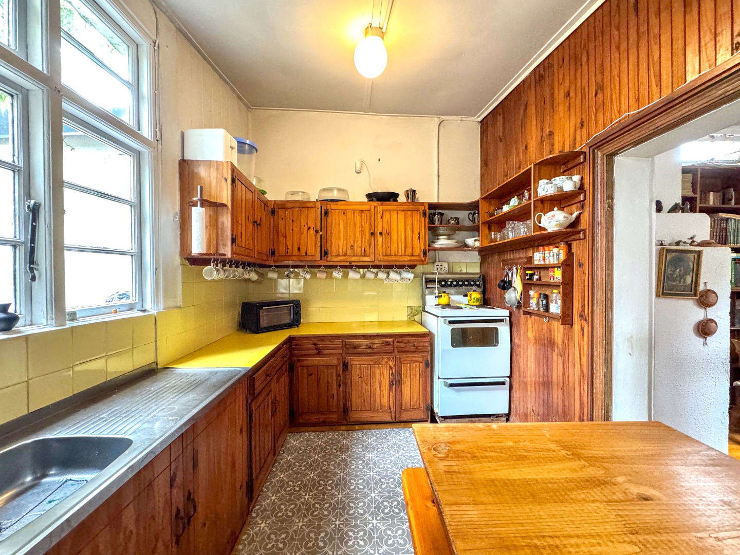 The interior layout provides a comfortable flow. The vintage-style kitchen, with rustic wooden cabinetry, open shelving, and patterned floor tiles, presents a canvas for modern renovation while retaining its inherent charm. Large windows ensure a bright, airy atmosphere. A versatile rustic room, featuring a wooden ceiling and charming Dutch door, offers additional flexible space, benefiting from ample natural light and built-in storage.