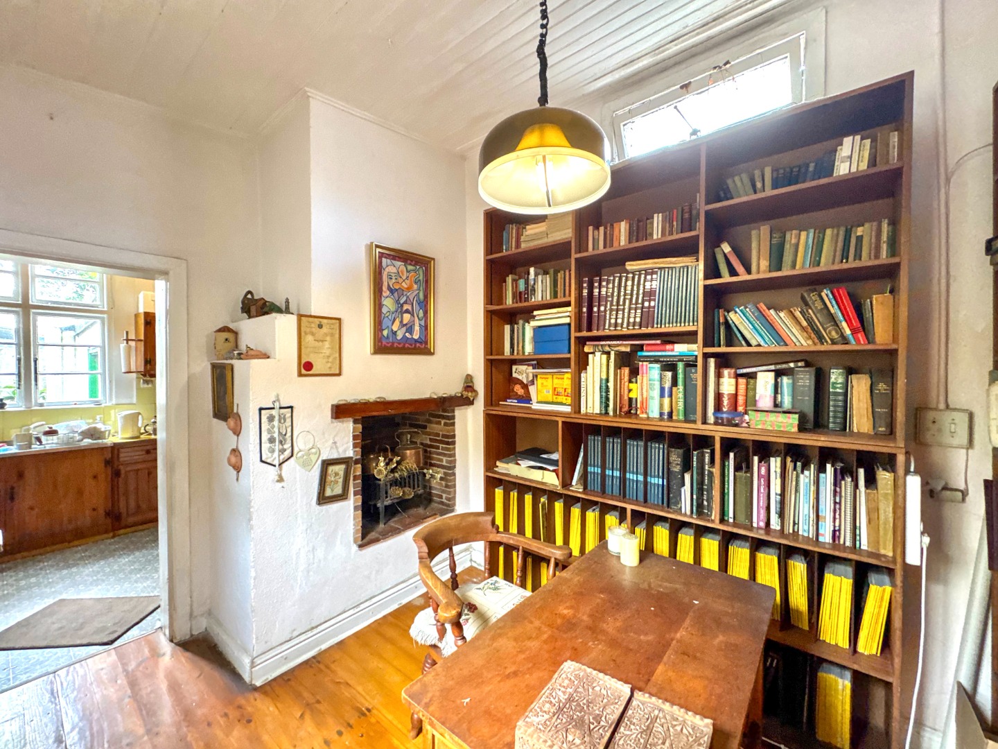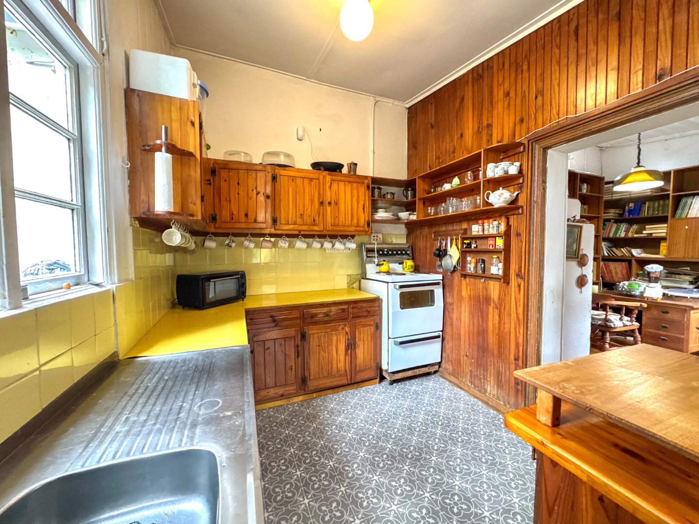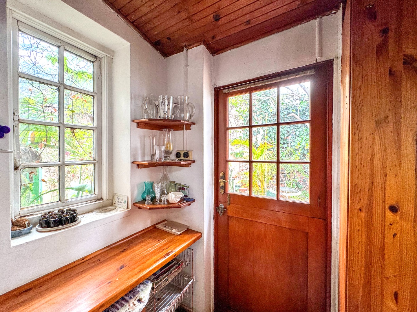 The interior layout provides a comfortable flow. The vintage-style kitchen, with rustic wooden cabinetry, open shelving, and patterned floor tiles, presents a canvas for modern renovation while retaining its inherent charm. Large windows ensure a bright, airy atmosphere. A versatile rustic room, featuring a wooden ceiling and charming Dutch door, offers additional flexible space, benefiting from ample natural light and built-in storage.
