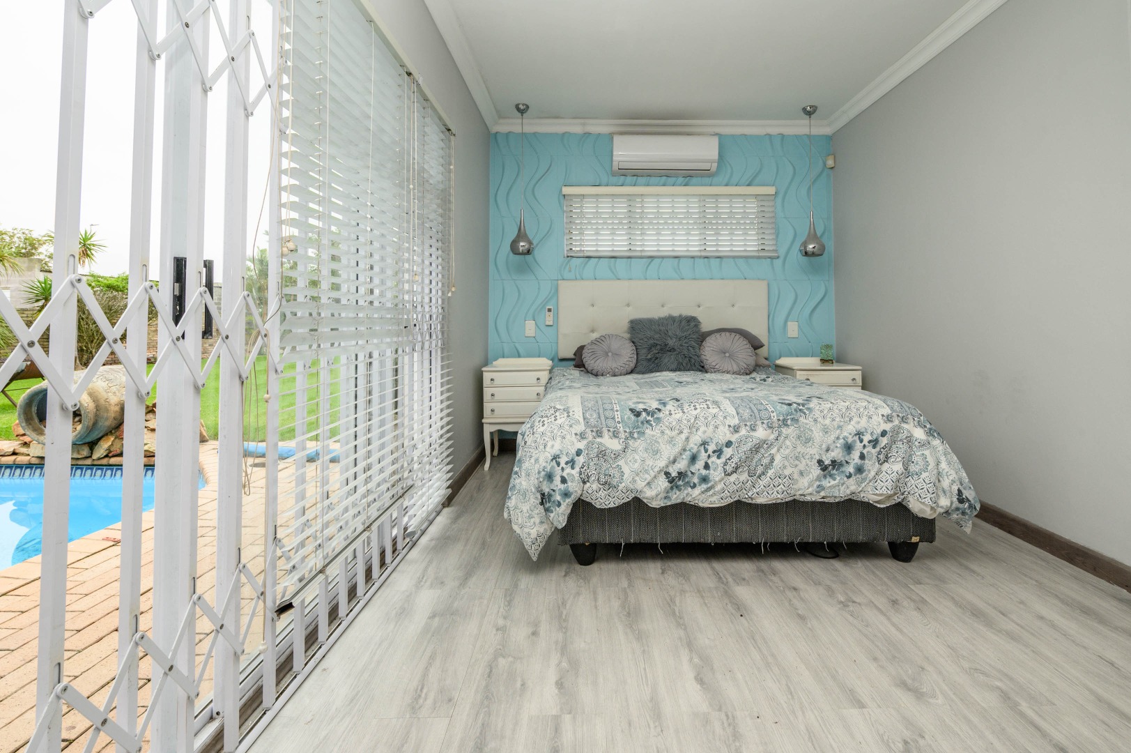 The home offers three bedrooms, with the main bedroom overlooking the pool area. The two additional bedrooms share a guest bathroom, while the main bedroom features its own en-suite bathroom.