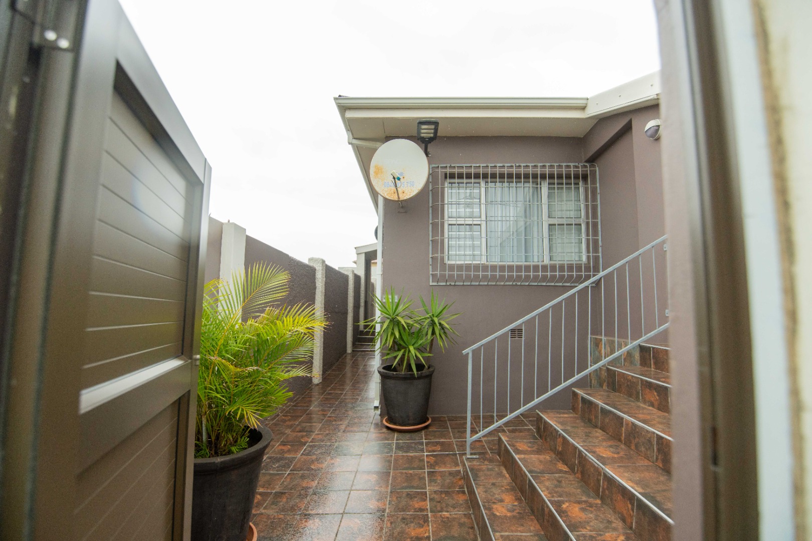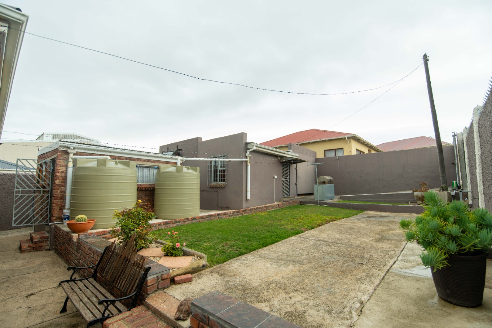 The front yard is fully paved and enclosed, creating a neat, low-maintenance space with a small established garden area adding a touch of greenery.