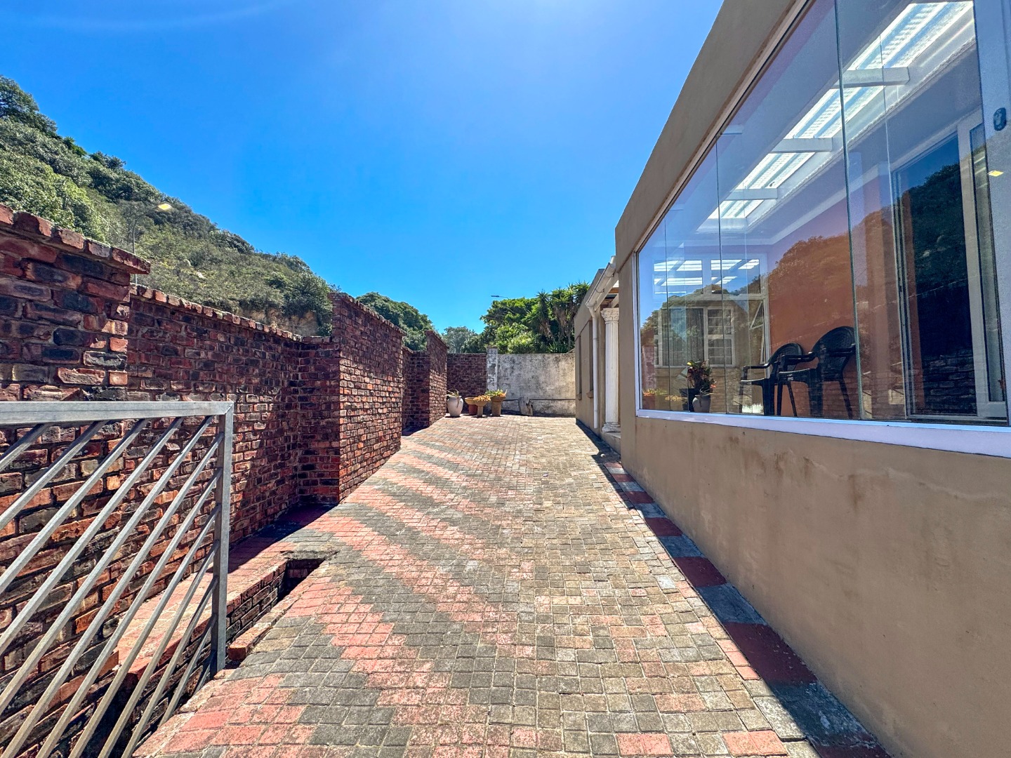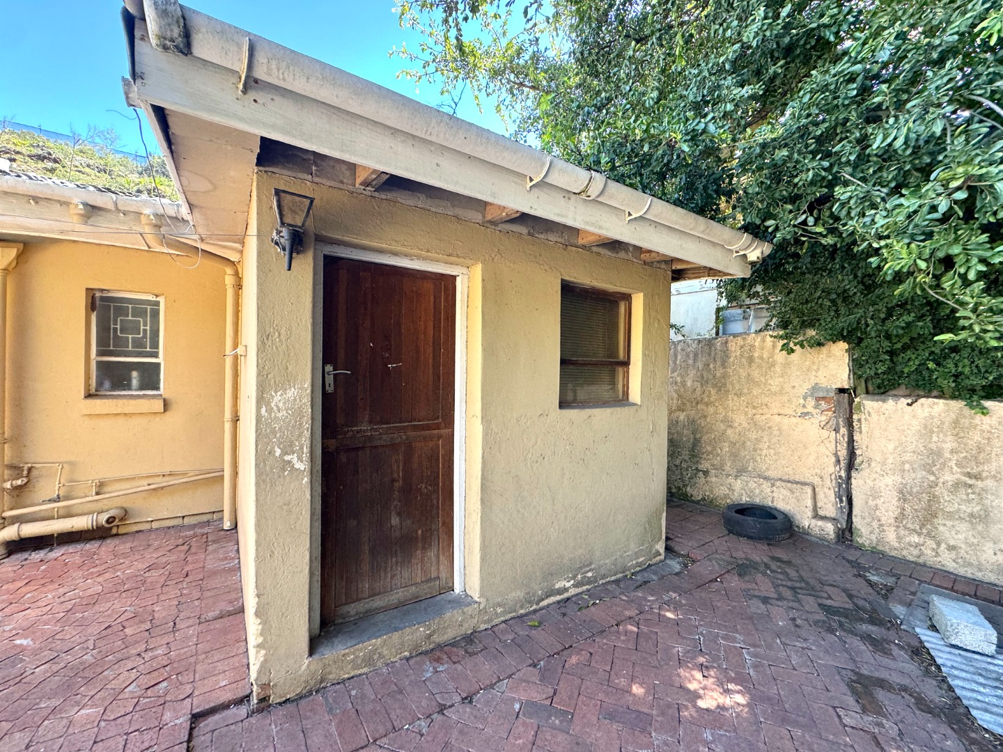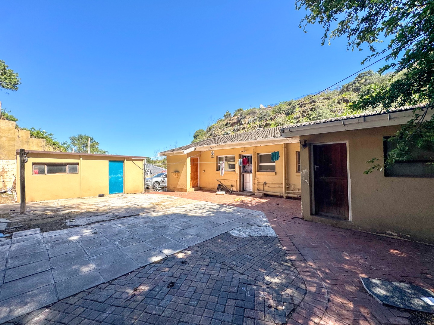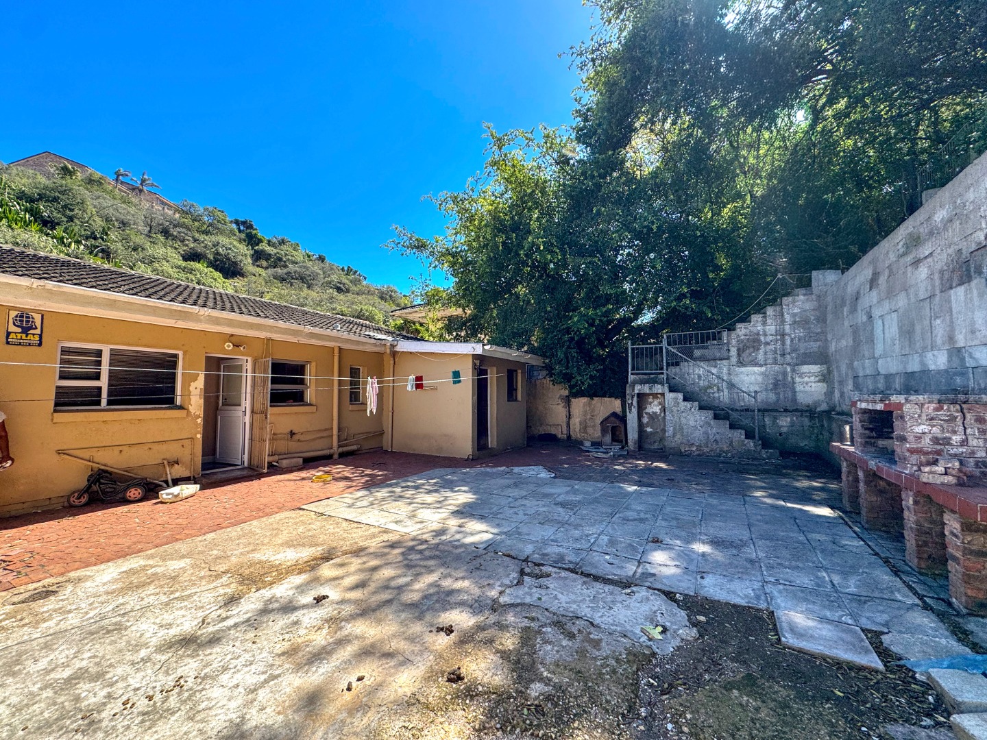 Outdoor living is a key highlight, with expansive paved areas creating a low-maintenance environment ideal for gatherings. A built-in braai area promises enjoyable outdoor cooking and entertainment. The property benefits from a lush, green hillside backdrop, offering a sense of privacy and a natural setting. Parking is well-catered for with a single garage and an additional parking space. For peace of mind, the home is equipped with an alarm system. While the exterior shows signs of wear, this property offers a fantastic canvas to create your dream home in a desirable location.
