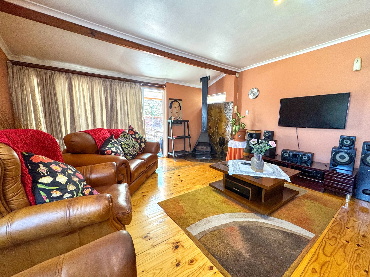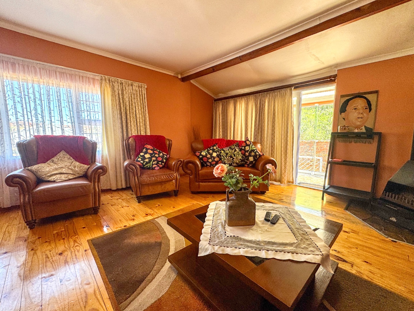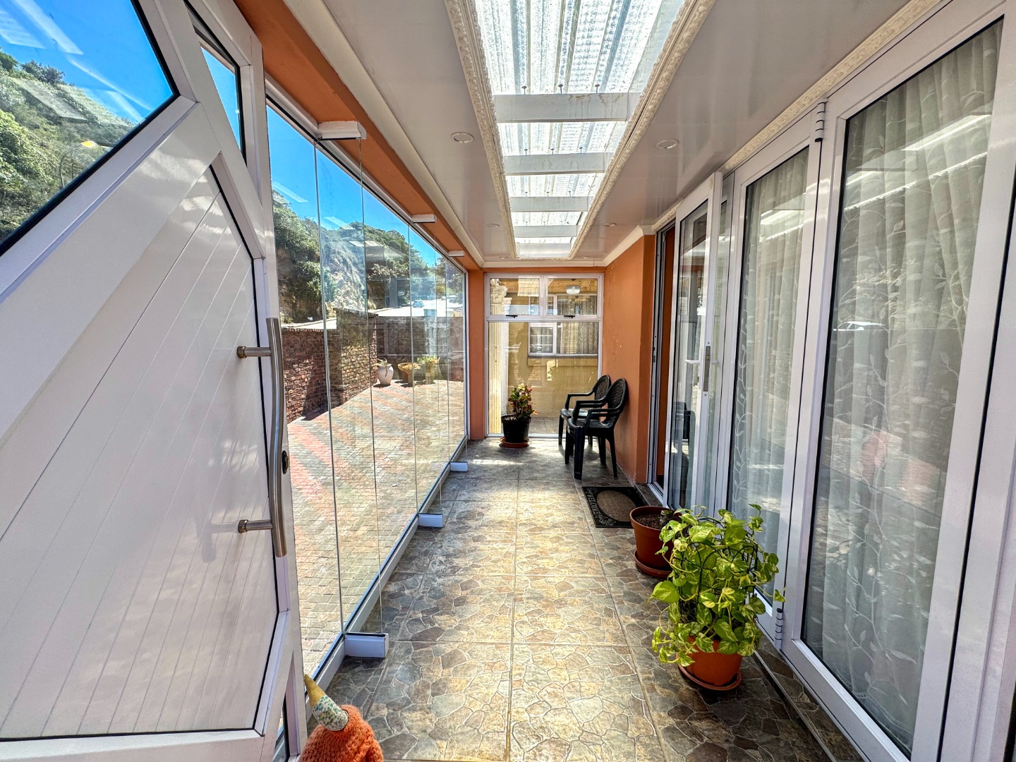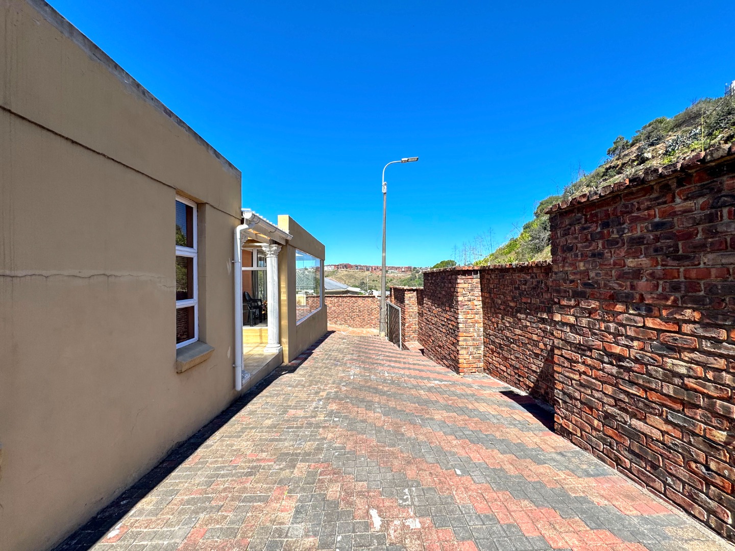 Outdoor living is a key highlight, with expansive paved areas creating a low-maintenance environment ideal for gatherings. A built-in braai area promises enjoyable outdoor cooking and entertainment. The property benefits from a lush, green hillside backdrop, offering a sense of privacy and a natural setting. Parking is well-catered for with a single garage and an additional parking space. For peace of mind, the home is equipped with an alarm system. While the exterior shows signs of wear, this property offers a fantastic canvas to create your dream home in a desirable location.