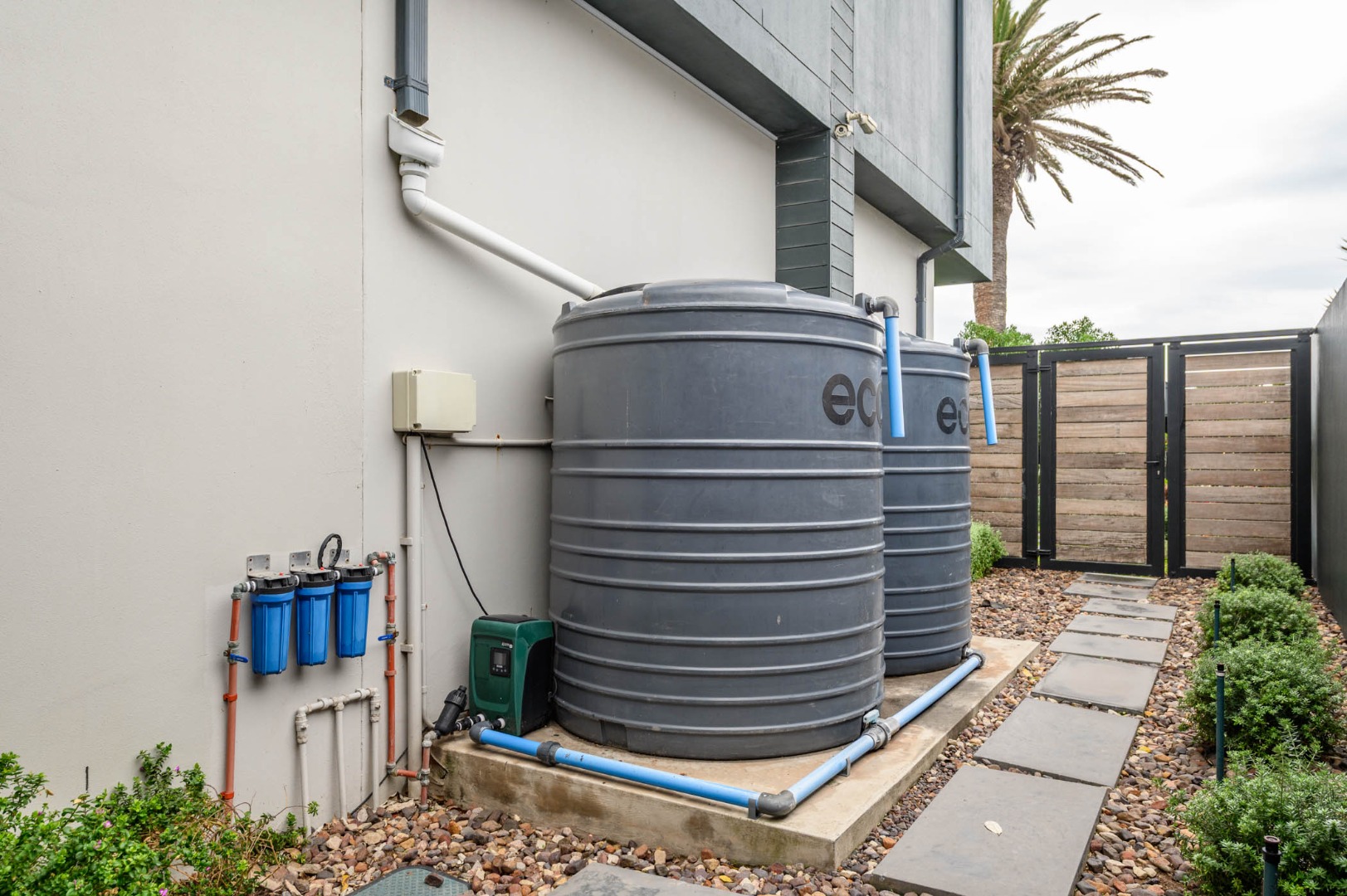 Additional features include a private study, a self-contained one-bedroom flat, two double garages, a carport, electric fencing, a solar power system, and a rainwater harvesting system — all designed with sustainability and security in mind.