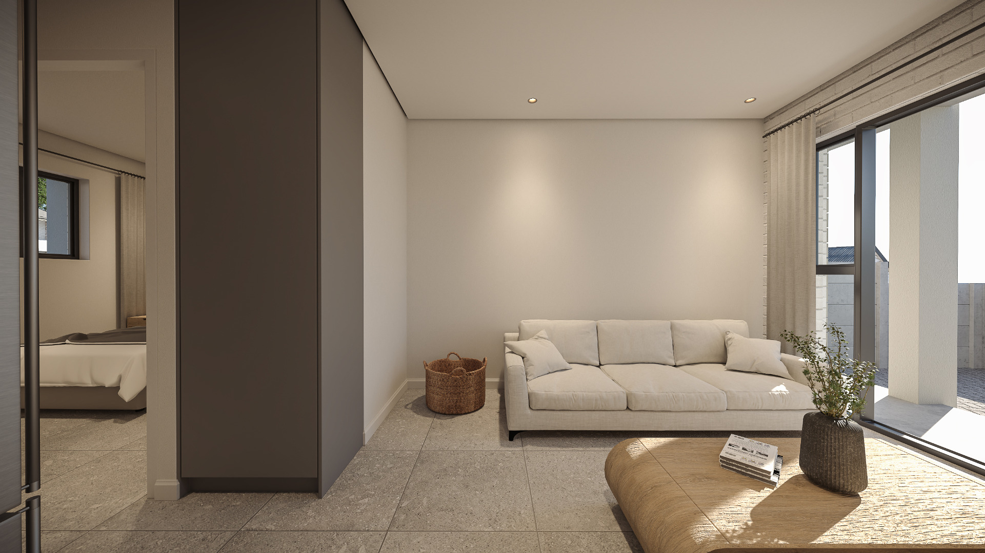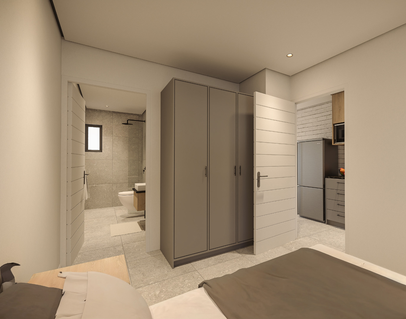 The open-plan layout creates a comfortable flow between the kitchen and living area, leading out to a covered patio with built-in braai, ideal for relaxed everyday living. The bedroom is well-proportioned, complemented by a modern bathroom.