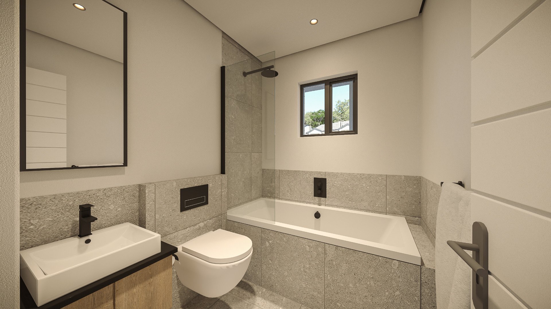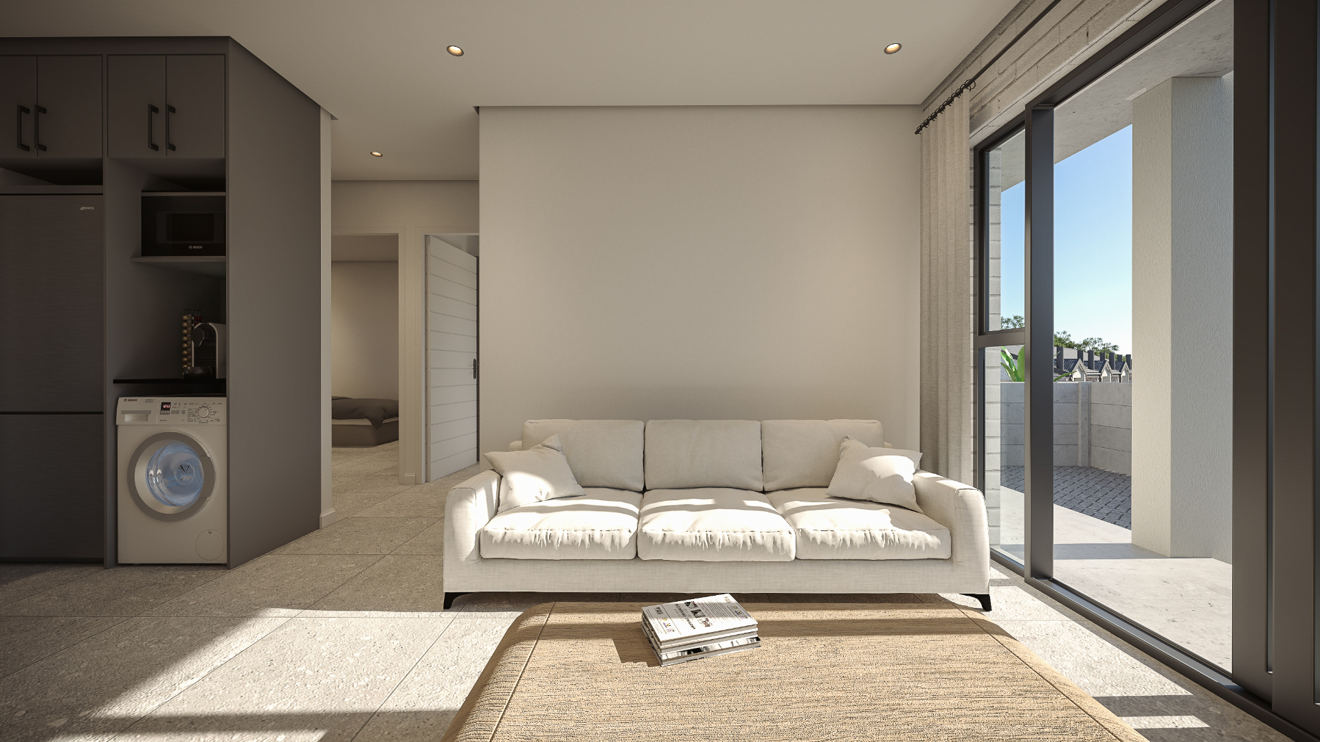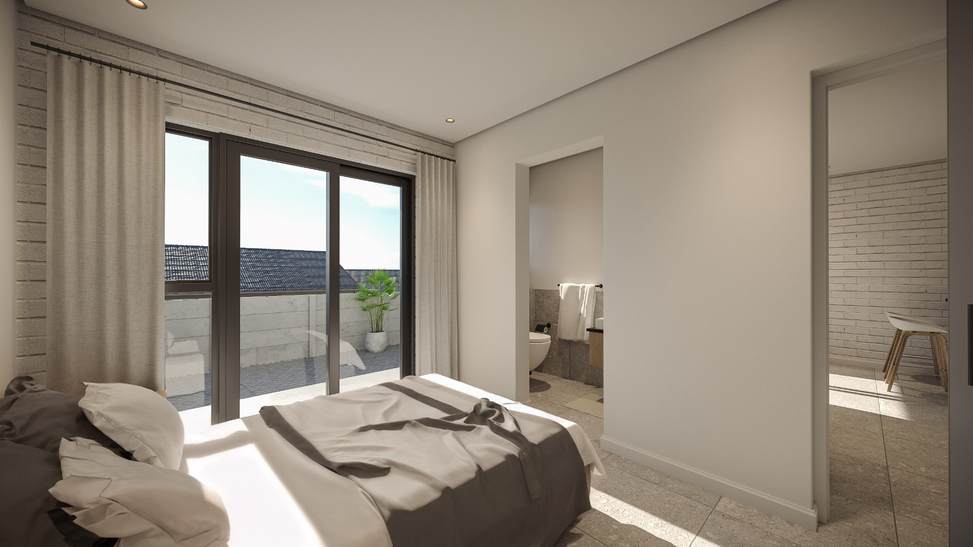 Designed for easy, low-maintenance living, the open-plan kitchen and living area create a bright, functional space. The main bathroom features a bath with a shower over, toilet and basin, while the en-suite includes a shower, toilet and basin. The main bedroom opens with a sliding door onto the covered balcony, while the lounge also leads out to the same balcony, creating seamless indoor-outdoor flow. The balcony includes a built-in braai, ideal for relaxed entertaining with elevated privacy.