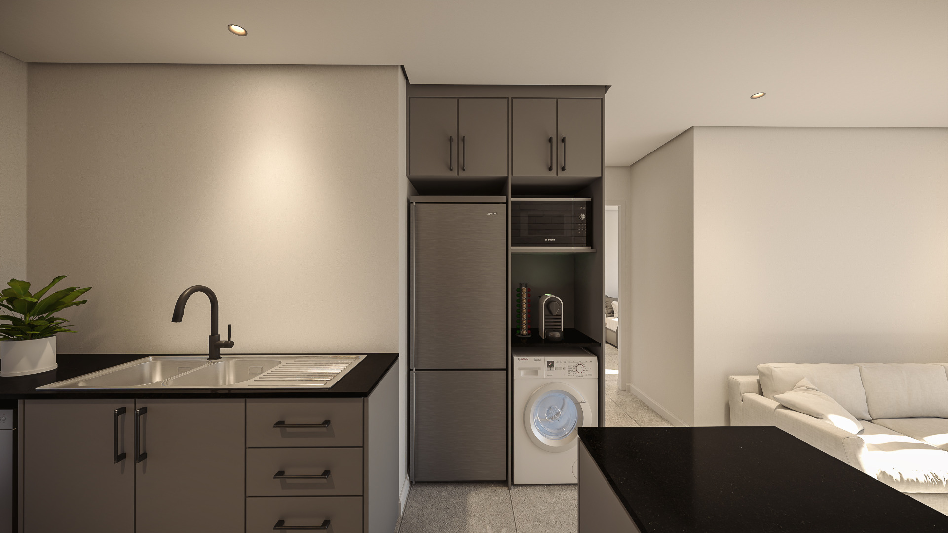This stylish top floor apartment offers the same generous layout at a more accessible price point and features two well-sized bedrooms, including a main bedroom with en-suite.