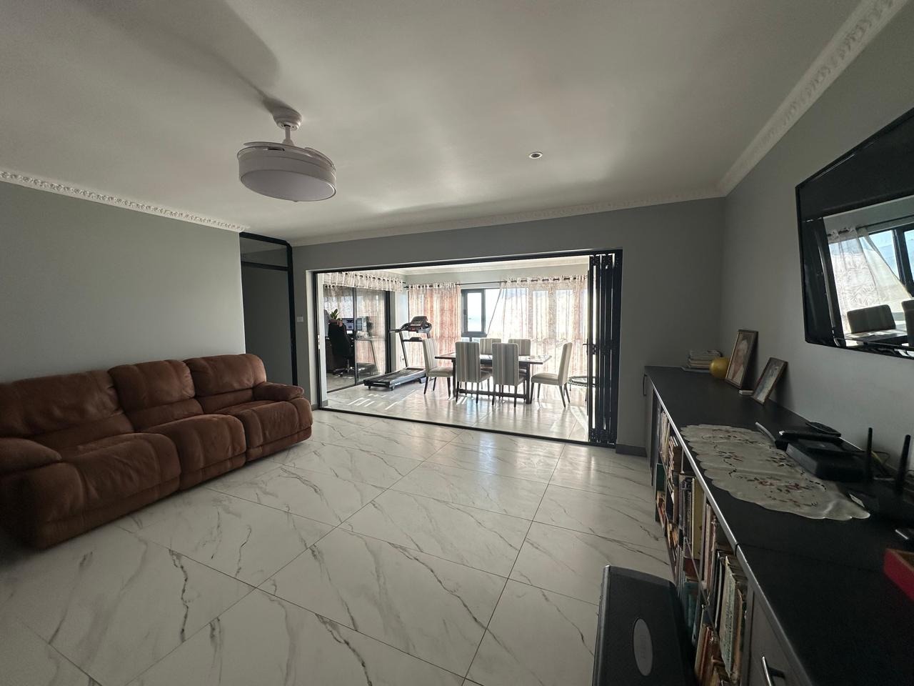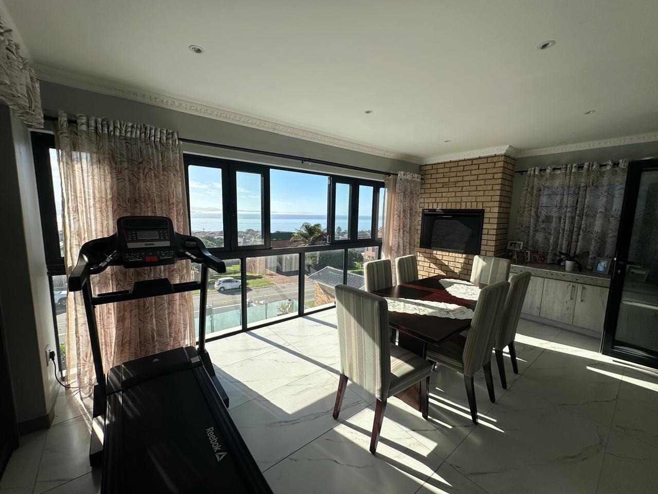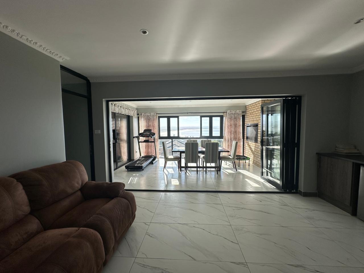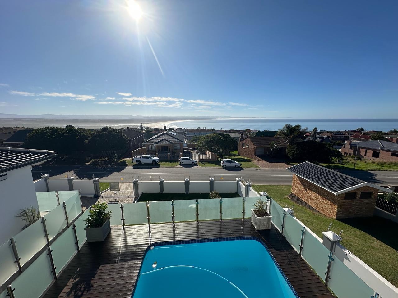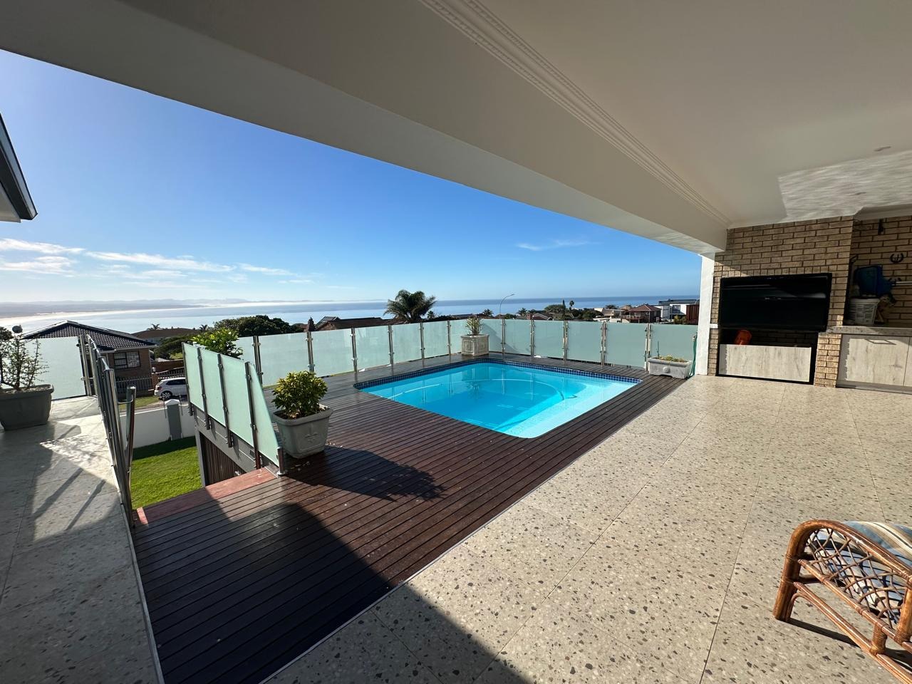 The open-plan lounge, dining, and kitchen area is ideal for family living, complemented by a large separate scullery. A second living room opens to a covered braai patio and a sparkling pool, where beautiful mountain and sea views form the perfect backdrop for relaxed entertaining.