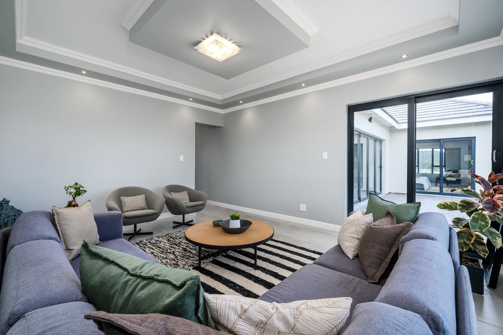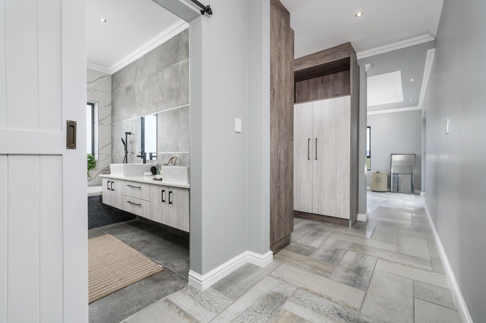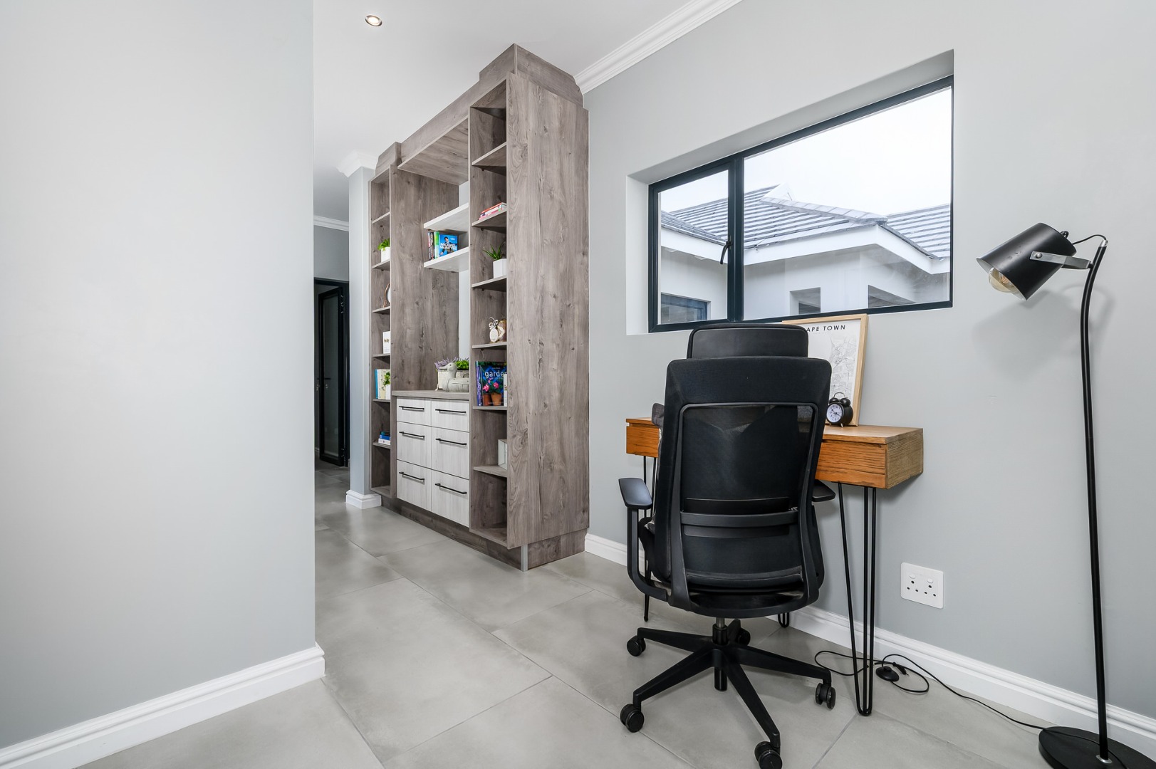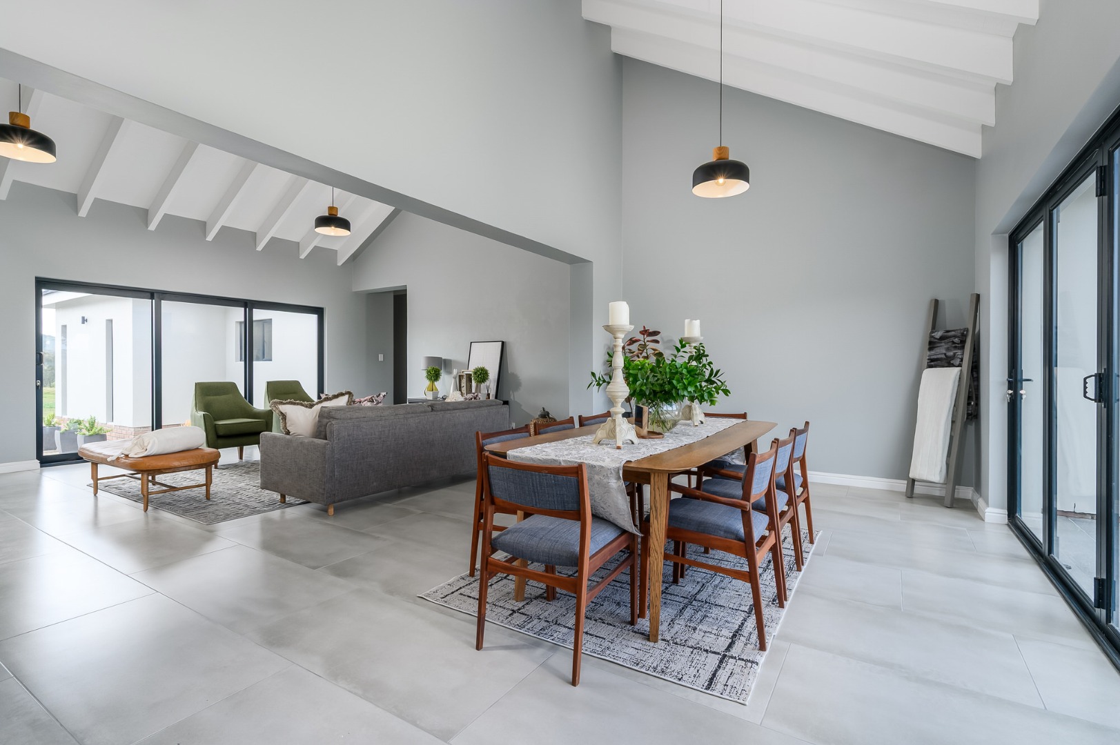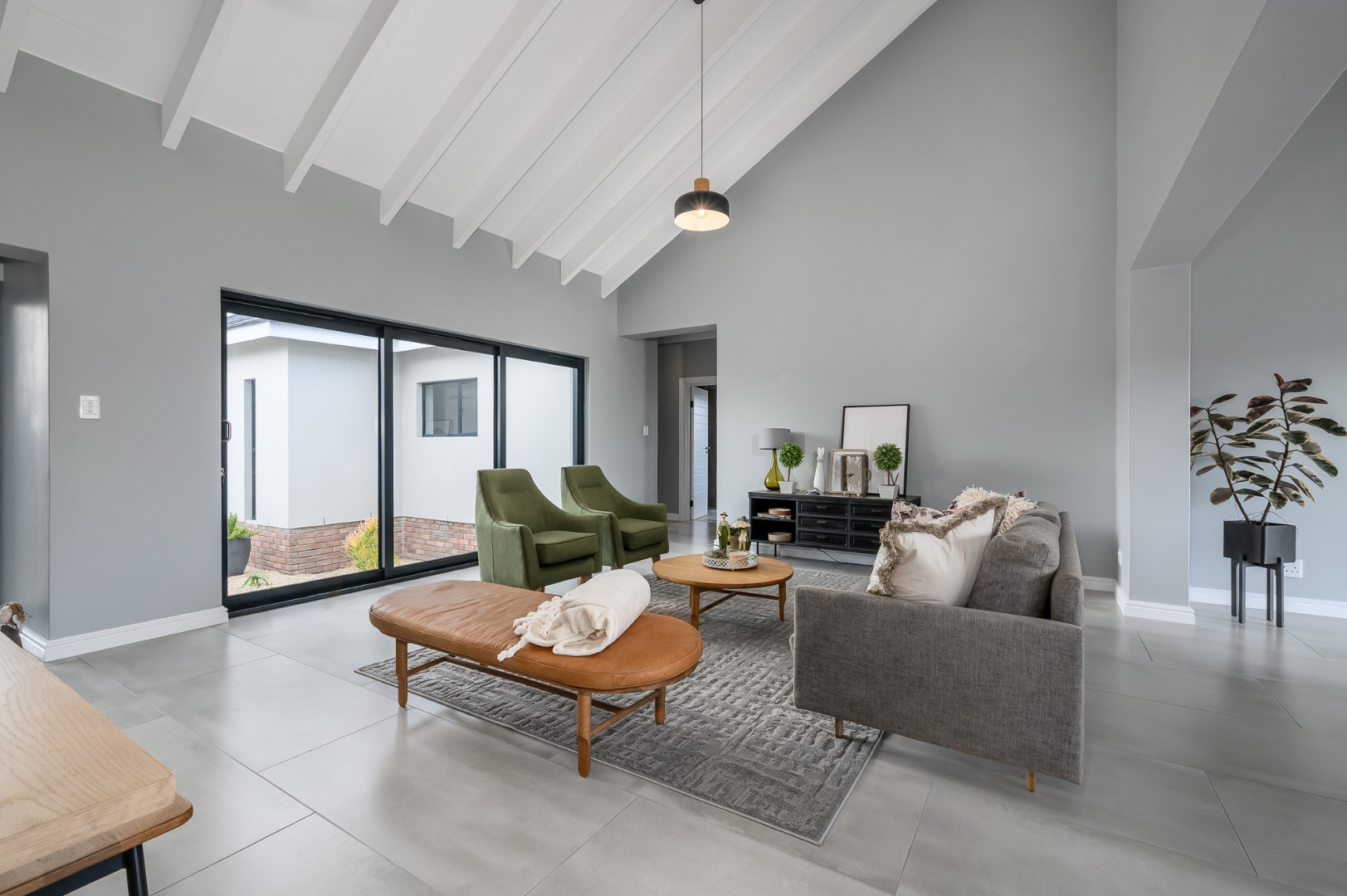 This immaculate residence boasts four spacious bedrooms, three stylish bathrooms (including two en-suites), and a convenient guest toilet. The heart of the home offers double-volume living areas filled with natural light, creating a warm and inviting atmosphere. An entertainment room with built-in braai and stacking doors seamlessly flows out to the rear garden and patio, perfect for hosting friends and family.