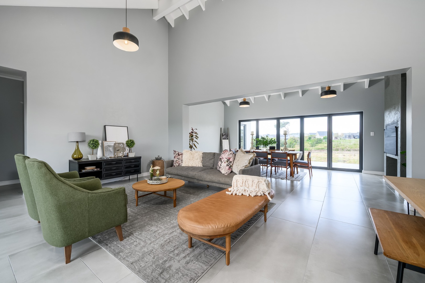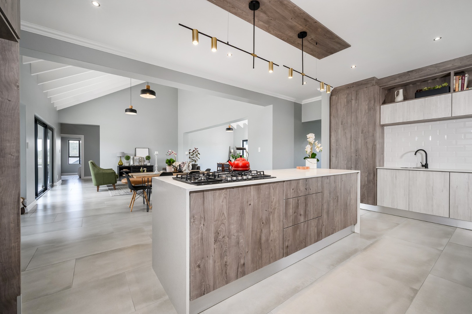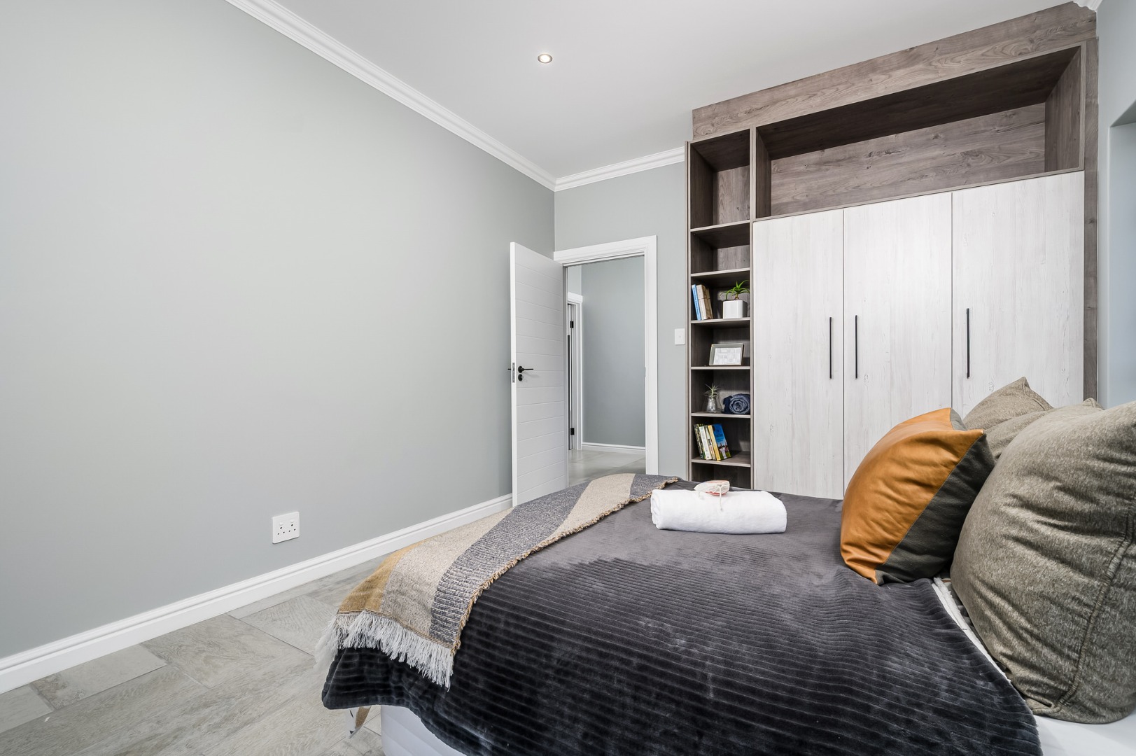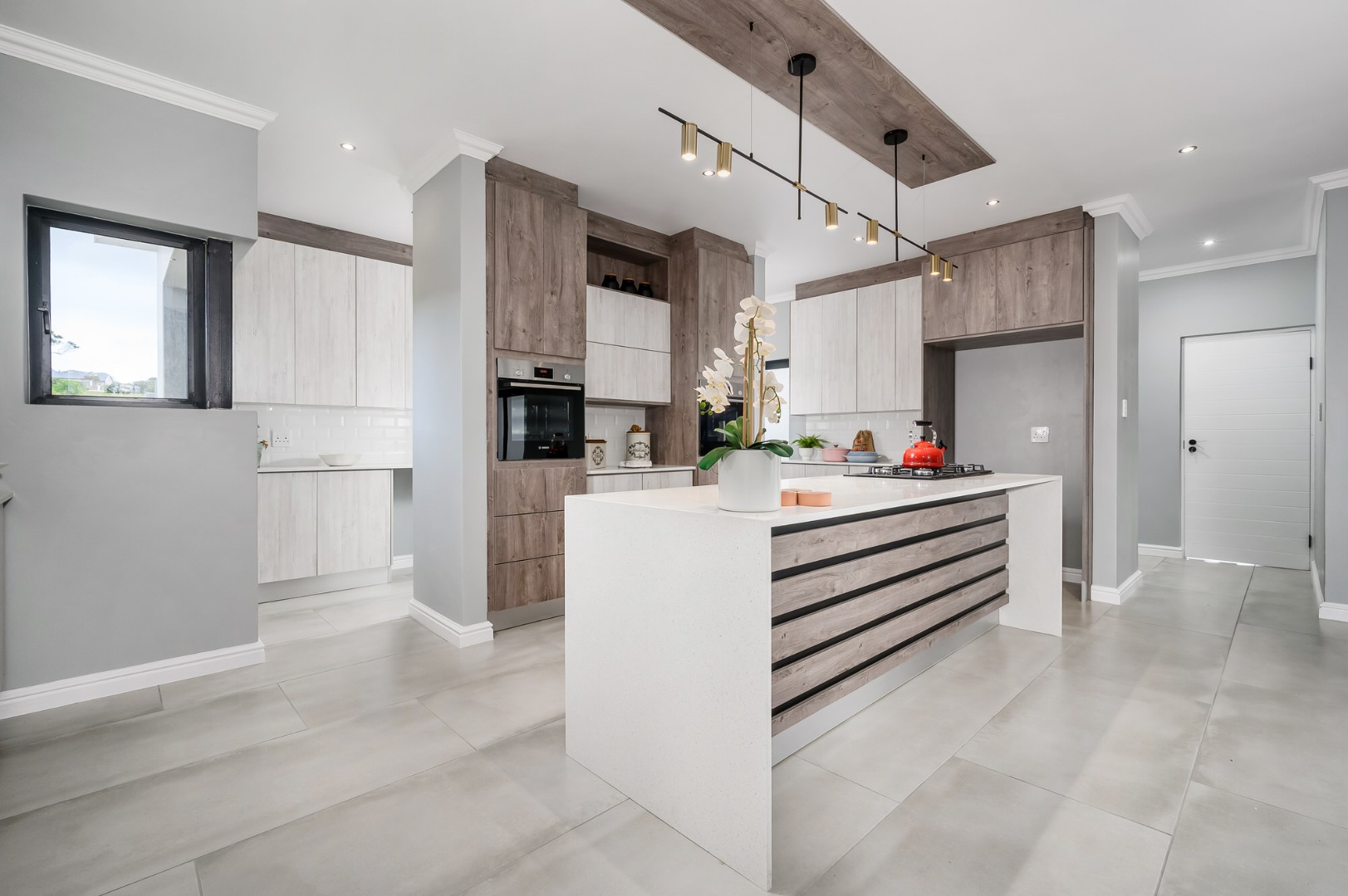 This immaculate residence boasts four spacious bedrooms, three stylish bathrooms (including two en-suites), and a convenient guest toilet. The heart of the home offers double-volume living areas filled with natural light, creating a warm and inviting atmosphere. An entertainment room with built-in braai and stacking doors seamlessly flows out to the rear garden and patio, perfect for hosting friends and family.