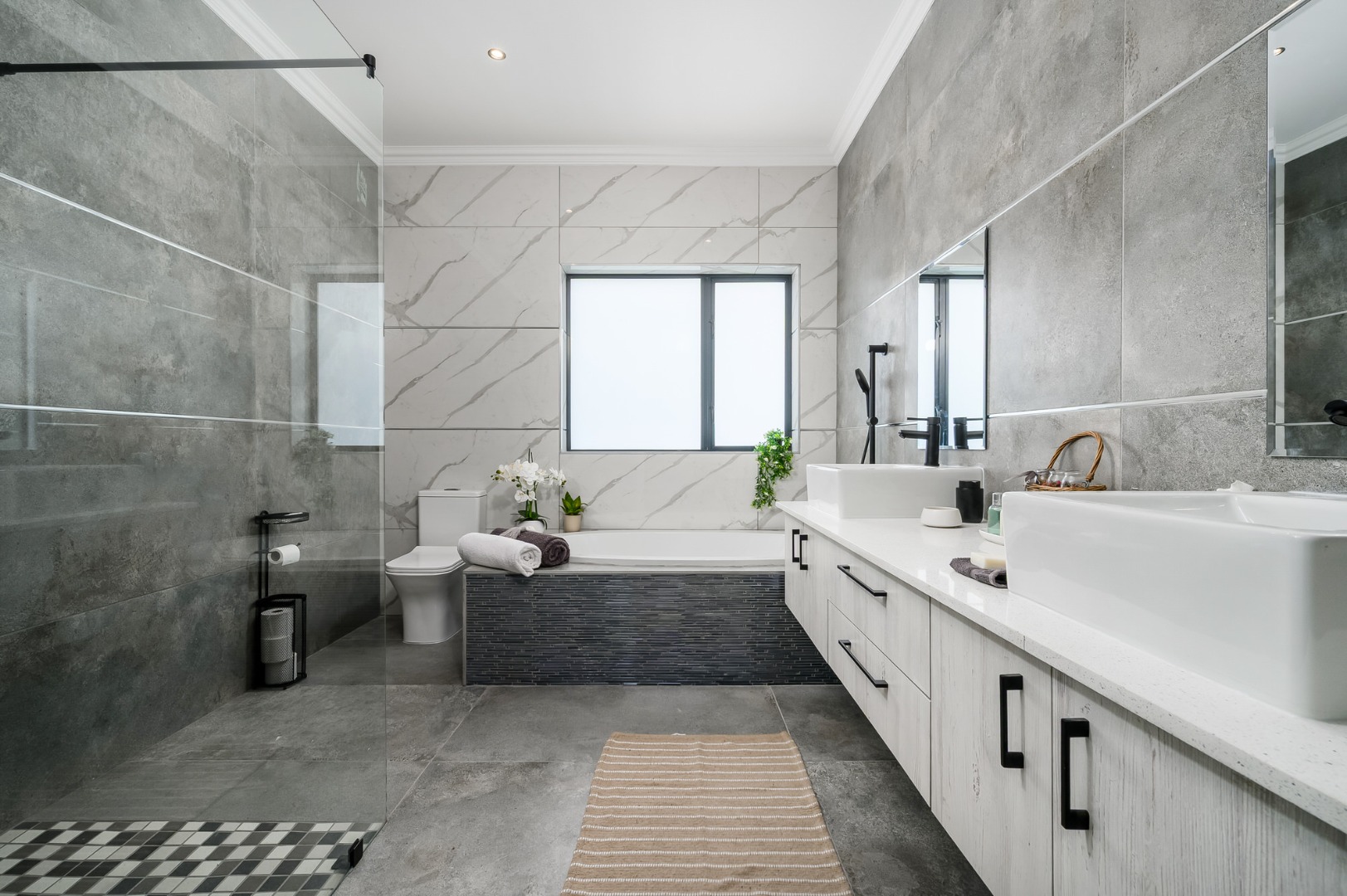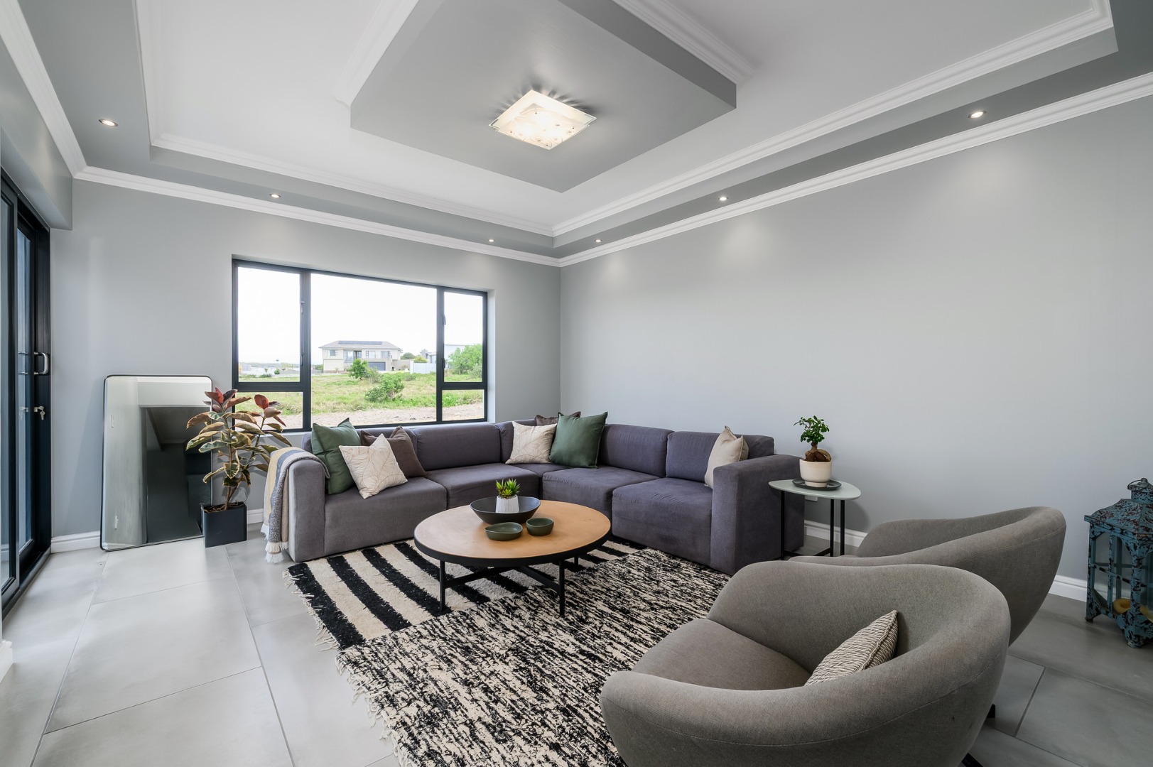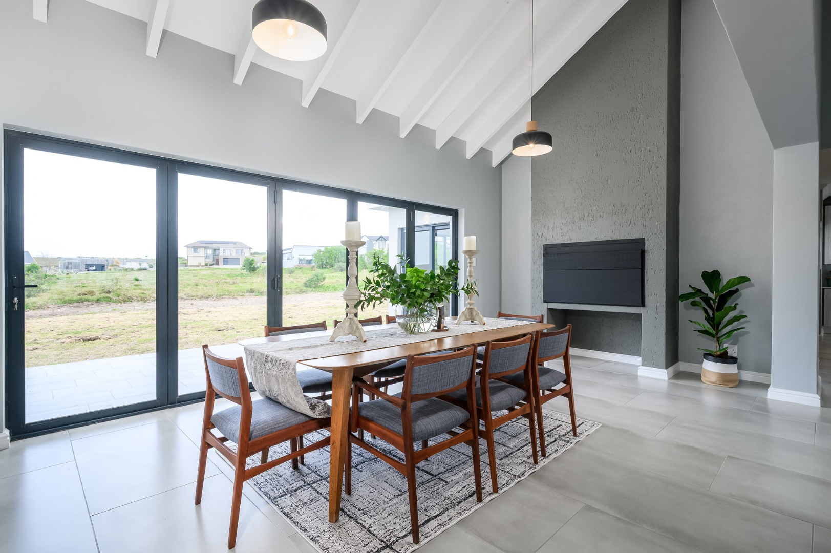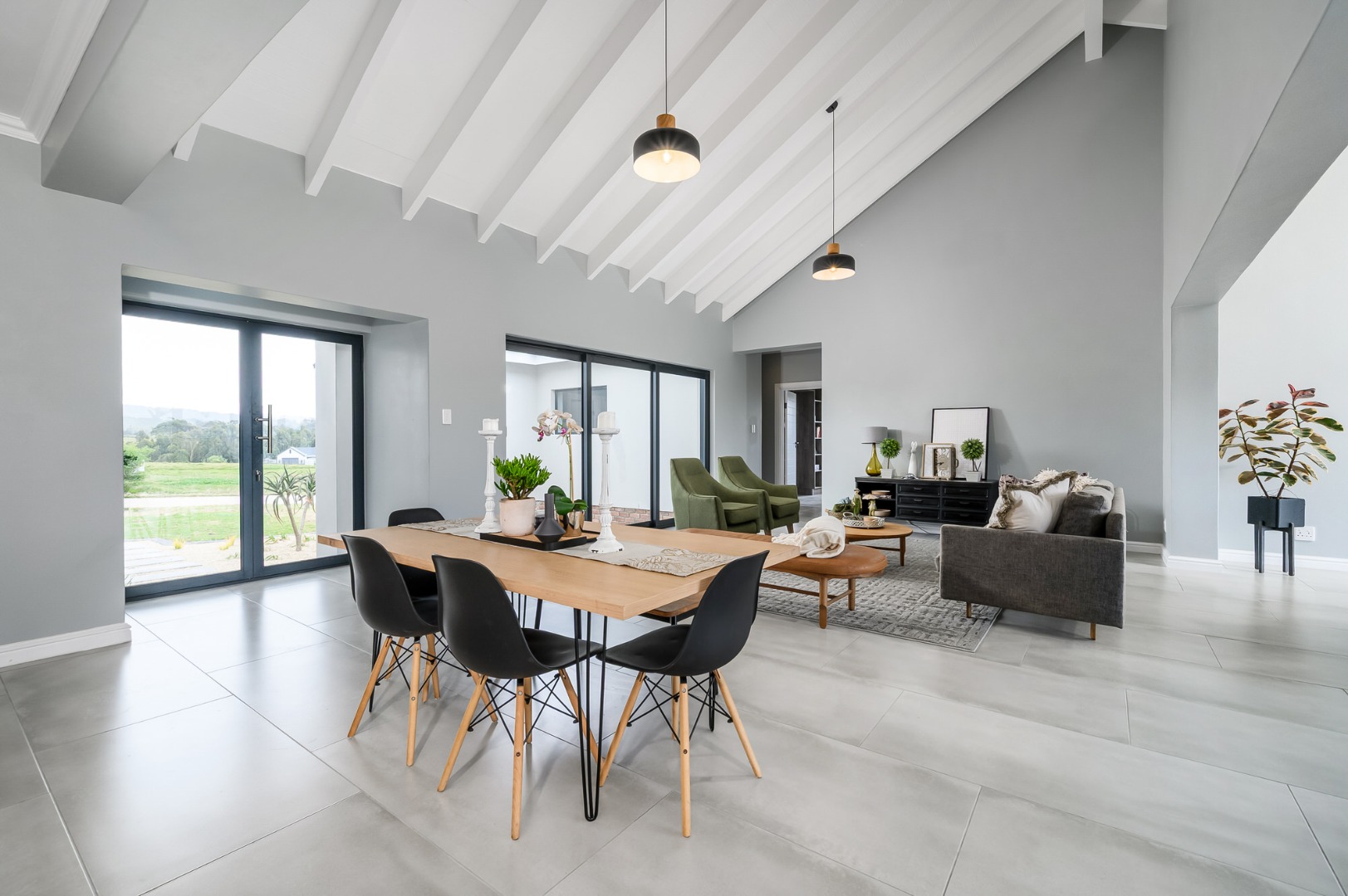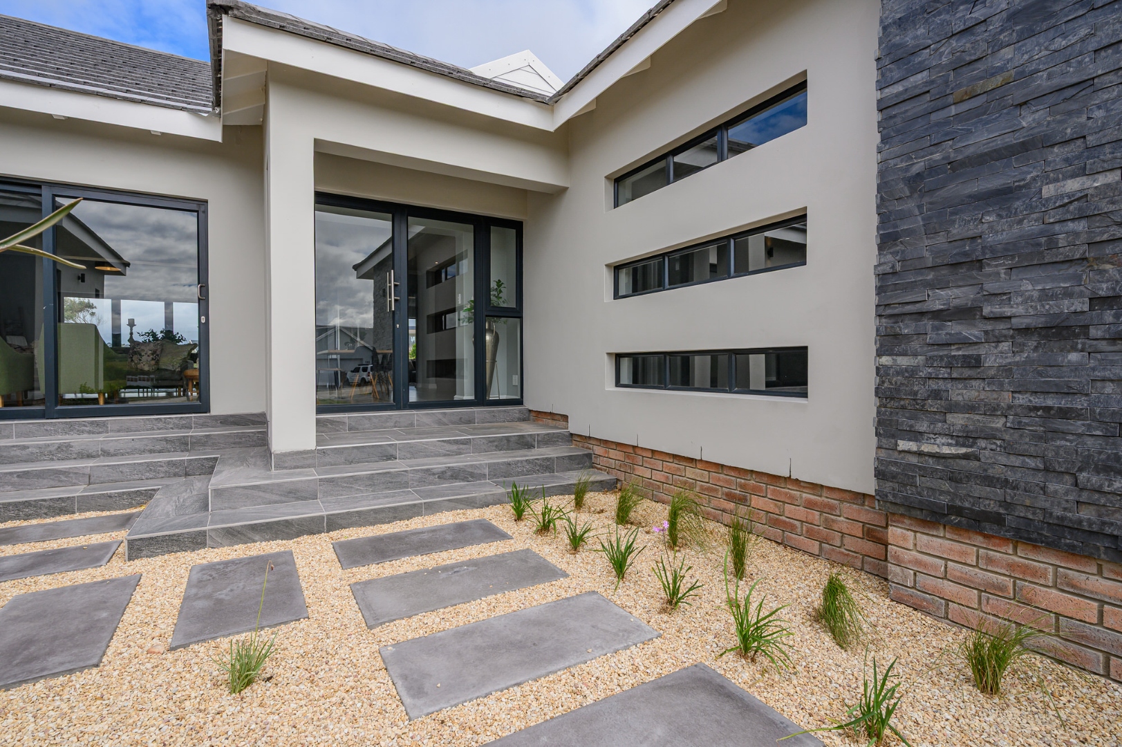 This immaculate residence boasts four spacious bedrooms, three stylish bathrooms (including two en-suites), and a convenient guest toilet. The heart of the home offers double-volume living areas filled with natural light, creating a warm and inviting atmosphere. An entertainment room with built-in braai and stacking doors seamlessly flows out to the rear garden and patio, perfect for hosting friends and family.