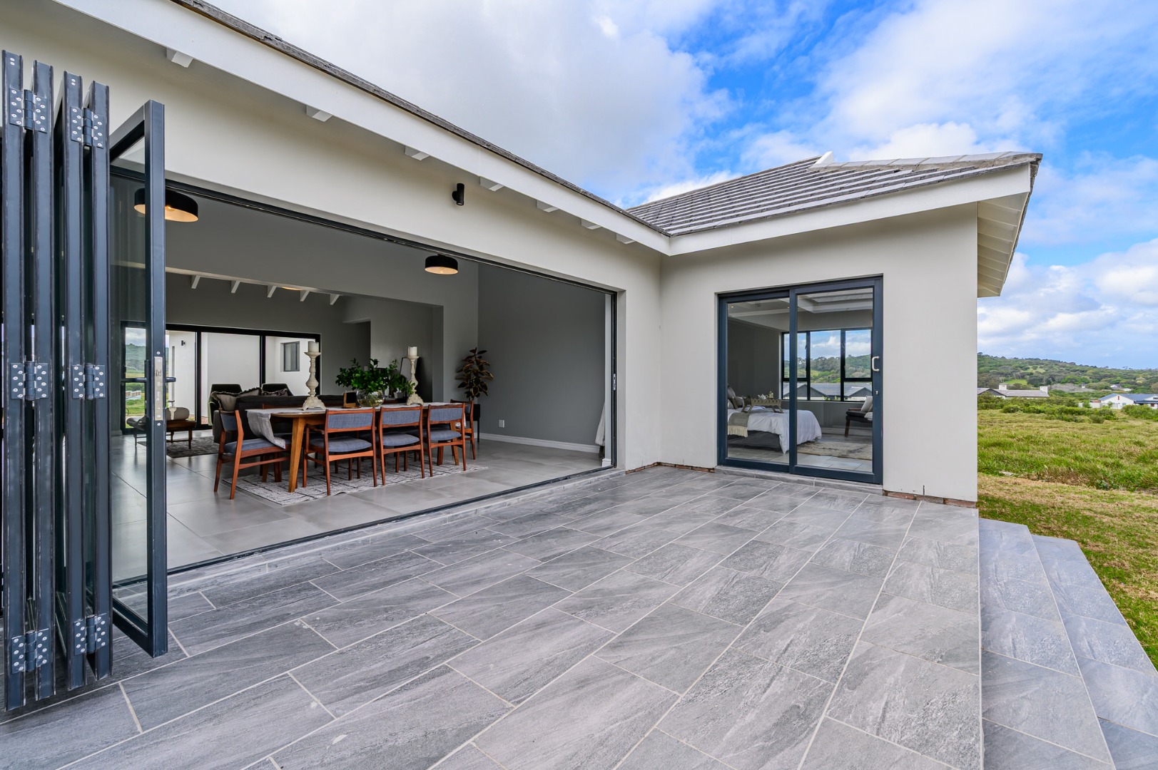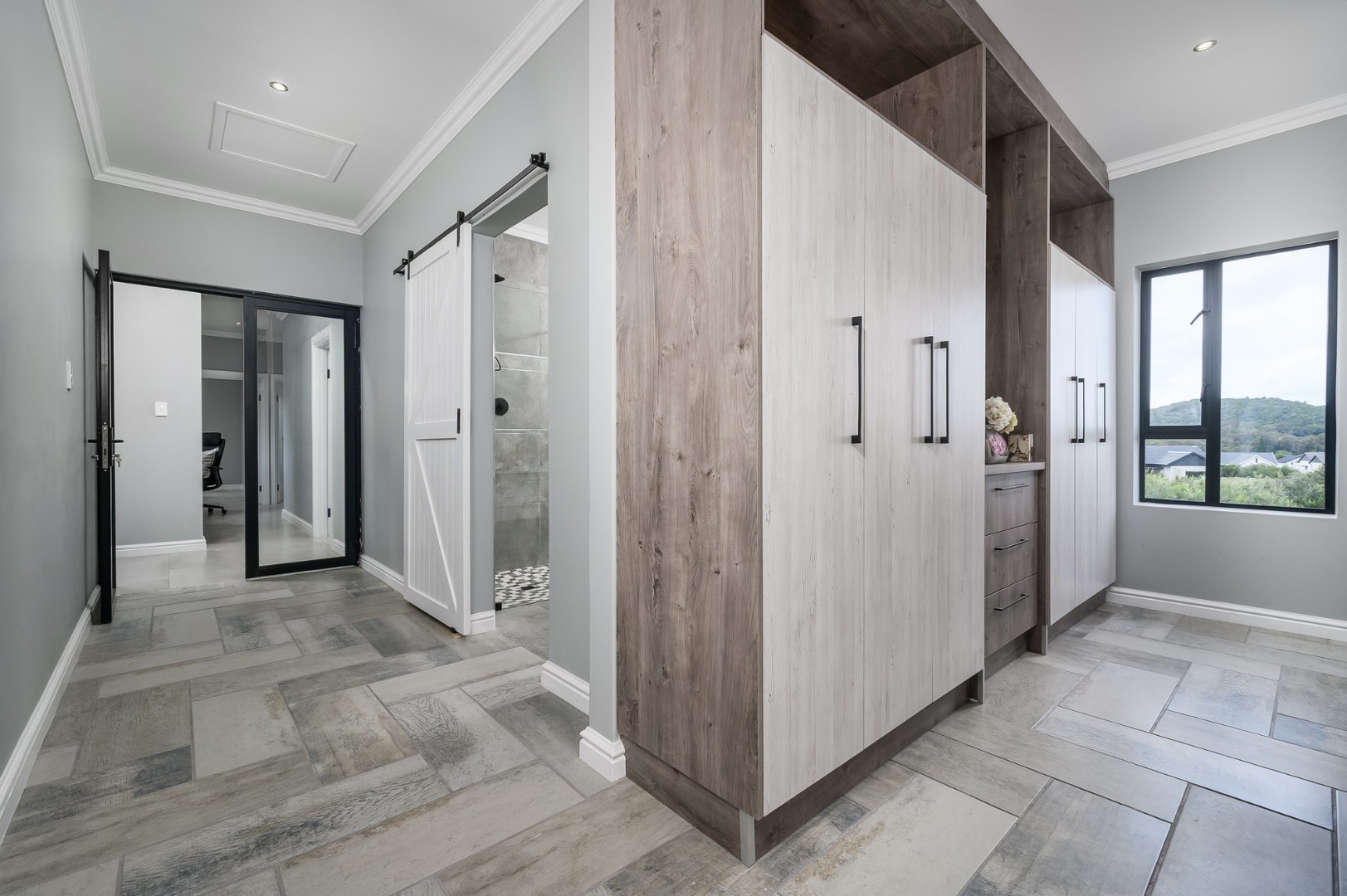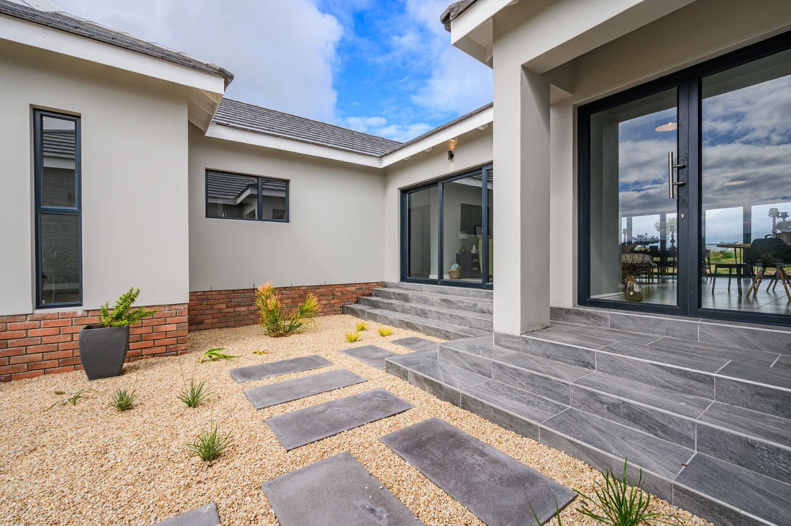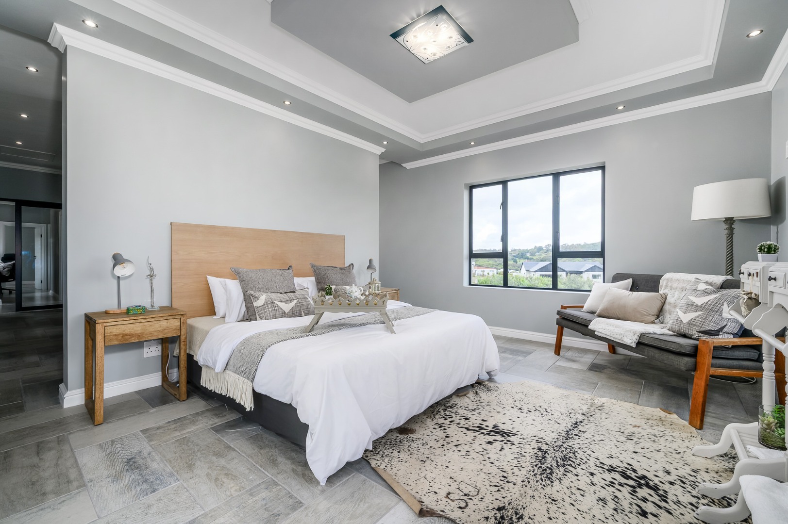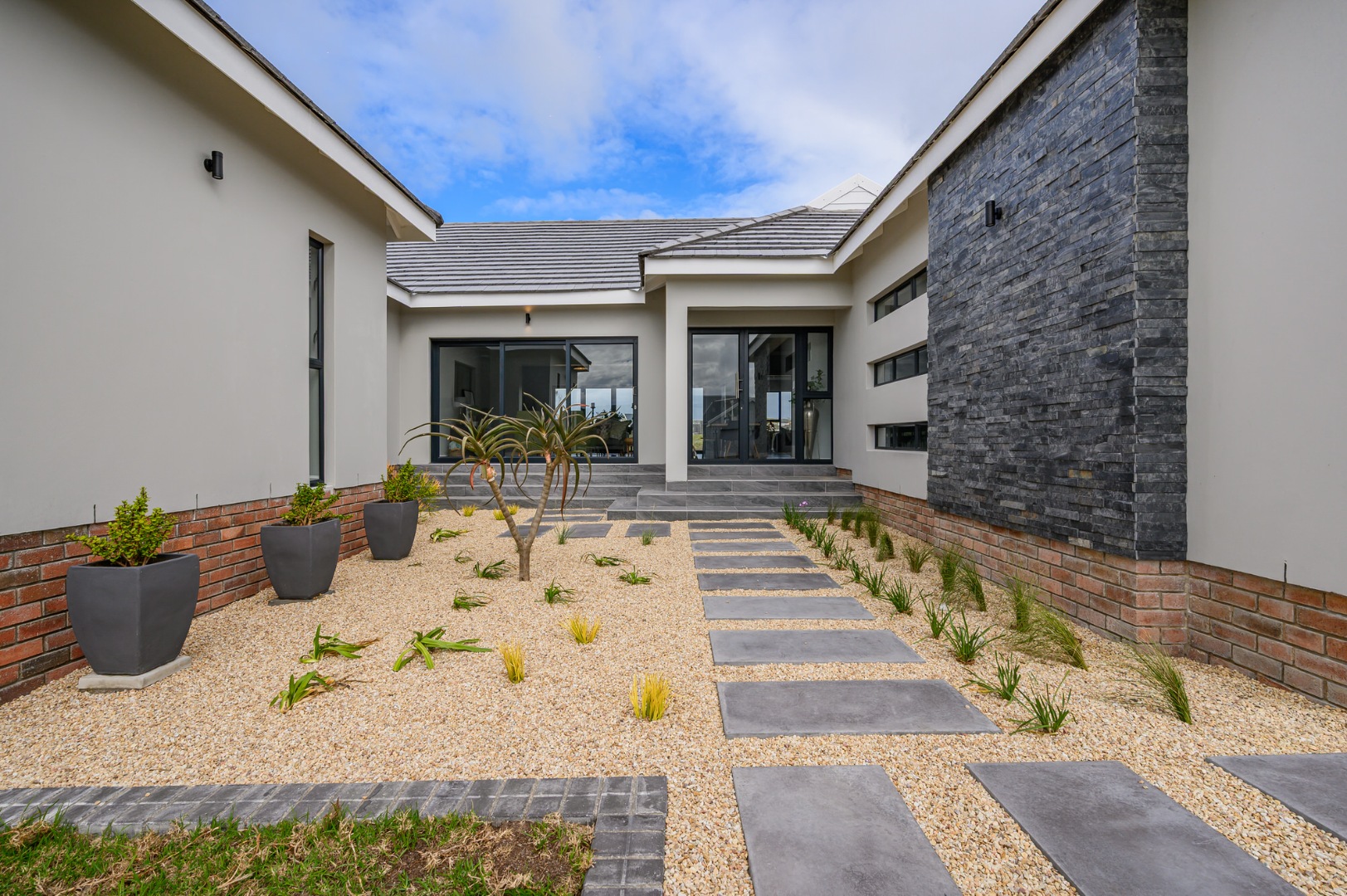 This immaculate residence boasts four spacious bedrooms, three stylish bathrooms (including two en-suites), and a convenient guest toilet. The heart of the home offers double-volume living areas filled with natural light, creating a warm and inviting atmosphere. An entertainment room with built-in braai and stacking doors seamlessly flows out to the rear garden and patio, perfect for hosting friends and family.