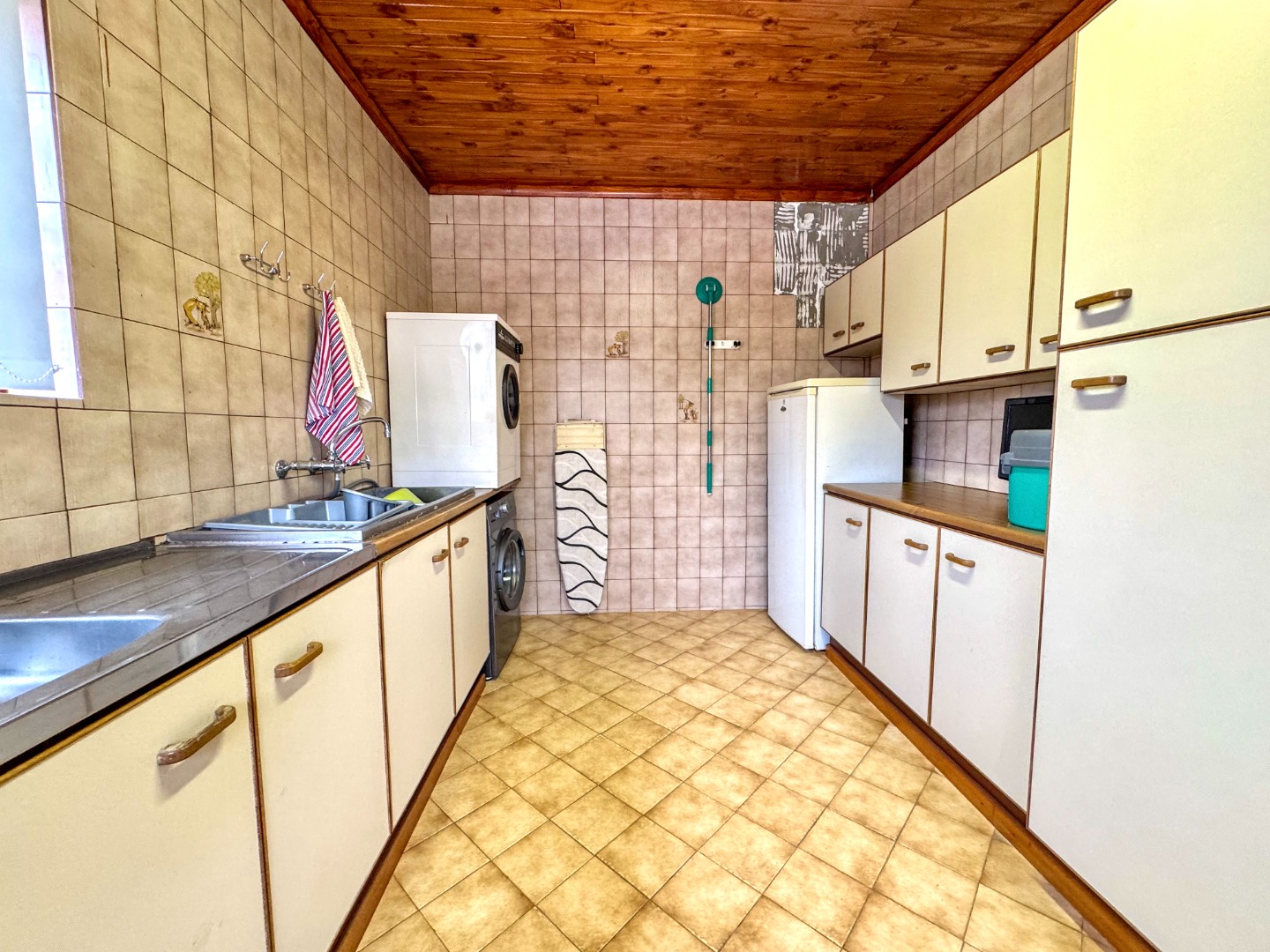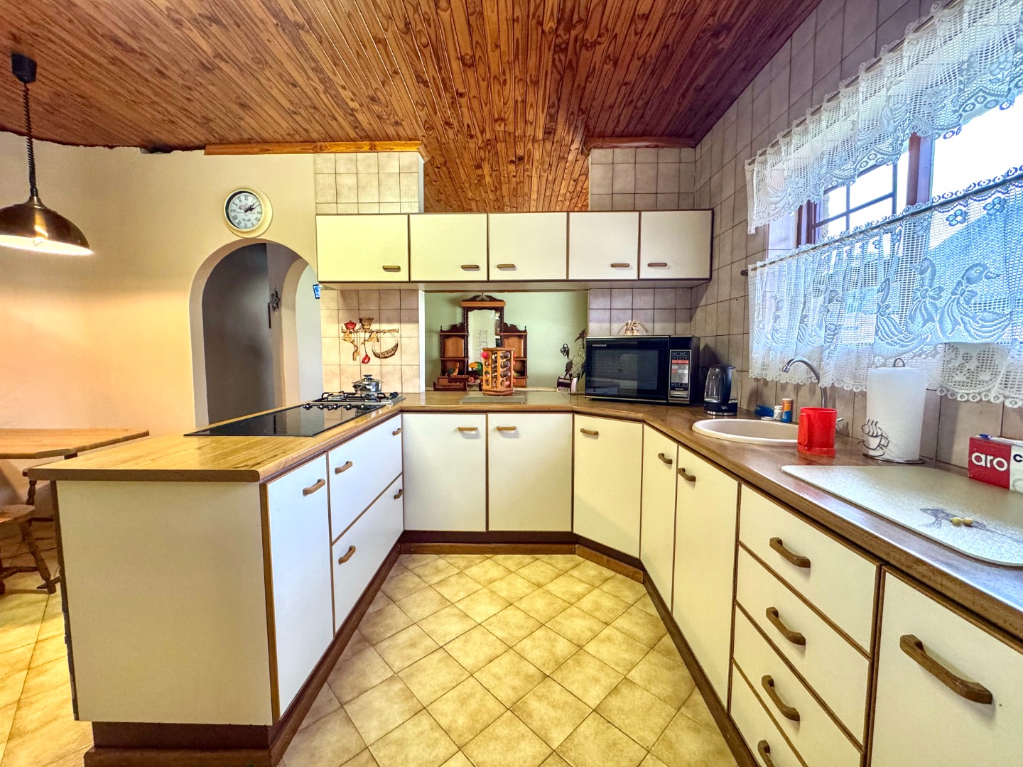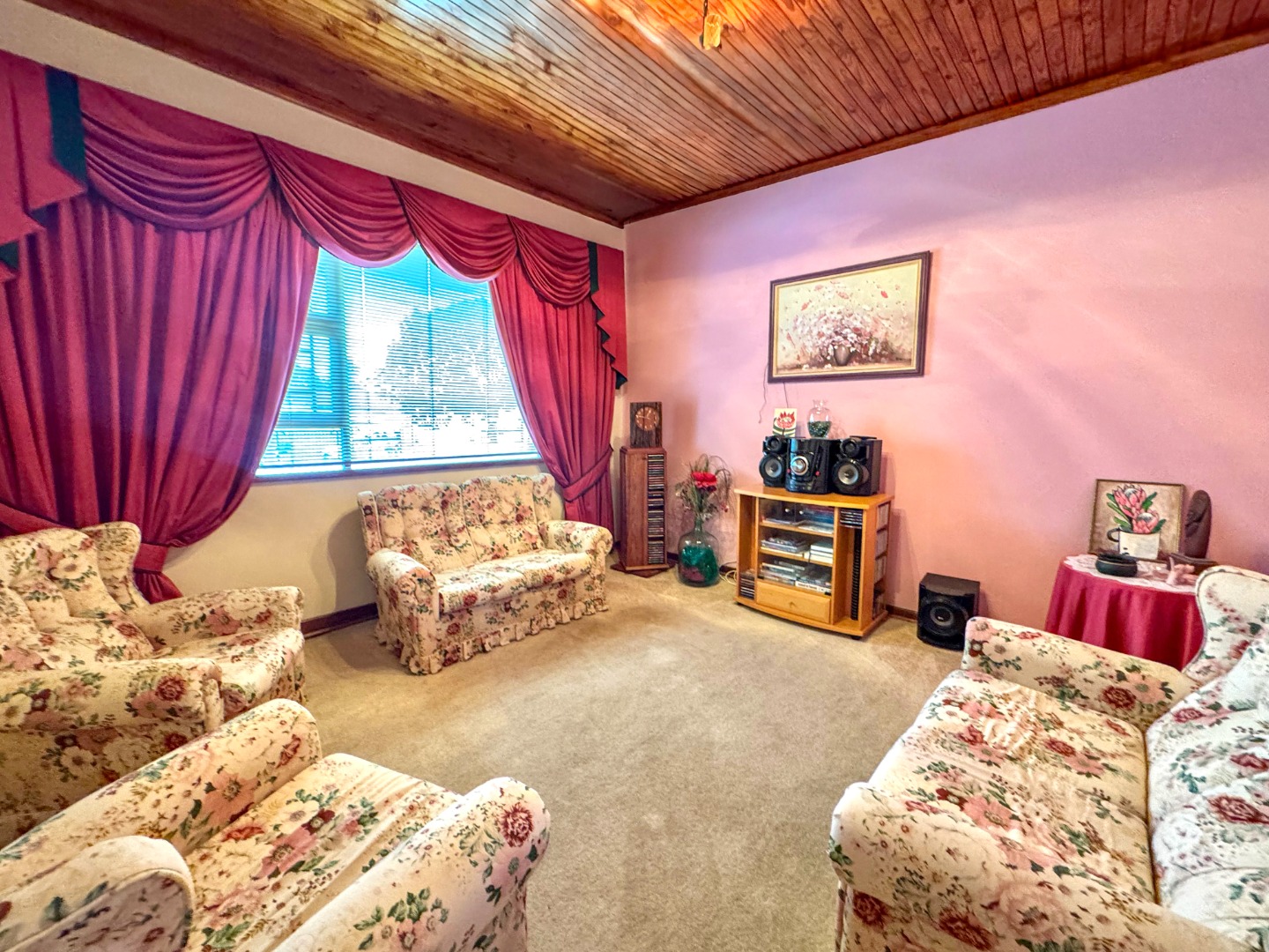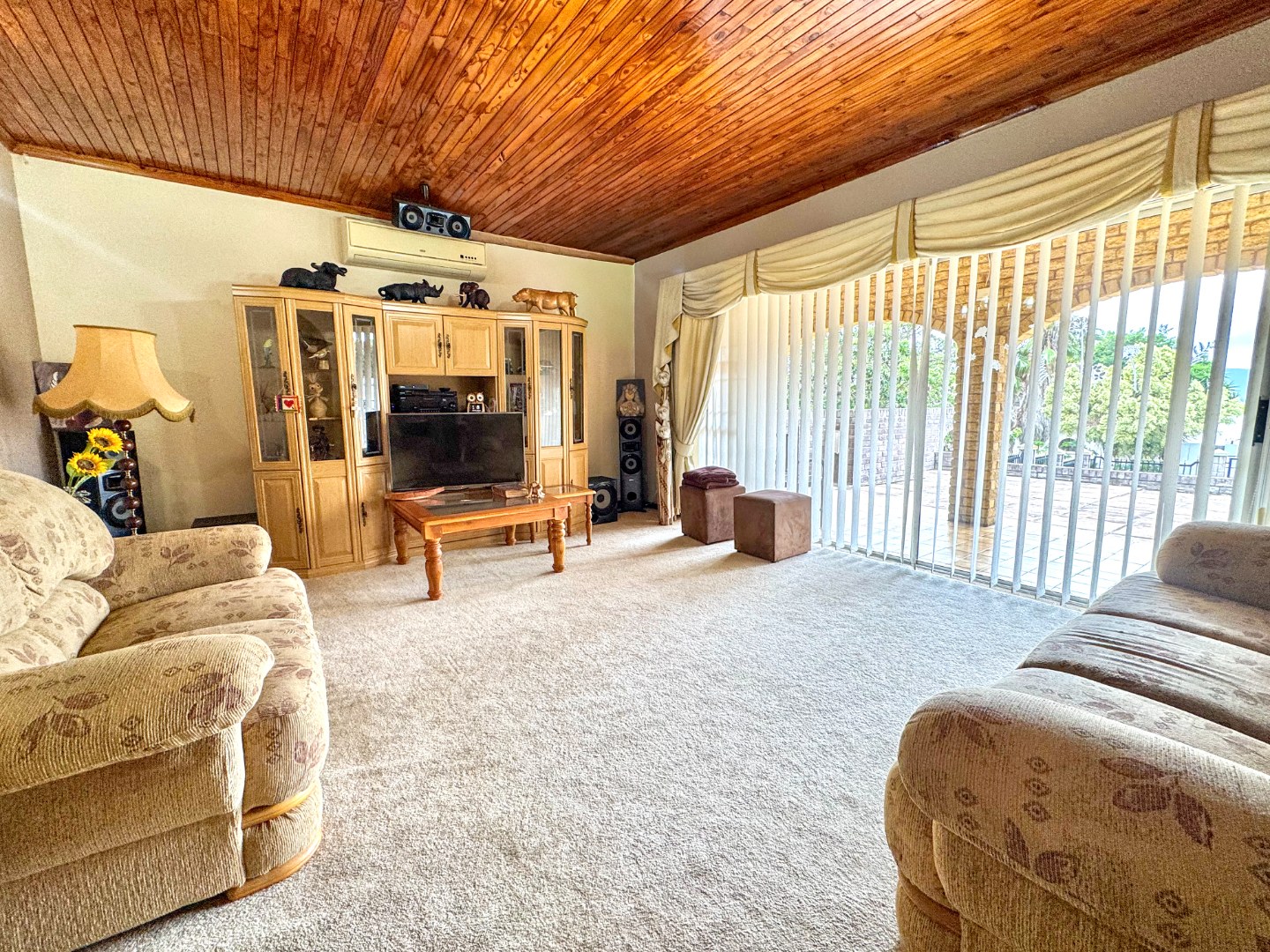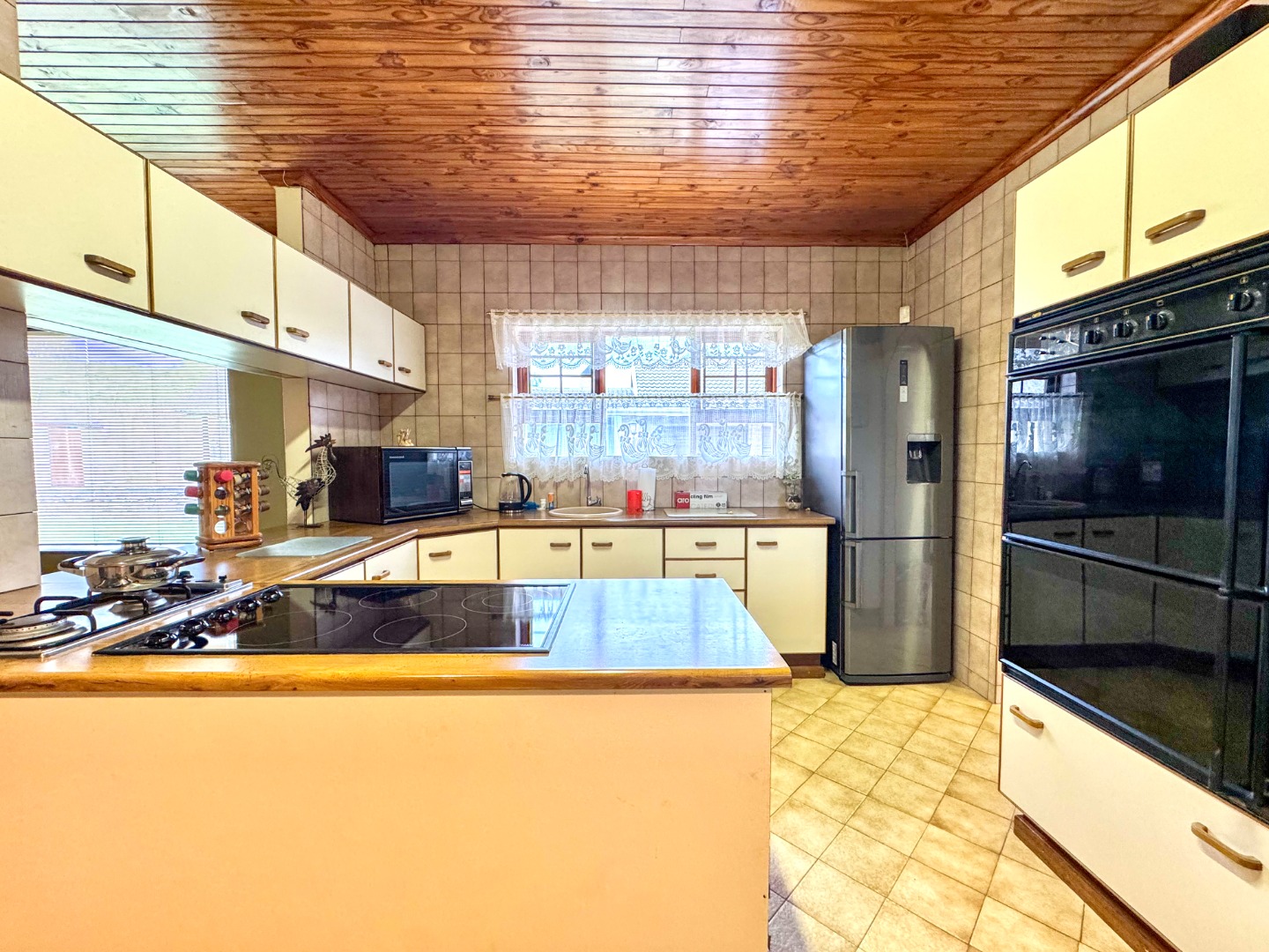 Inside, the home boasts two lounges and a dedicated dining room, offering versatile living spaces. Distinctive wooden slatted ceilings add character to several rooms, including the kitchen and living areas. The kitchen is equipped with ample cabinetry, a built-in oven, and both gas and electric cooktop options, providing functionality for daily needs. Large sliding doors in the main living area allow for abundant natural light and provide access to the outdoor spaces, while air conditioning ensures comfort throughout.