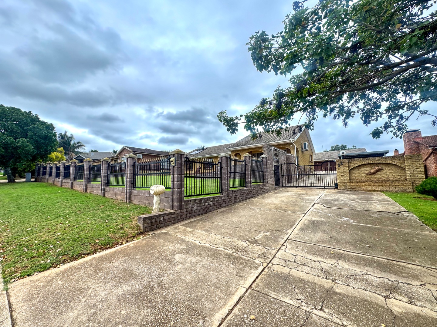 Upon arrival, the property presents a secure kerb appeal with a brick and wrought iron fence as well as an access gate. The well-maintained front lawn enhance the welcoming exterior. The residence features a durable brick construction with appealing architectural arches and a tiled roof, complemented by a large paved driveway leading to four garages.
