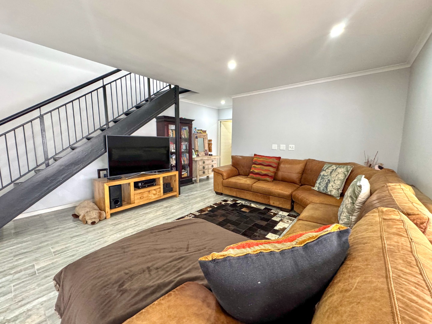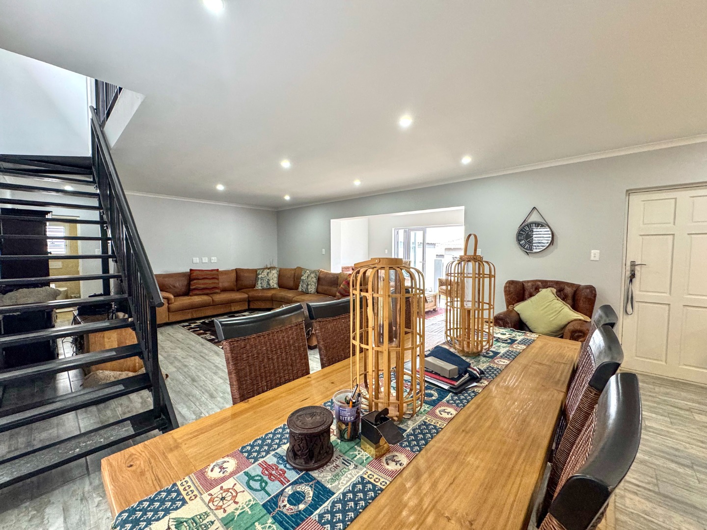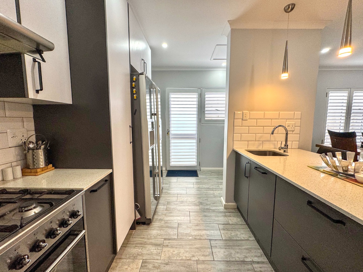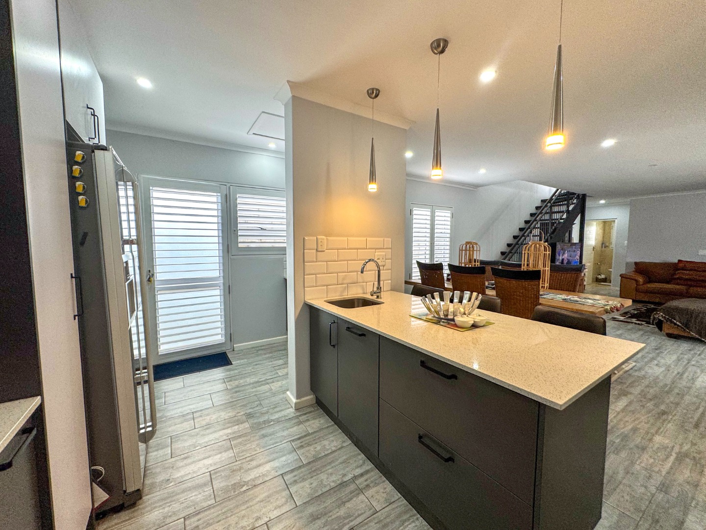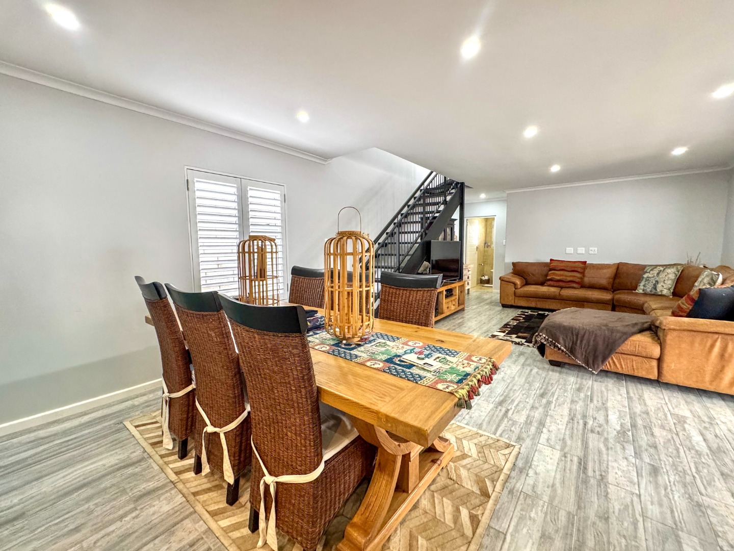 Discover modern living in this inviting 3-bedroom, 3-bathroom residence located within a secure estate in Lorraine, Port Elizabeth. This furnished home offers a contemporary open-plan layout, seamlessly connecting the two spacious lounges, dining area, and a well-appointed kitchen. The interior features stylish wood-look tiled flooring, recessed lighting, and a striking modern metal staircase. The kitchen is equipped with sleek white and dark cabinetry, complemented by a subway tile backsplash, providing a functional and aesthetically pleasing space for culinary activities.