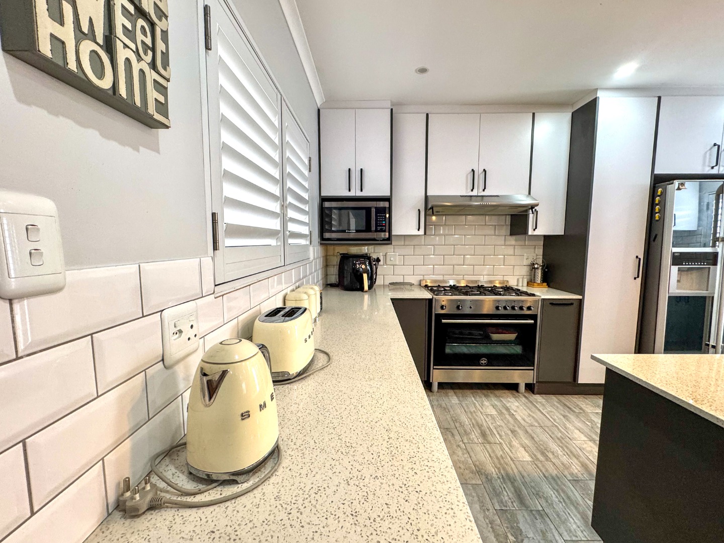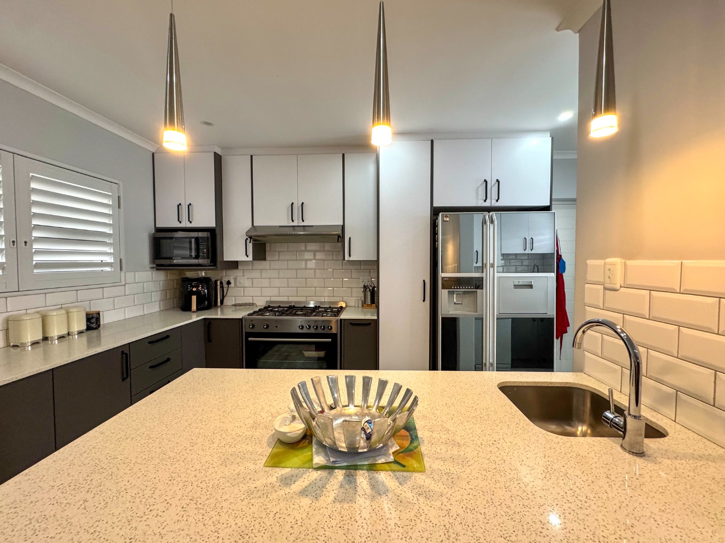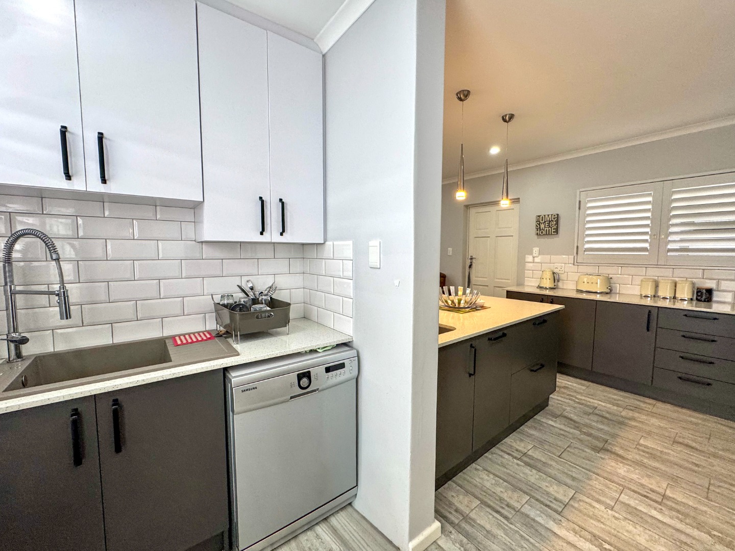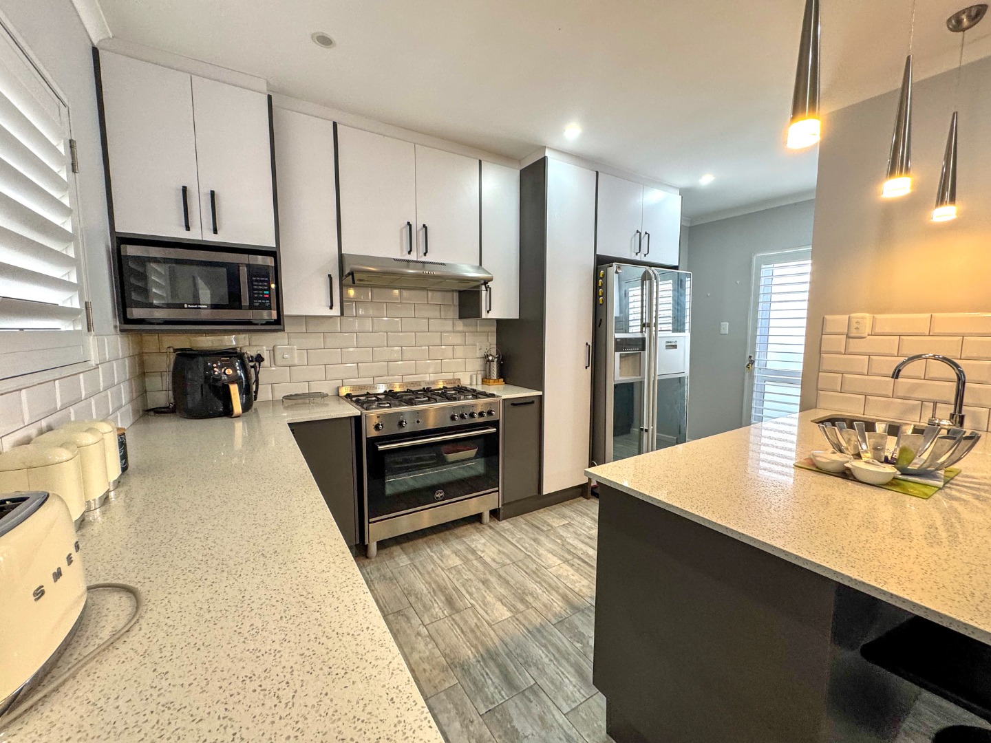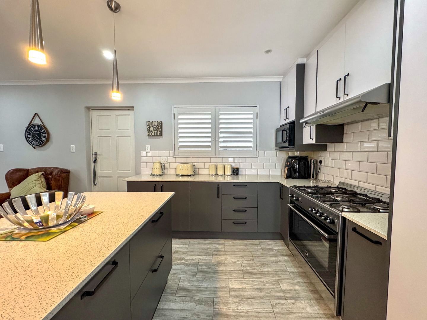 Discover modern living in this inviting 3-bedroom, 3-bathroom residence located within a secure estate in Lorraine, Port Elizabeth. This furnished home offers a contemporary open-plan layout, seamlessly connecting the two spacious lounges, dining area, and a well-appointed kitchen. The interior features stylish wood-look tiled flooring, recessed lighting, and a striking modern metal staircase. The kitchen is equipped with sleek white and dark cabinetry, complemented by a subway tile backsplash, providing a functional and aesthetically pleasing space for culinary activities.