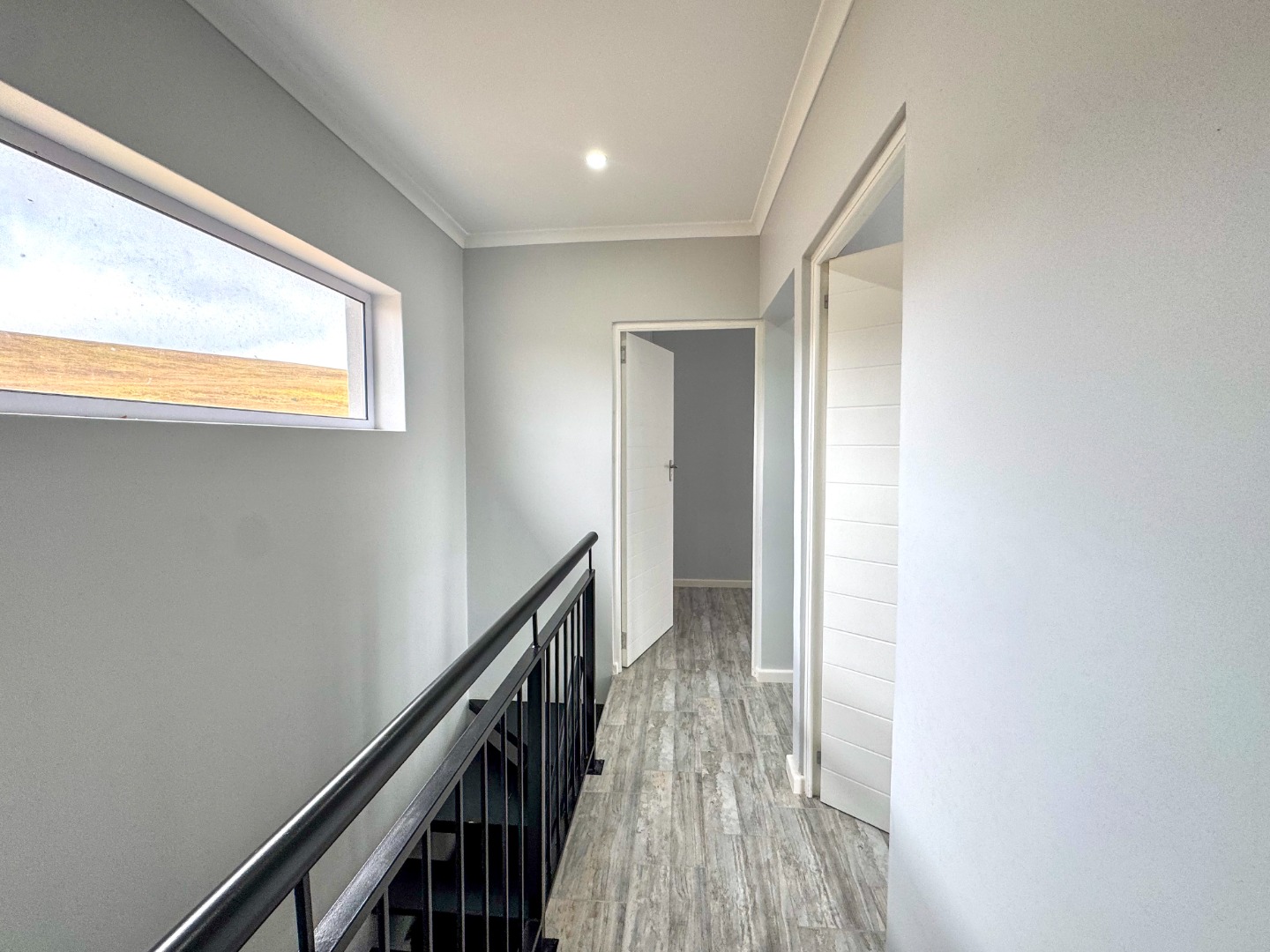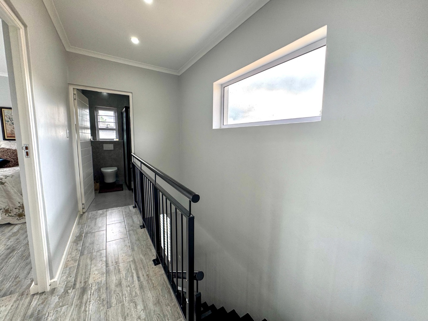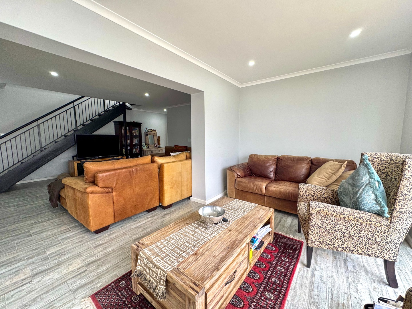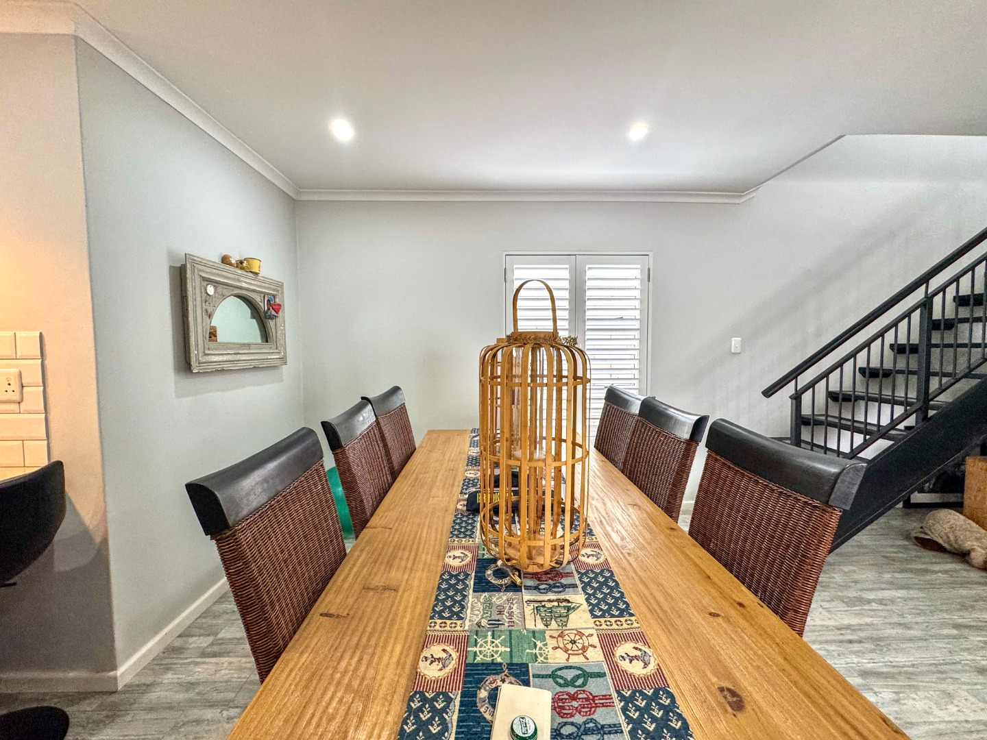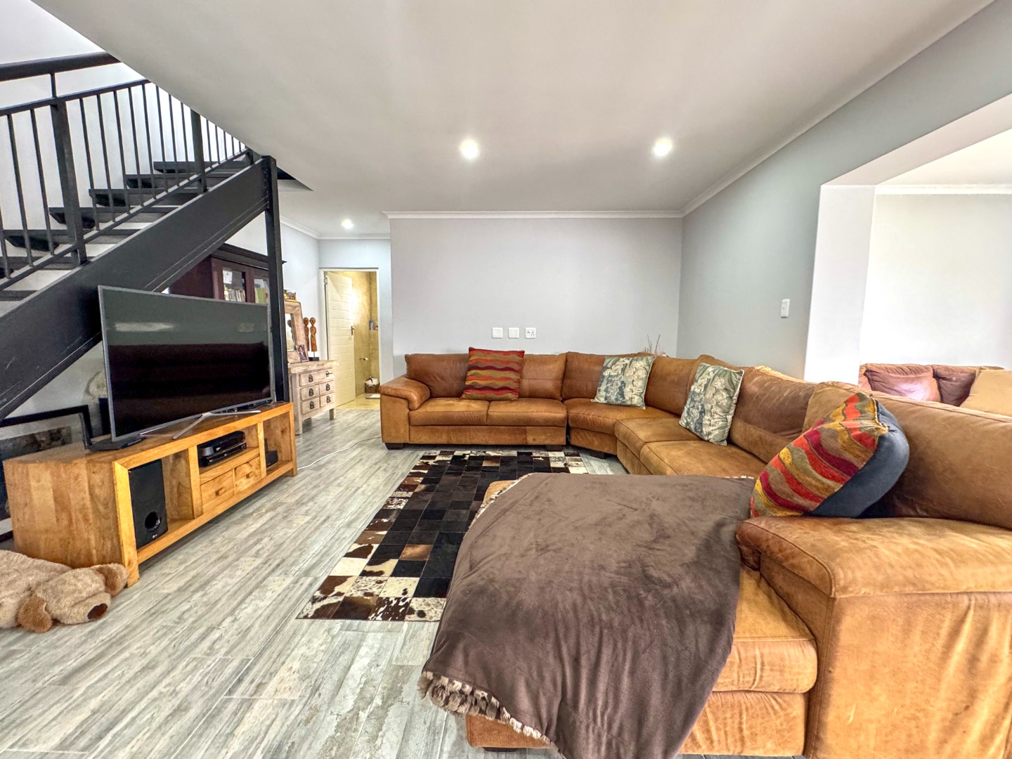 Discover modern living in this inviting 3-bedroom, 3-bathroom residence located within a secure estate in Lorraine, Port Elizabeth. This furnished home offers a contemporary open-plan layout, seamlessly connecting the two spacious lounges, dining area, and a well-appointed kitchen. The interior features stylish wood-look tiled flooring, recessed lighting, and a striking modern metal staircase. The kitchen is equipped with sleek white and dark cabinetry, complemented by a subway tile backsplash, providing a functional and aesthetically pleasing space for culinary activities.