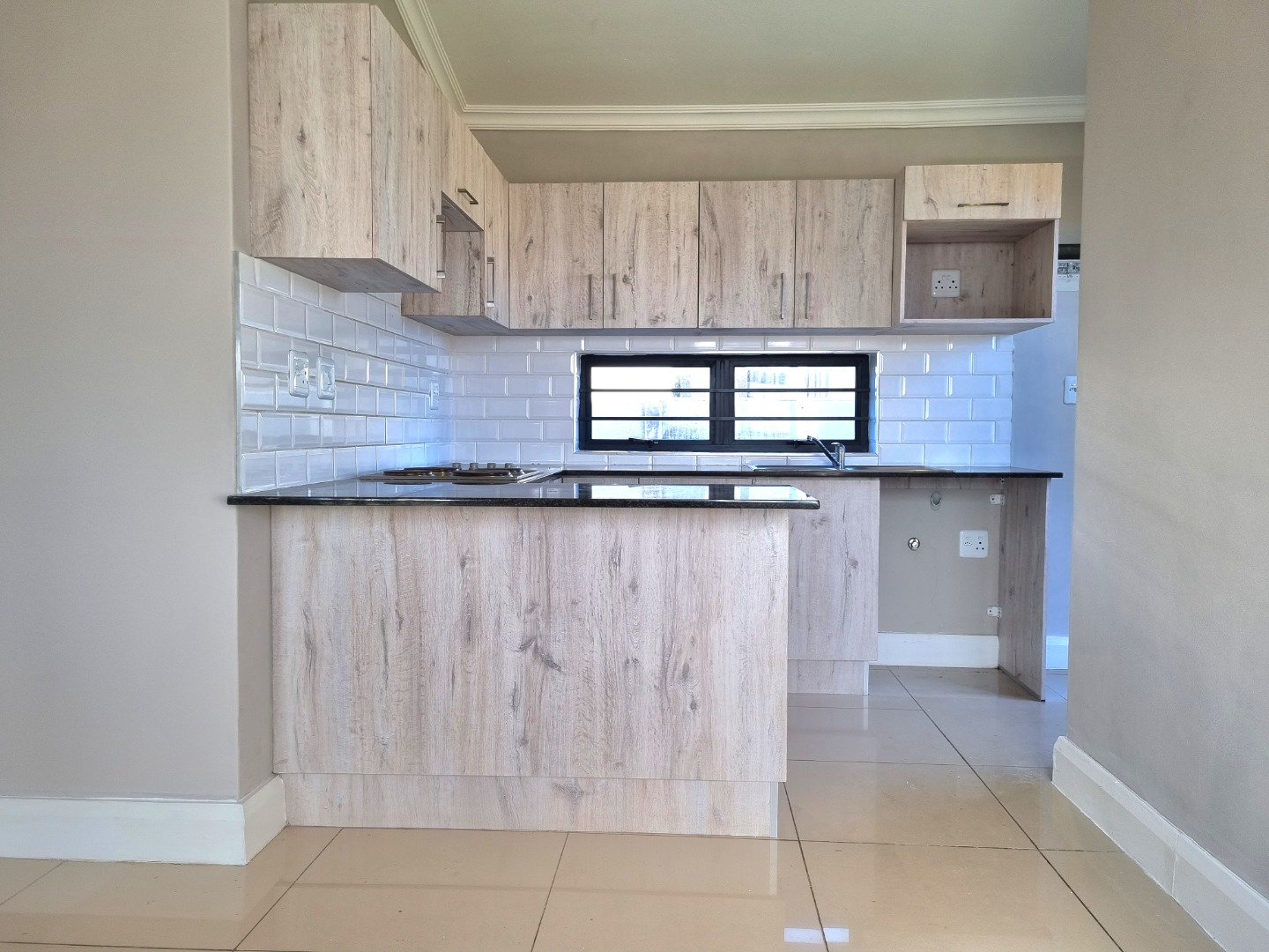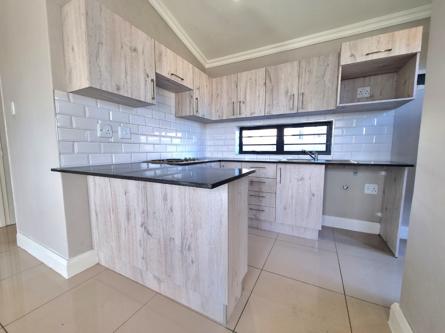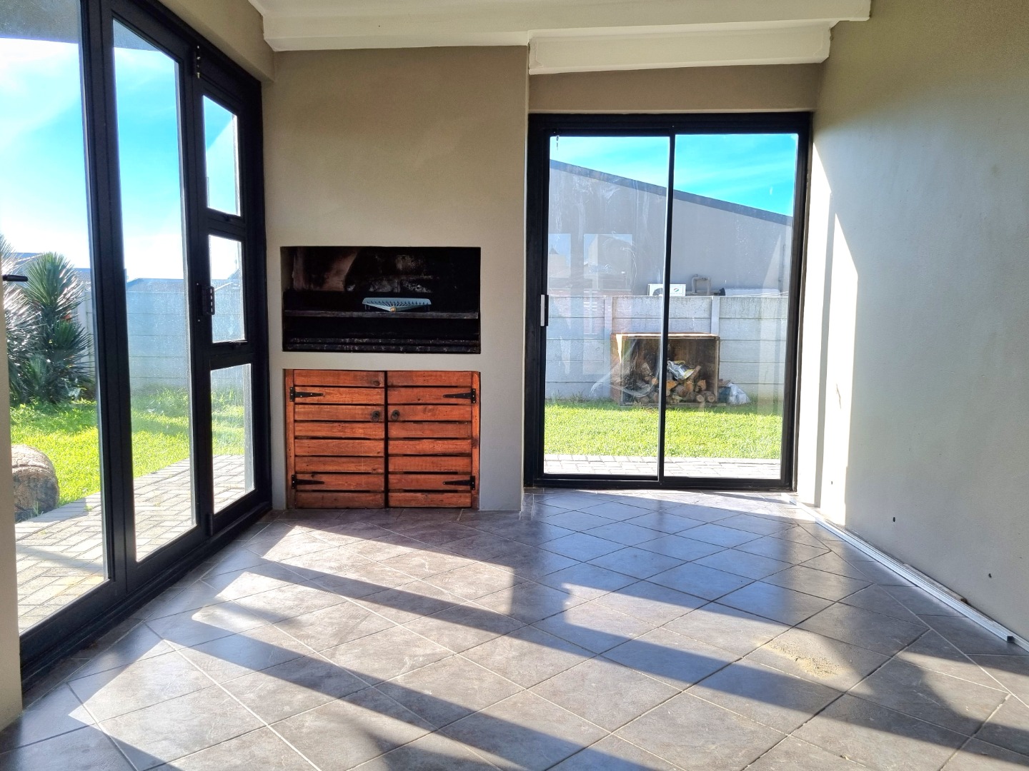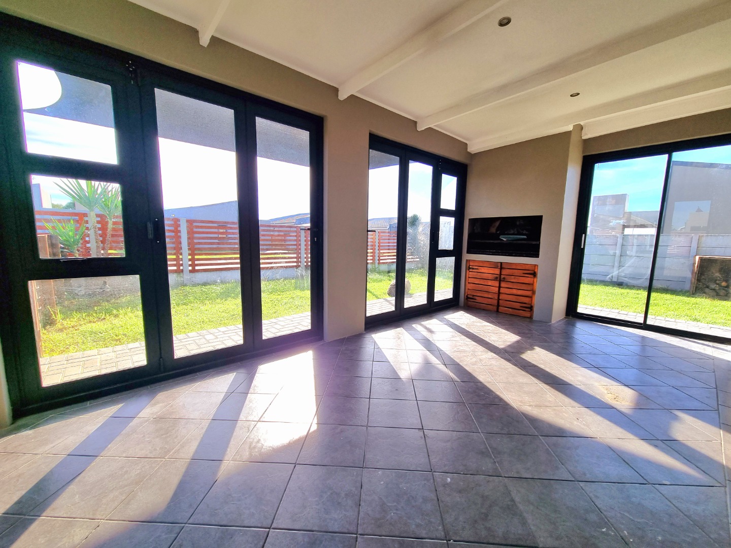 Open plan fitted kitchen leading onto Lounge and built in braai area