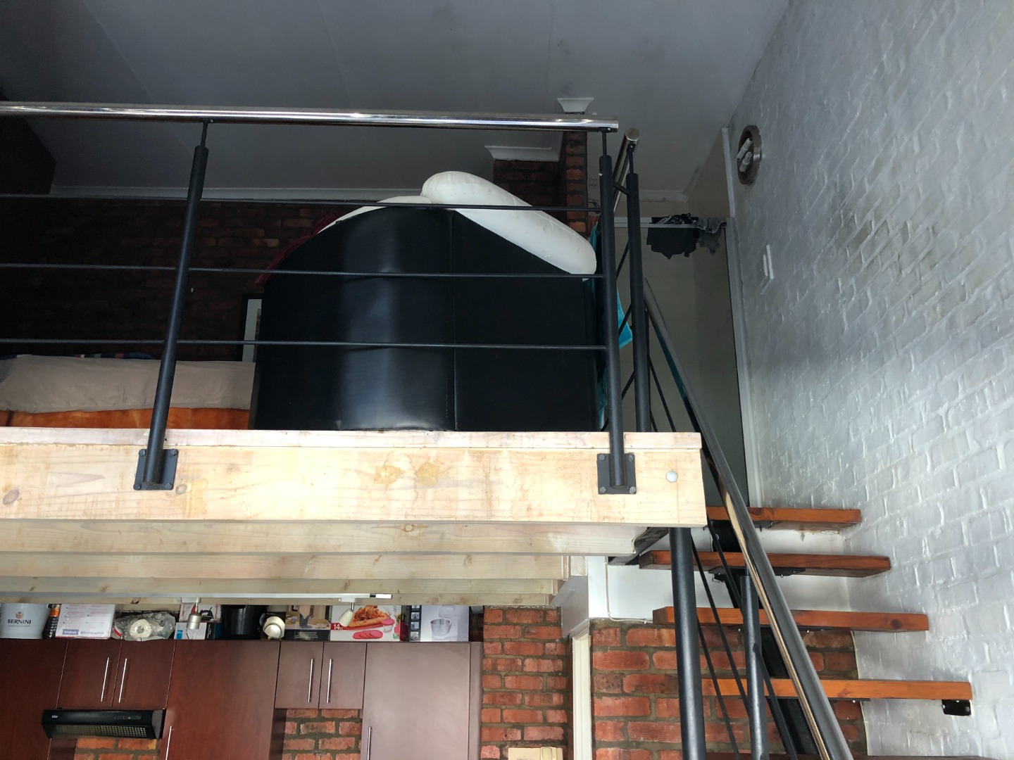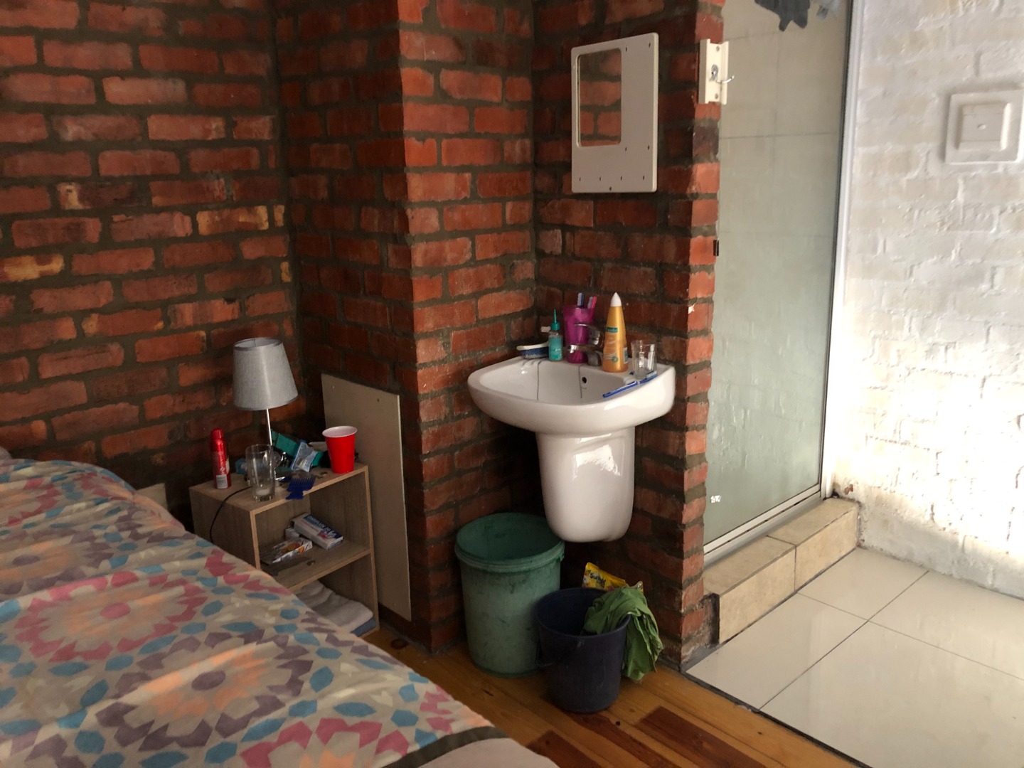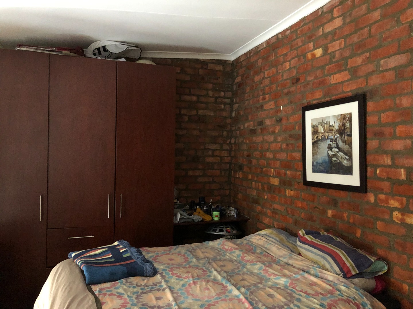 Upstairs bedroom with cupboards and adjoining shower.