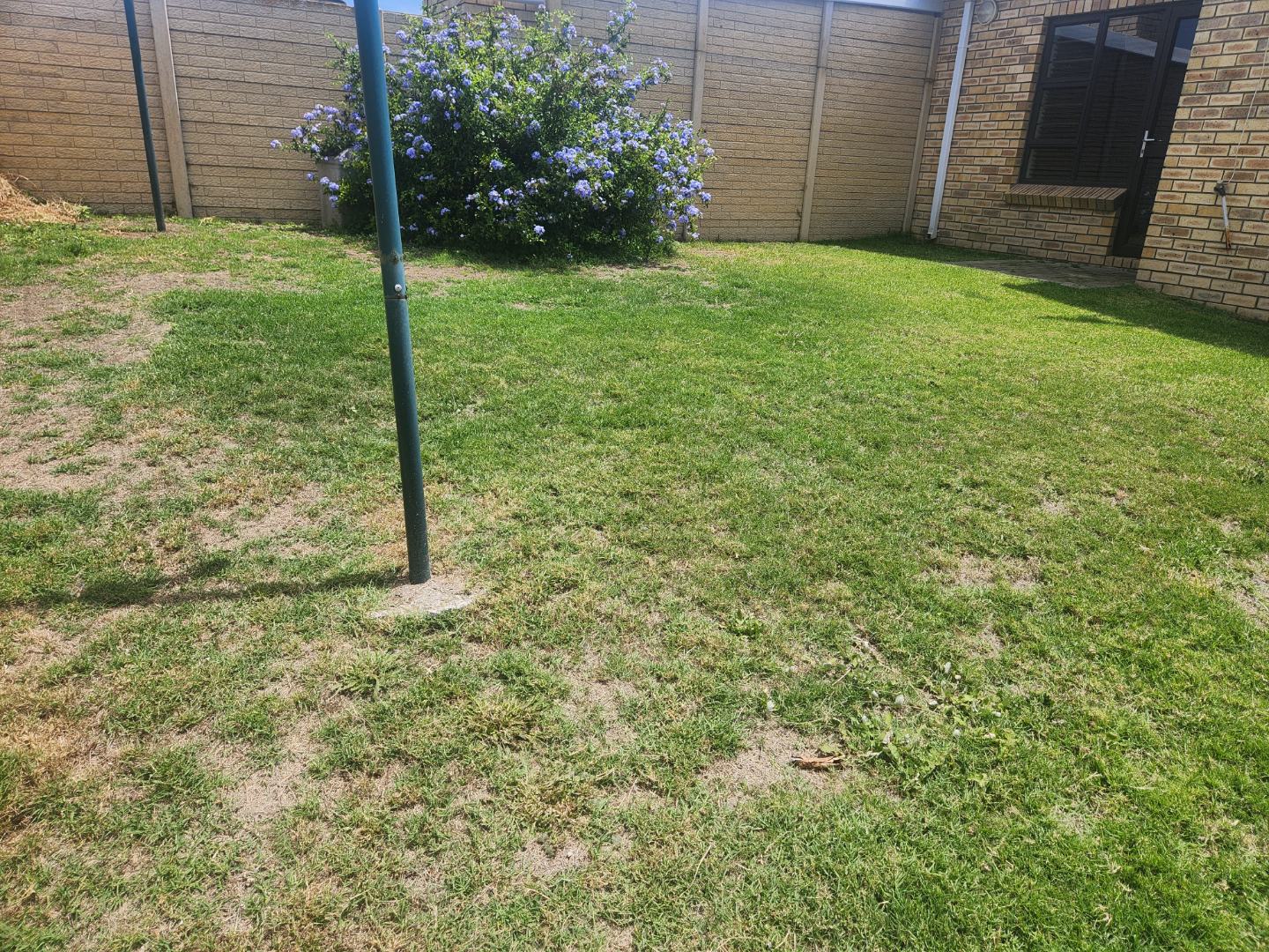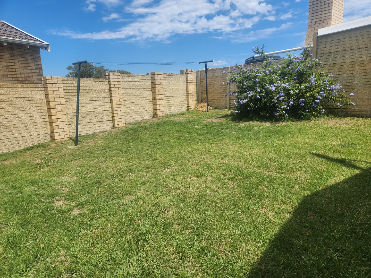 The exterior boasts a low-maintenance brick facade and a tiled roof, ensuring durability. Enjoy a private, fenced garden area with a paved section, ideal for relaxation. Practical outdoor features include a side access gate, a security gate on the front door, and functional clothesline poles. The property provides two dedicated open parking spaces, adding to the convenience for residents.