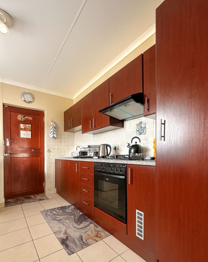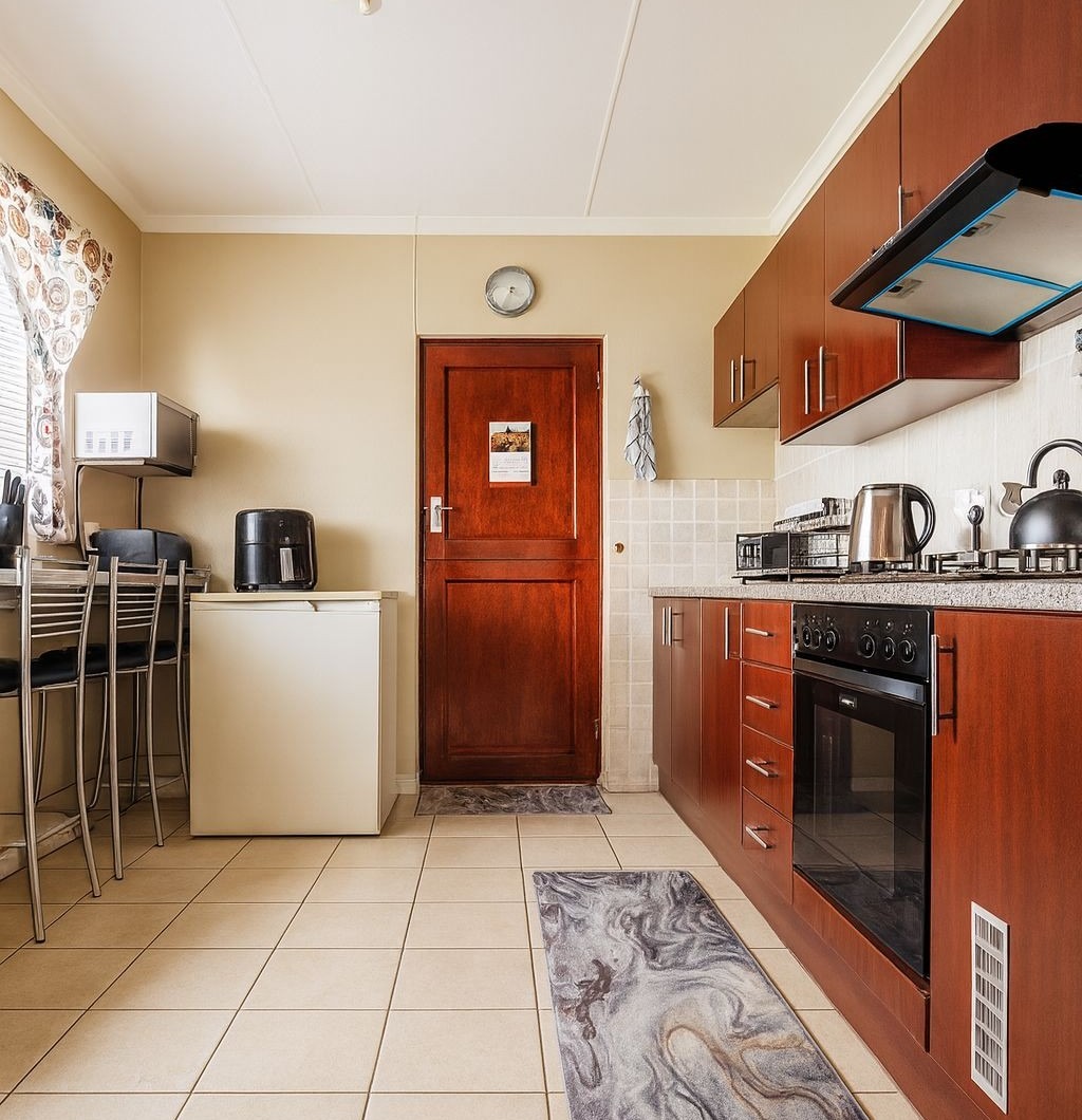 The kitchen comes equipped with a gas stove and bottle, while the automated single garage includes washing machine fittings and a wasbak (utility basin) for convenience.