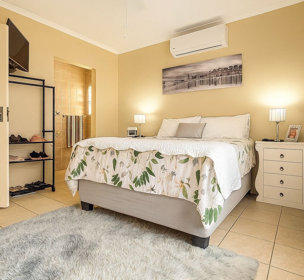 The main bedroom features an en-suite bathroom and a built-in air-conditioner, providing year-round comfort. The guest bedroom additional bedrooms are spacious — approximately 20 sqm each — with plenty of natural light and ample storage space.