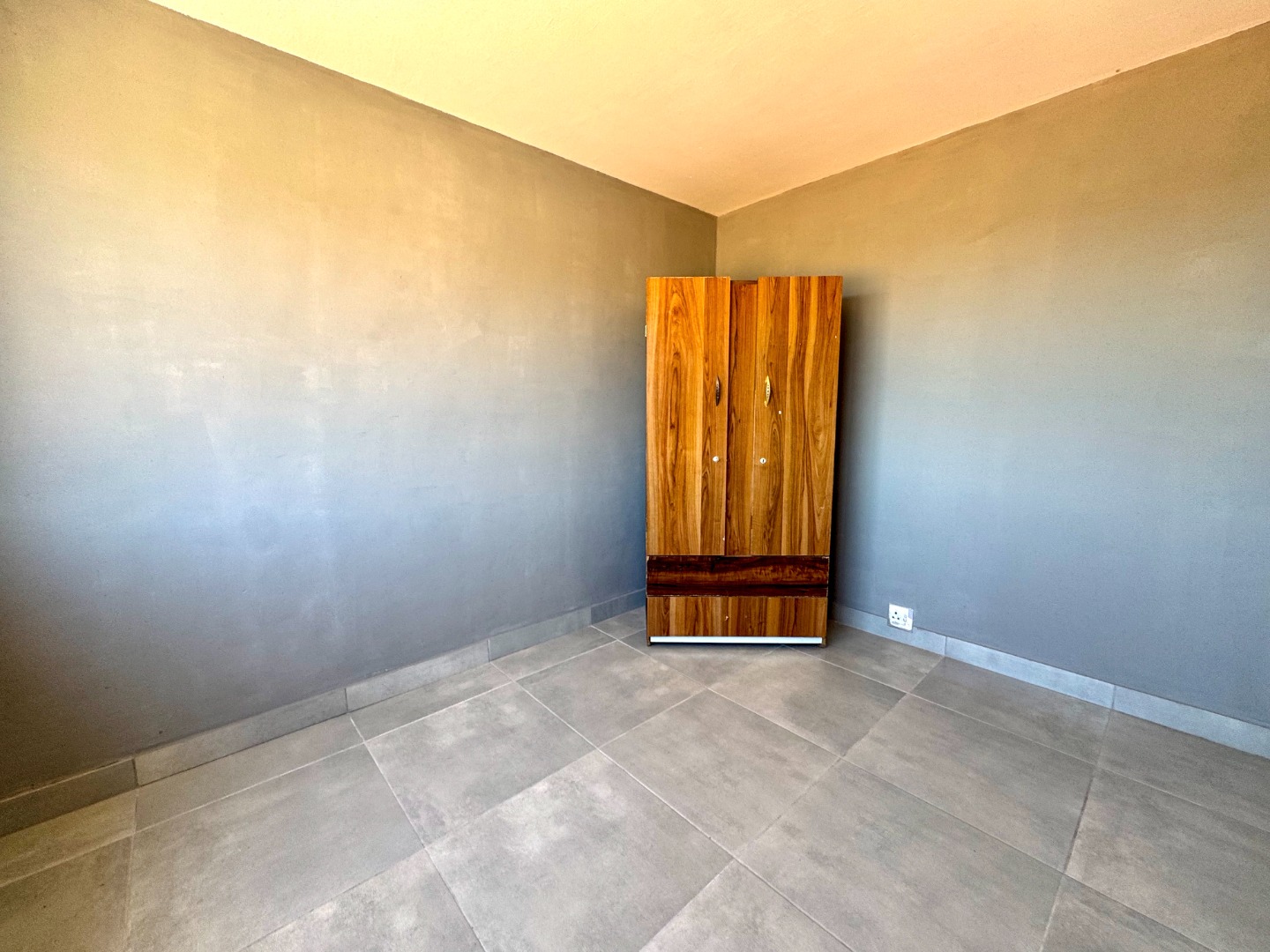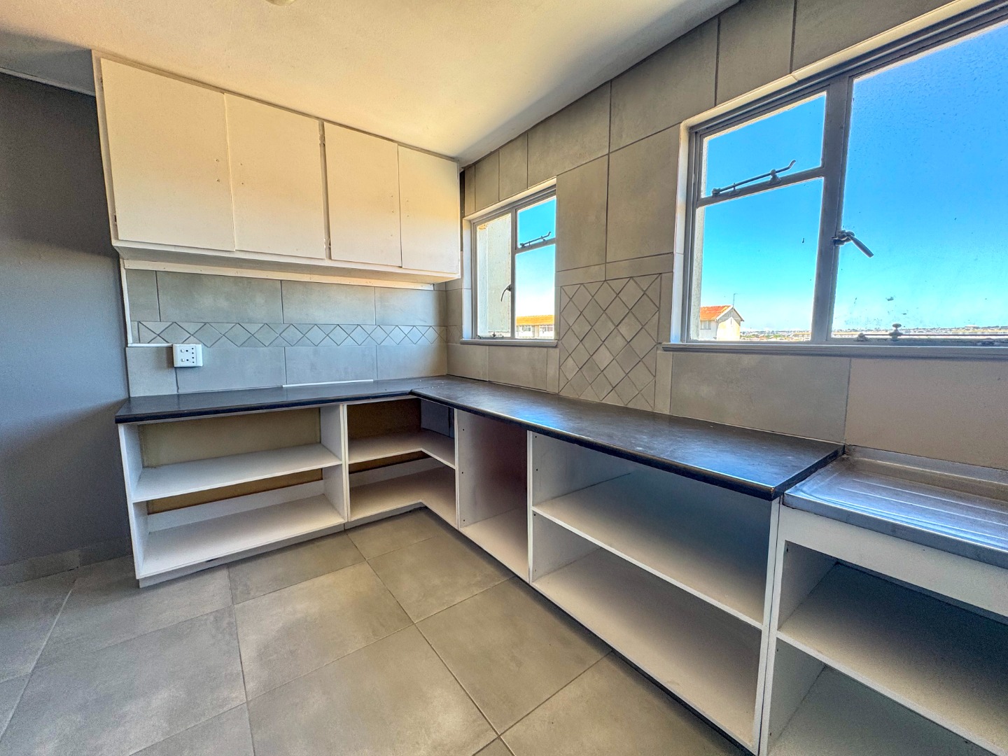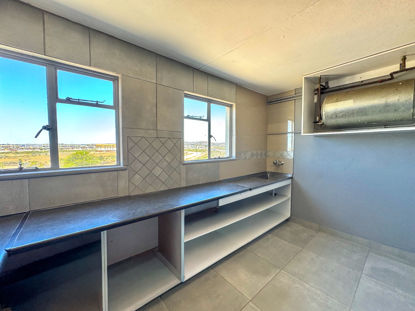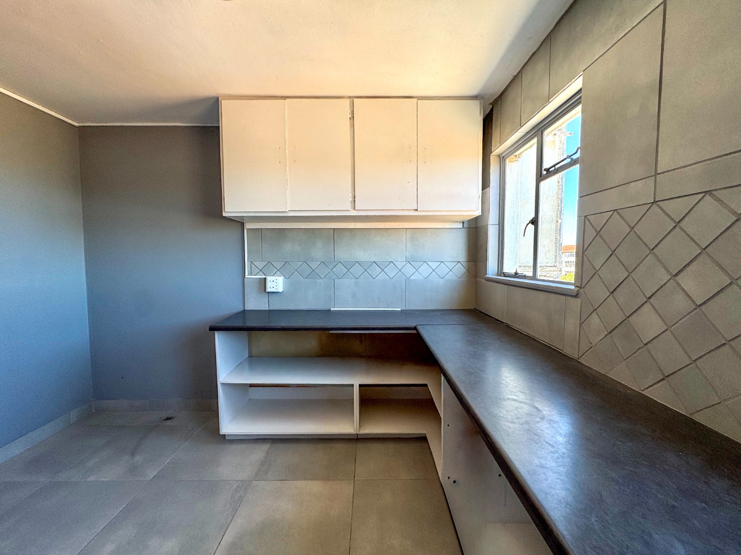 The neatly tiled kitchen offers ample cupboard space, cupboard doors to be fitted by seller, adding a fresh finish.