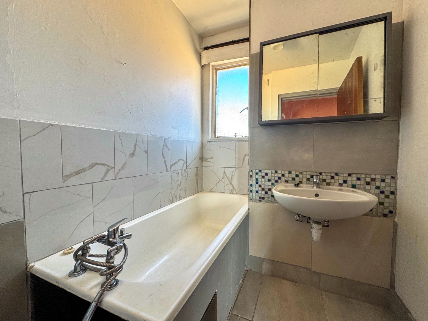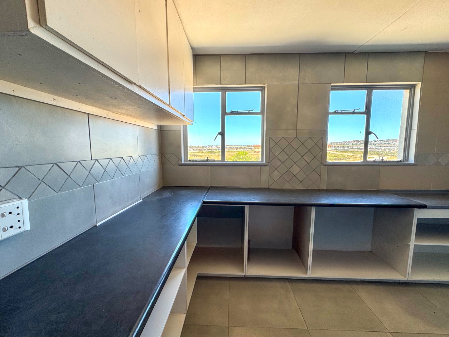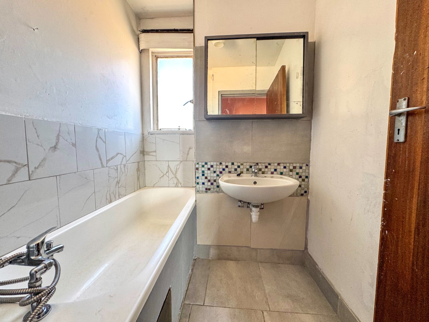 The neatly tiled kitchen offers ample cupboard space, cupboard doors to be fitted by seller, adding a fresh finish.