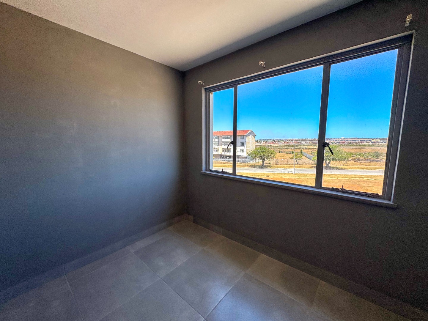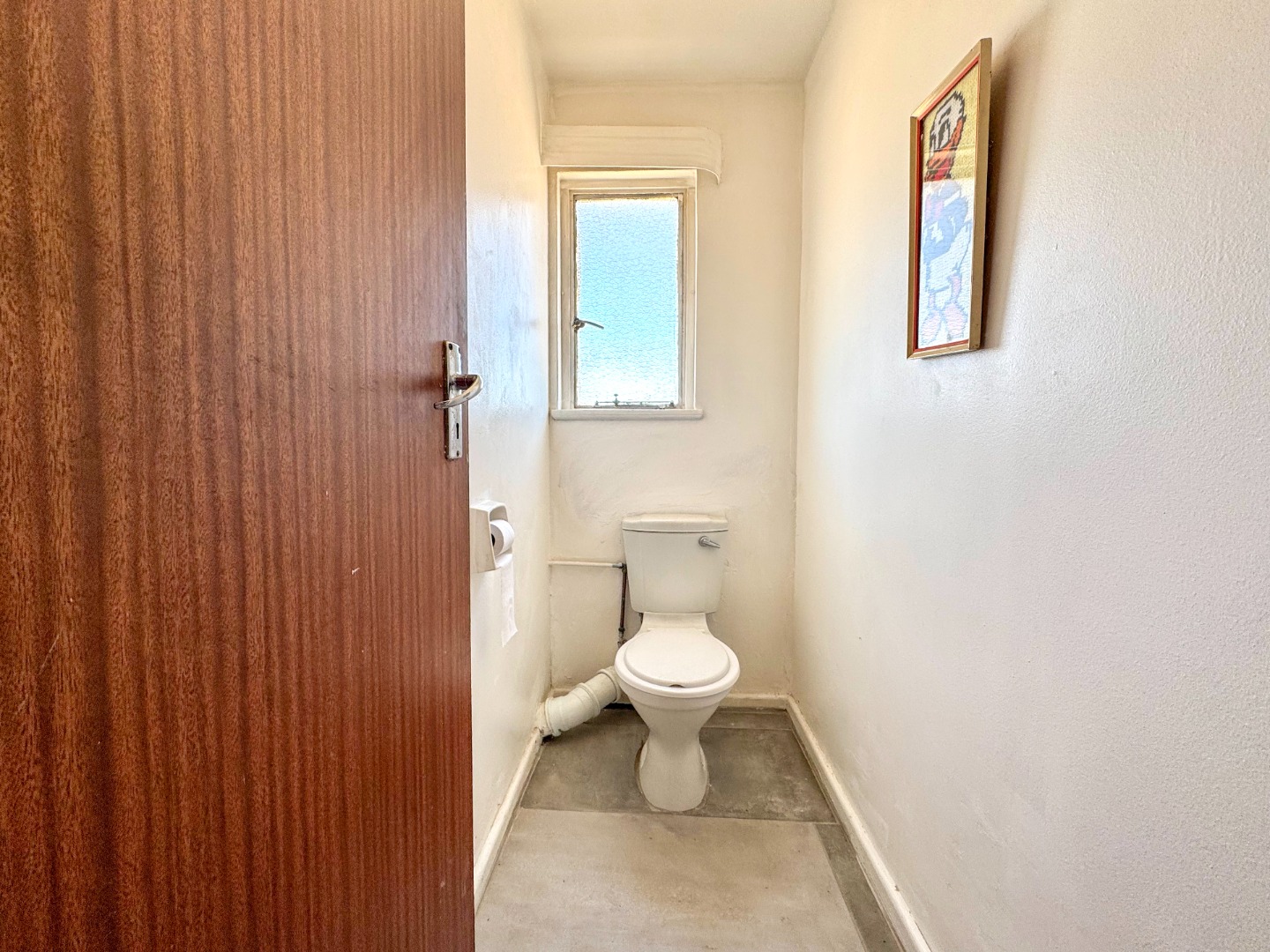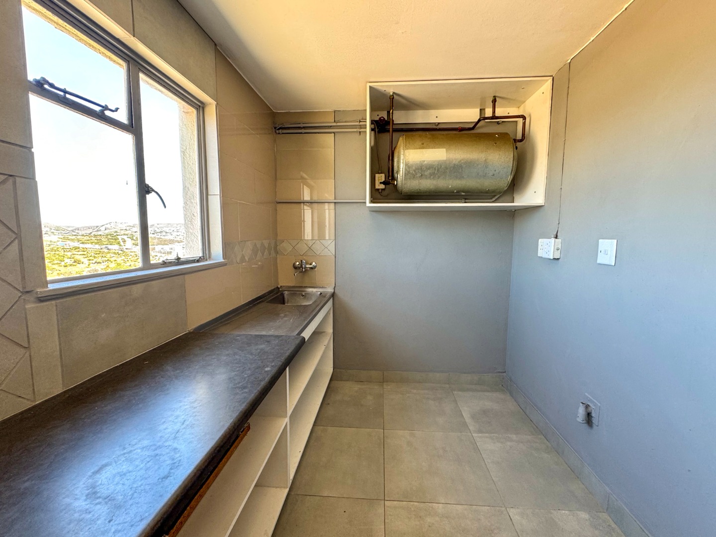 The neatly tiled kitchen offers ample cupboard space, cupboard doors to be fitted by seller, adding a fresh finish.