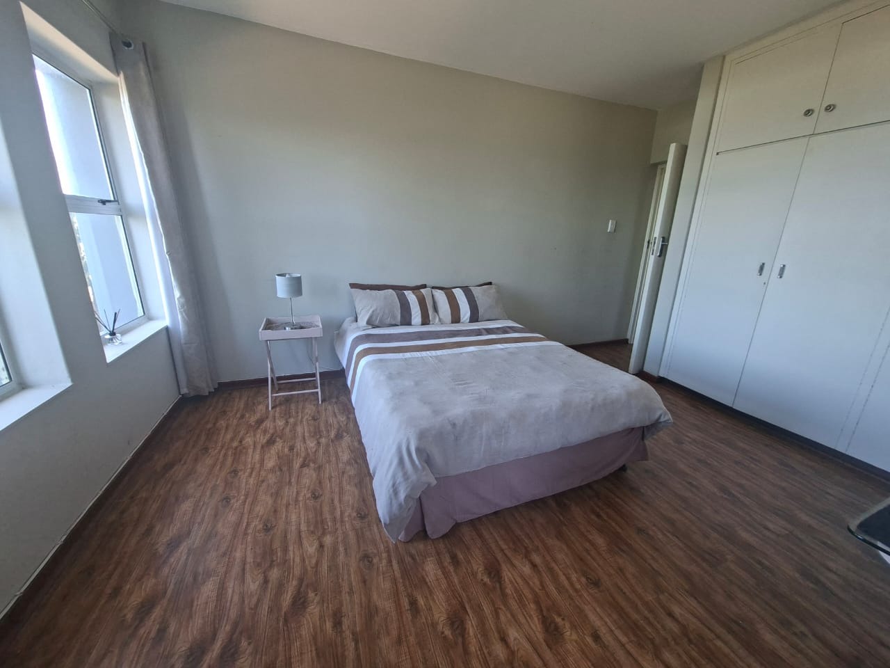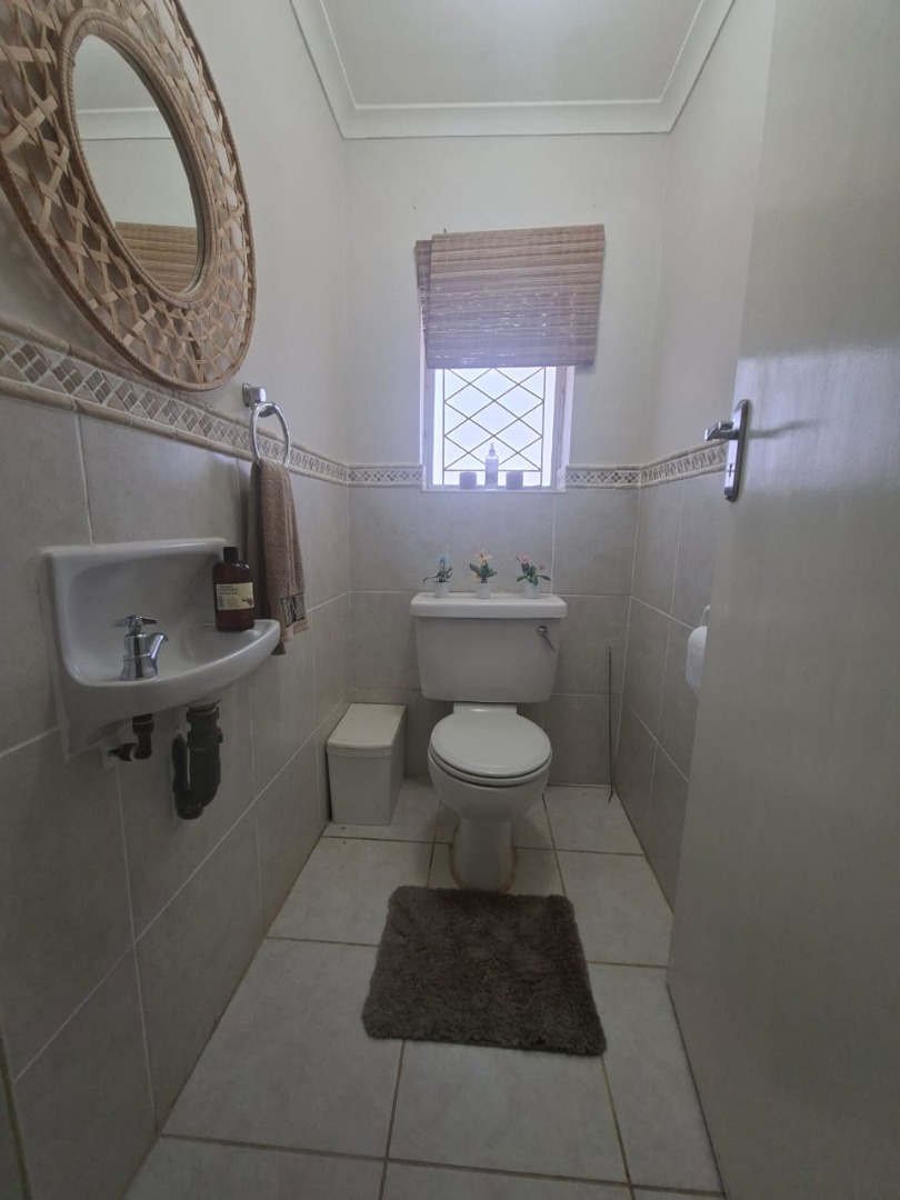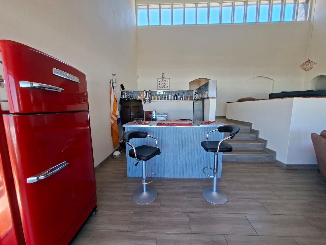 As you ascend the elegant spiral staircase, you’ll be greeted by a bright dining room leading to a fully equipped kitchen. The upper level boasts a luxurious main bedroom with an ensuite bathroom and ample cupboard space, plus a cozy study area that leads to a second bedroom.