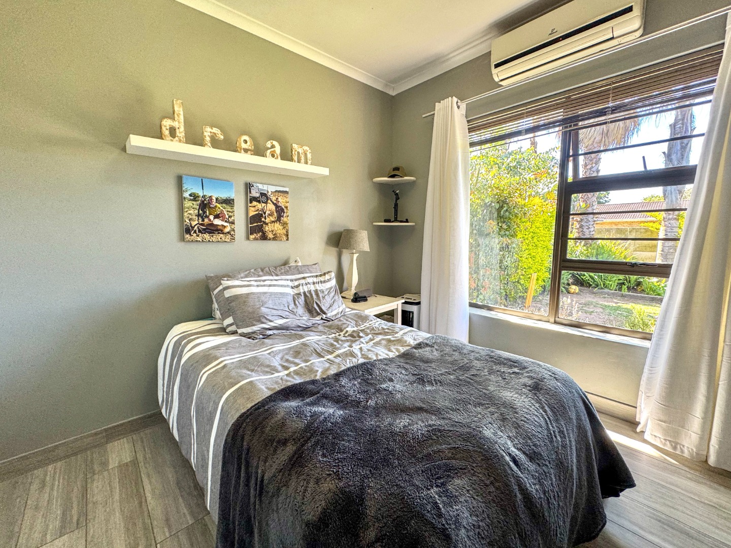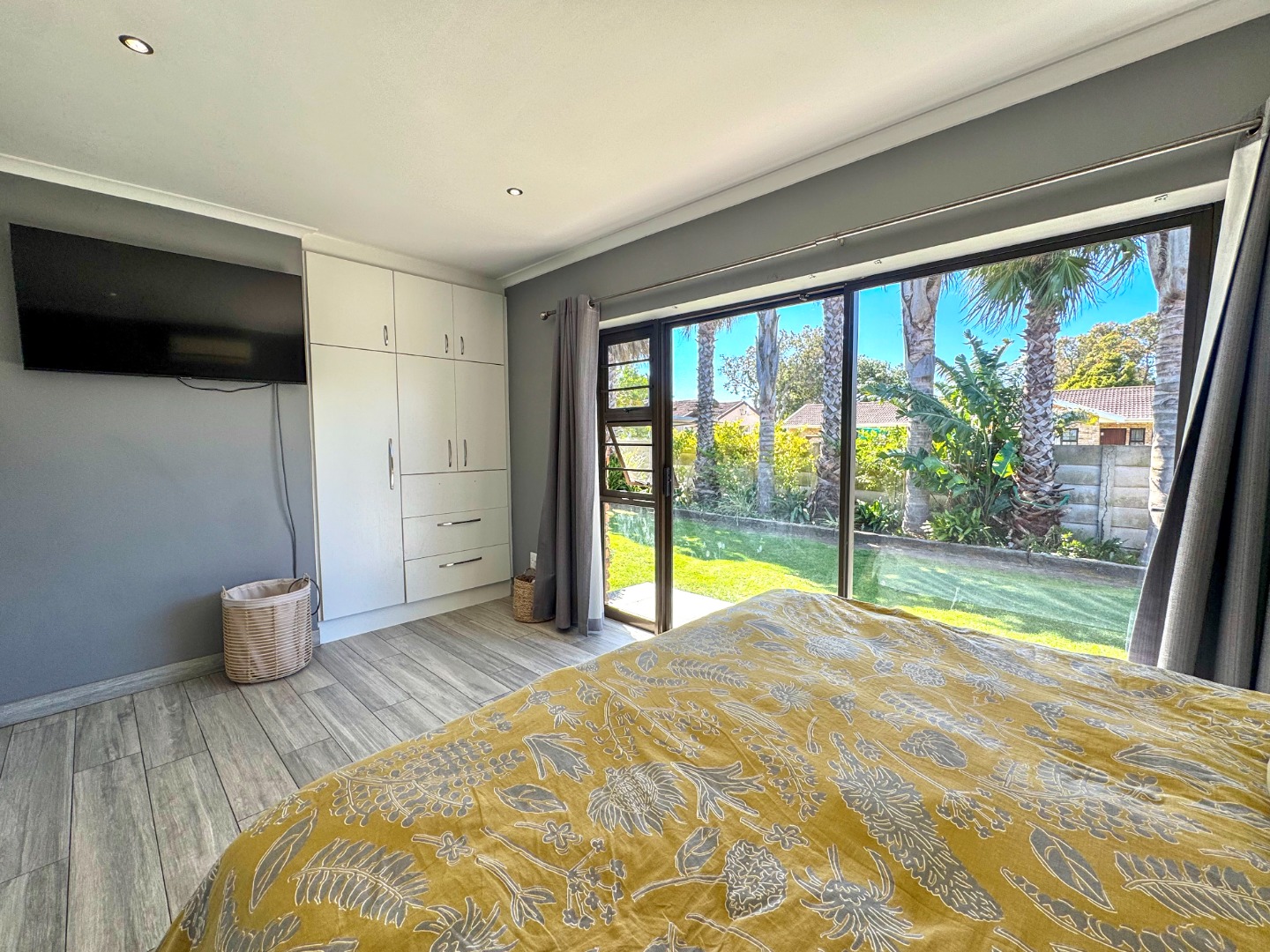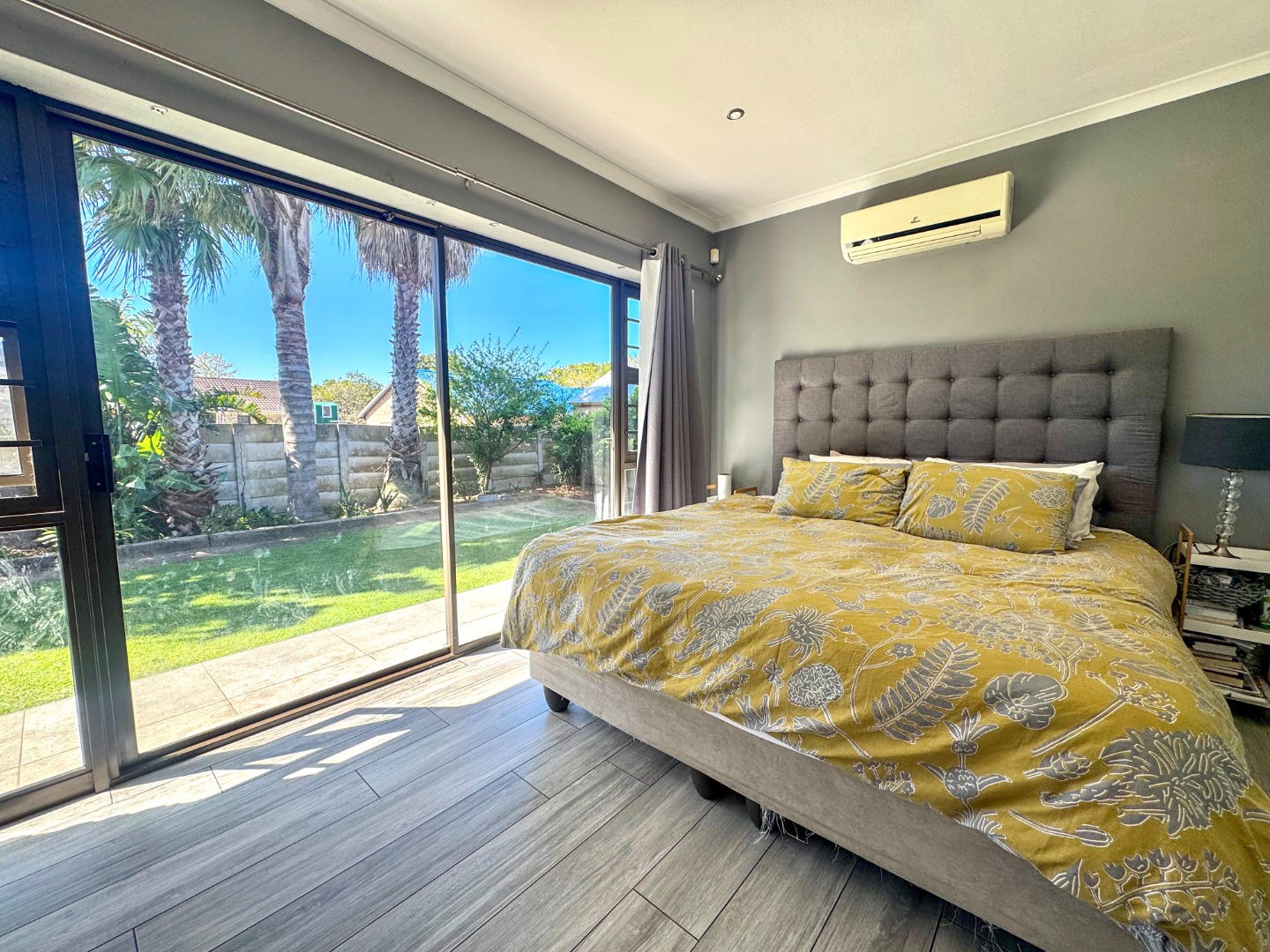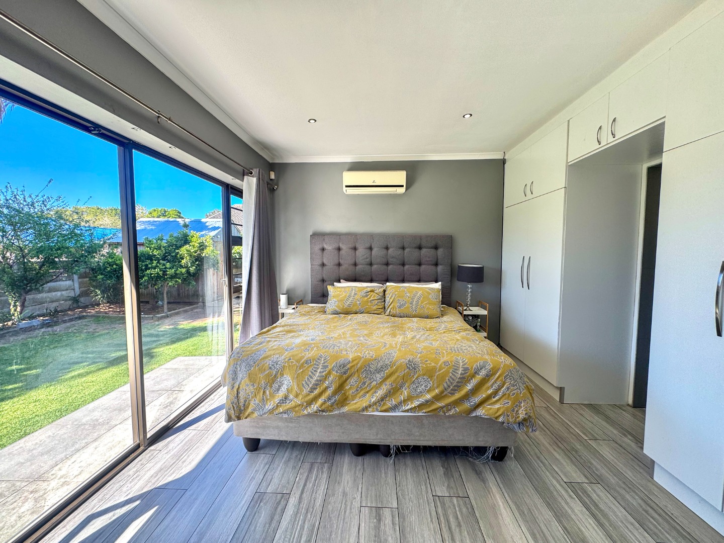 Accommodation comprises five well-proportioned bedrooms, including one en-suite bathroom, alongside a second full bathroom. The bedrooms are bright, featuring modern wood-look tiled flooring and built-in wardrobes, with air conditioning units ensuring comfort during warmer months. Large sliding glass doors in some bedrooms offer direct access to the private garden, blending indoor and outdoor living seamlessly.