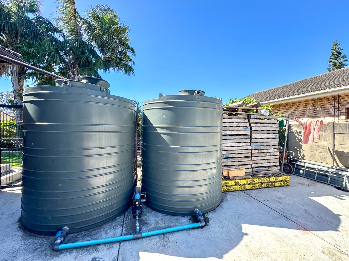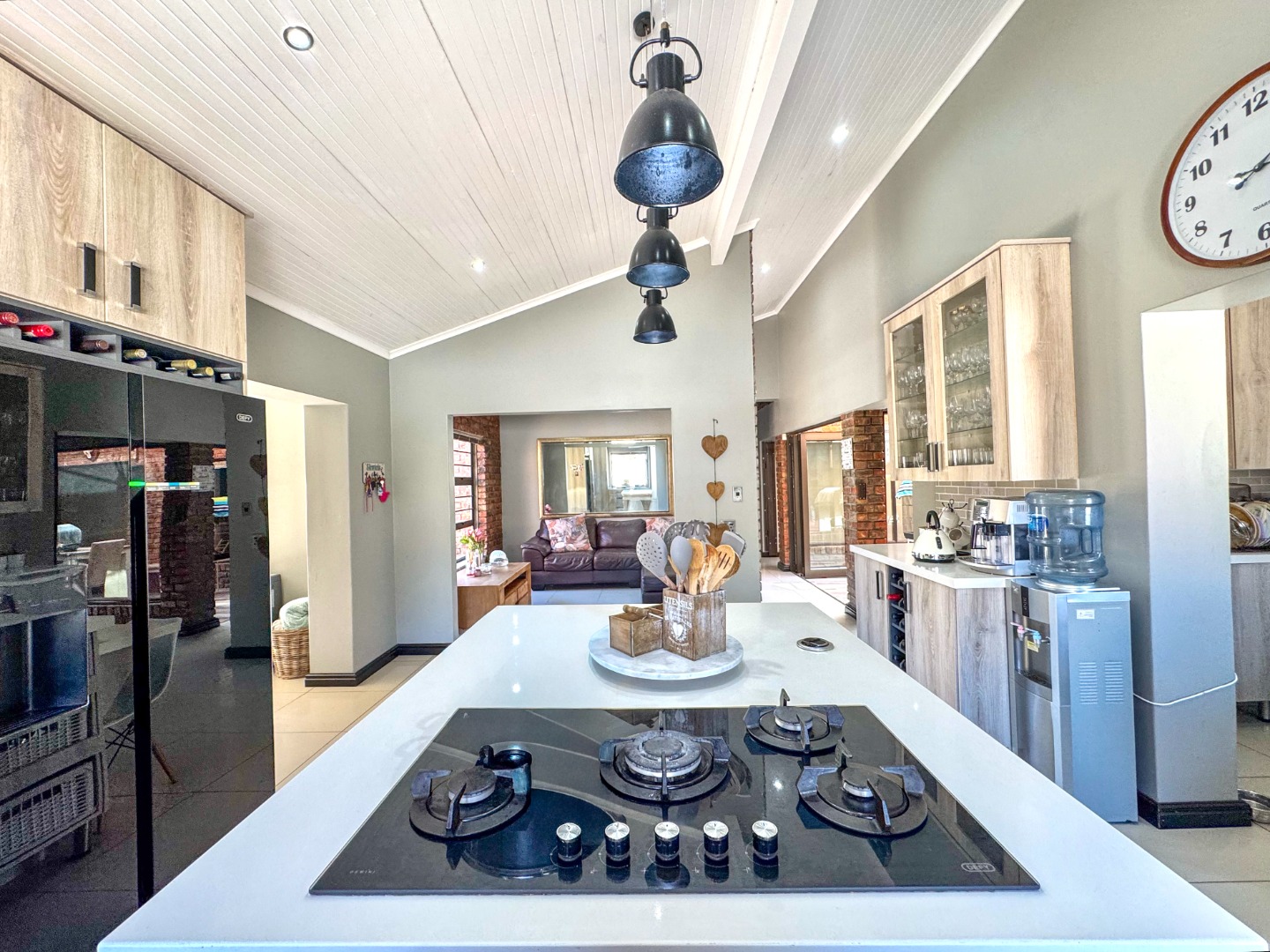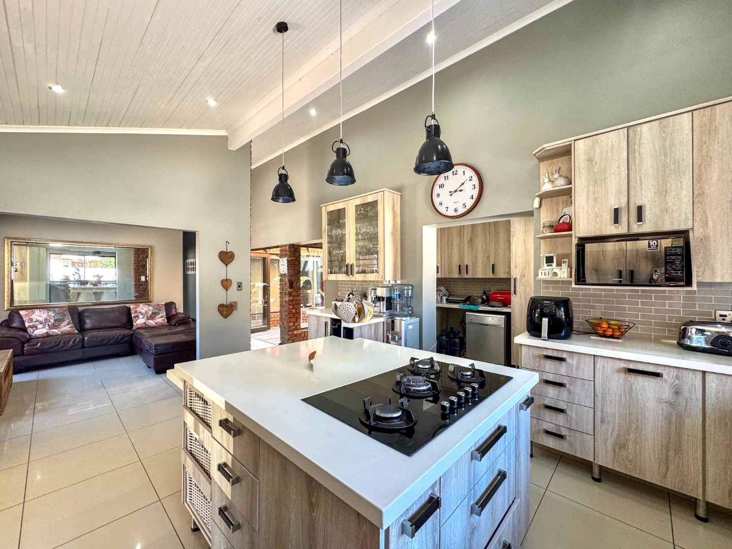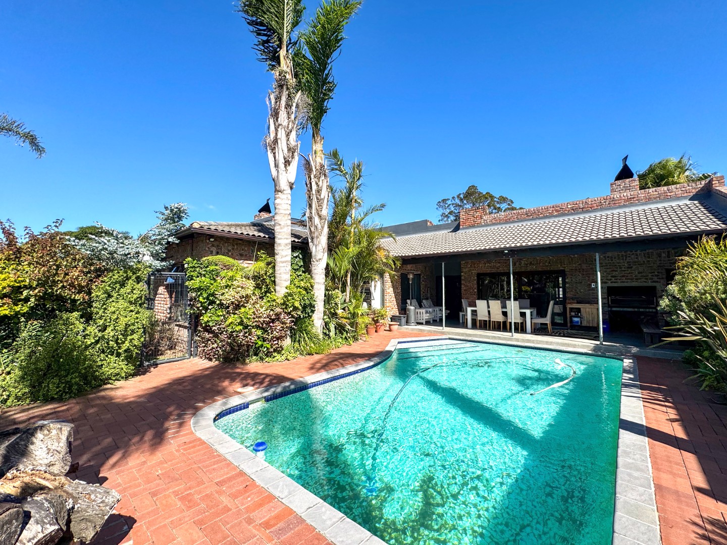The outdoor spaces are equally appealing, designed for leisure and practicality. Enjoy sunny days by the private swimming pool or entertain guests on the patio with a built-in braai. The established garden, complete with a wendy house and water tanks, provides a serene backdrop. Practicality is further enhanced by three garages, offering secure parking and additional storage, alongside a covered carport suitable for a caravan or trailer.