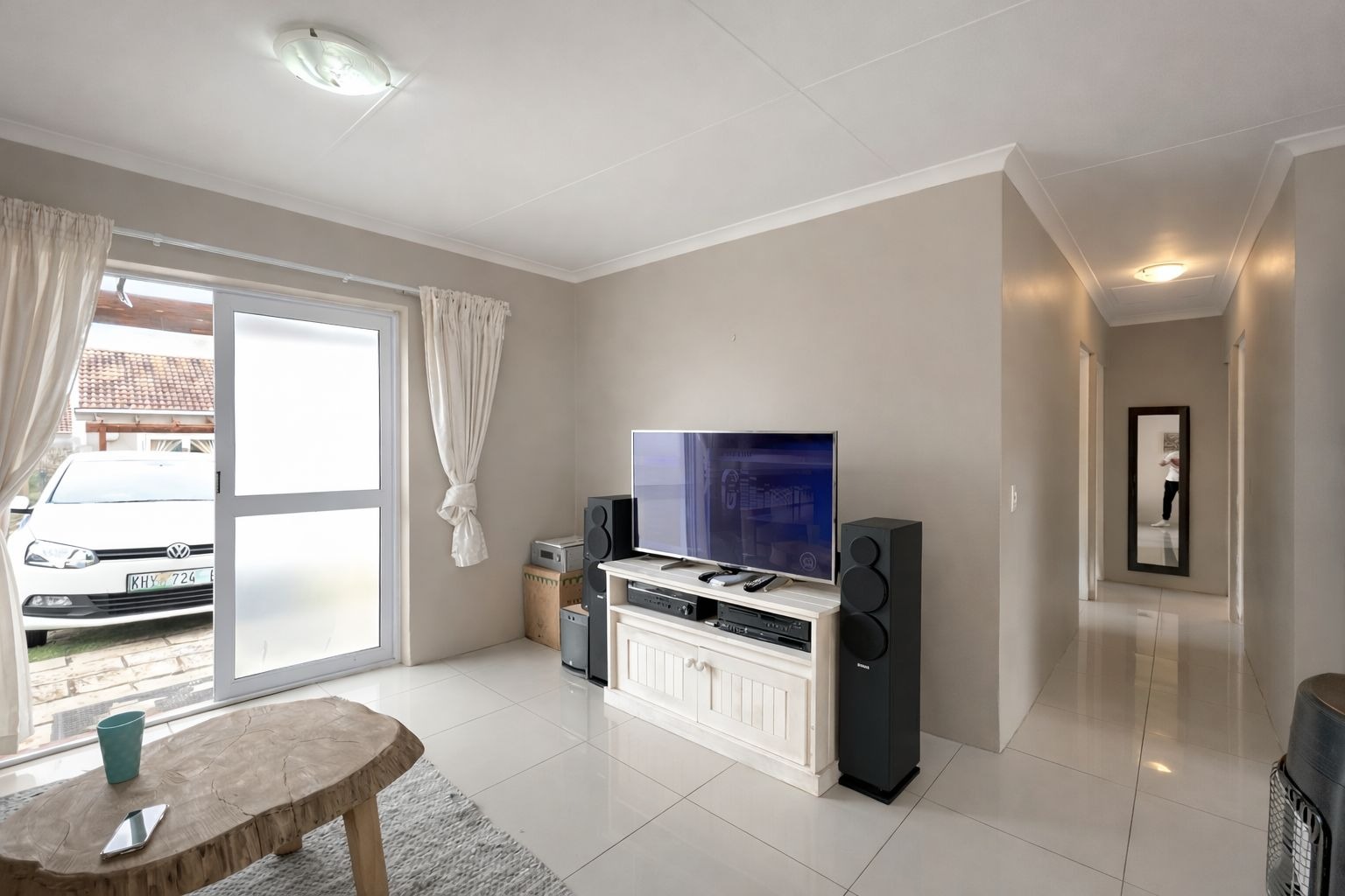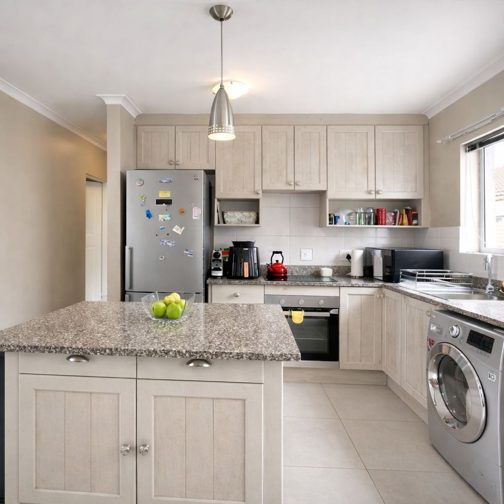 The open-plan lounge and dining area flows seamlessly into the kitchen, creating a welcoming space for both everyday living and entertaining. From the living area, doors lead out to a private, fully walled garden — perfect for relaxing, kids, or pets.