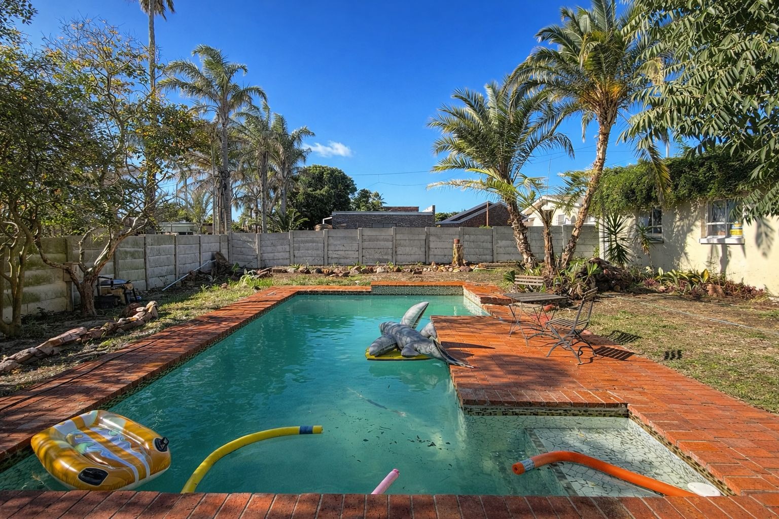 Step outside to a large backyard featuring a swimming pool, with additional access to the garage.